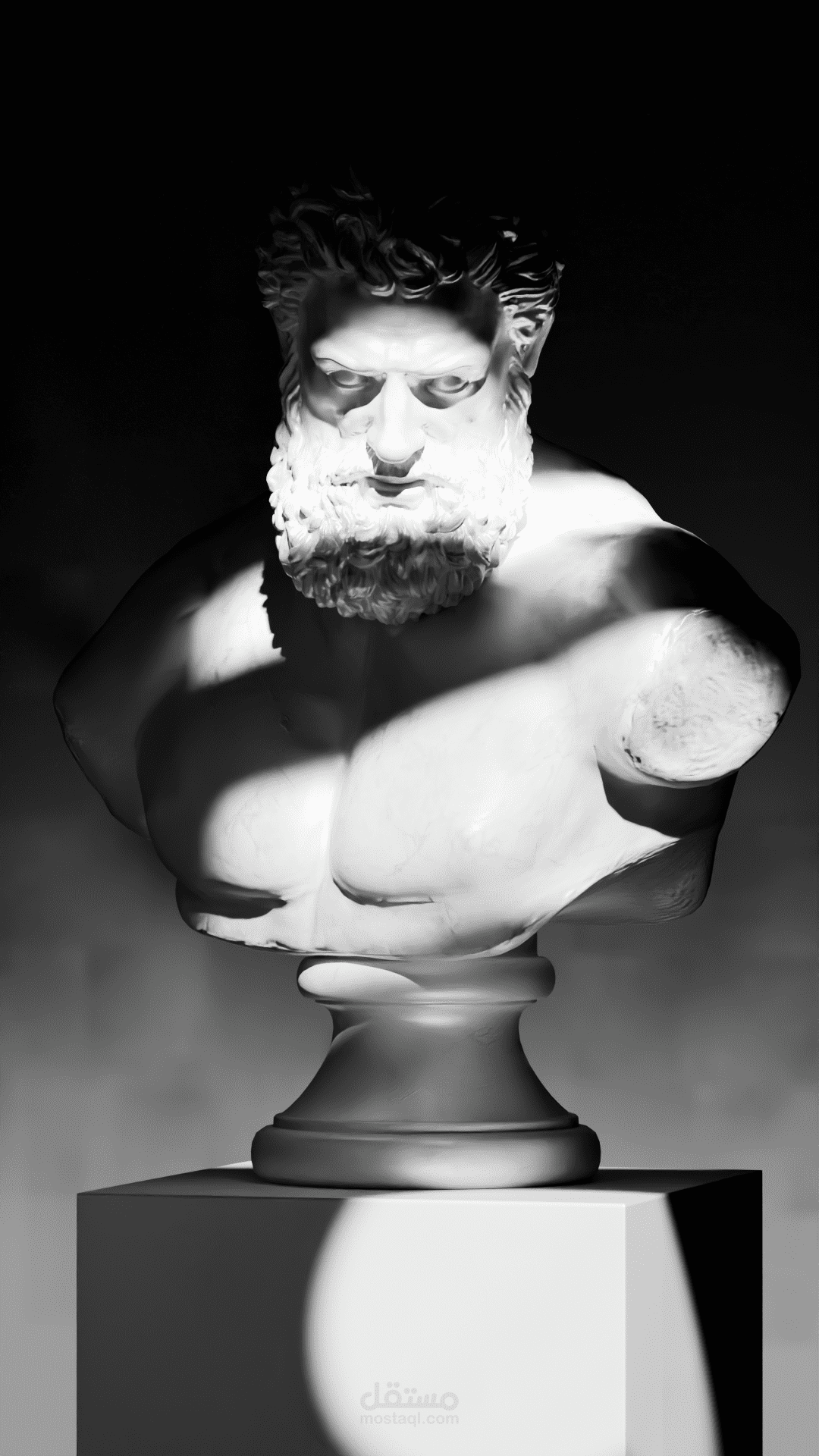 اعتمدت في هذا التصميم بشكل أساسي على الإضاءة كعنصر فني رئيسي لإبراز قوة المجسم وعمقه البصري. استخدمت إضاءة درامية عالية التباين (High Contrast Lighting) لتسليط الضوء على تفاصيل الوجه، الشعر، وملمس الخامة، مع توظيف الظلال بشكل مدروس لإعطاء إحساس بالقوة والغموض والطابع السينمائي. تم ضبط زوايا الإضاءة بعناية لإظهار أدق التفاصيل النحتية ومنح العمل مظهرًا واقعيًا وفخمًا يعكس الطابع الكلاسيكي للتمثال.