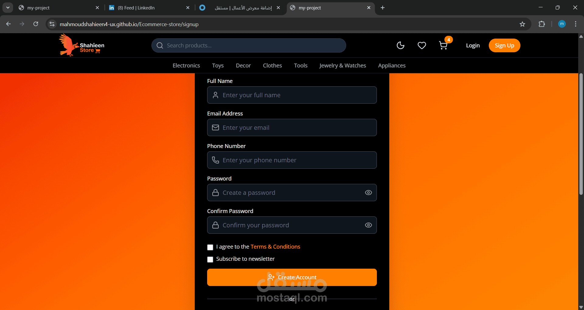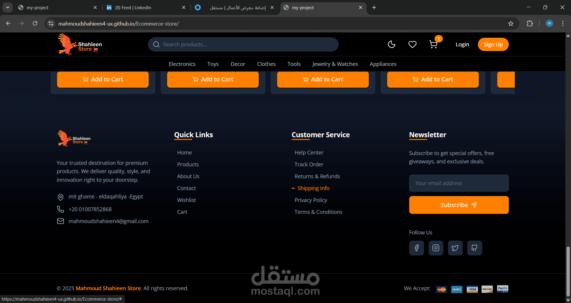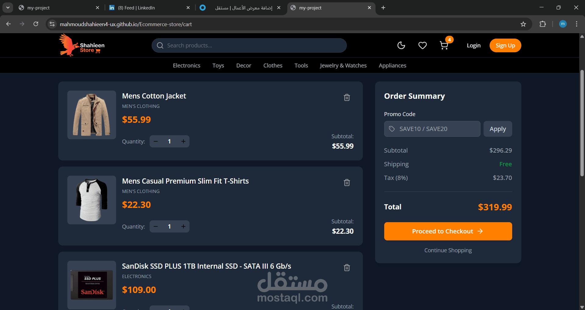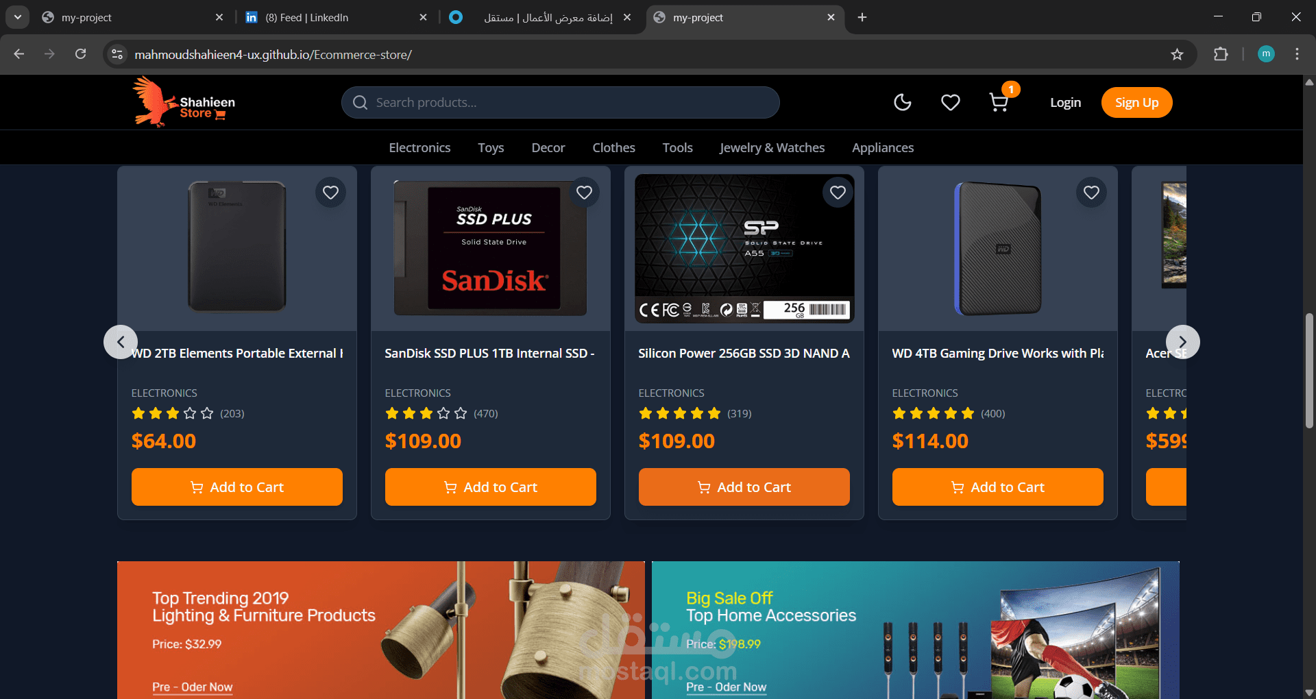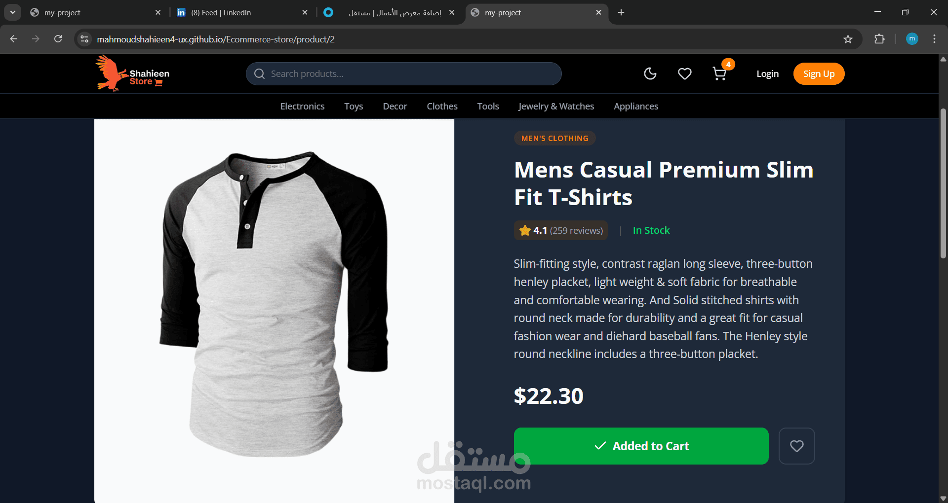 مشروع ecommerce كامل باستخدام react and tailwind مشروع متجاوب وعصري موجود به ميزات الاضافه الي السله والوضع الداكن وتسجبل الدخول وعرضه العناصر المفضله والموجوده بالسله