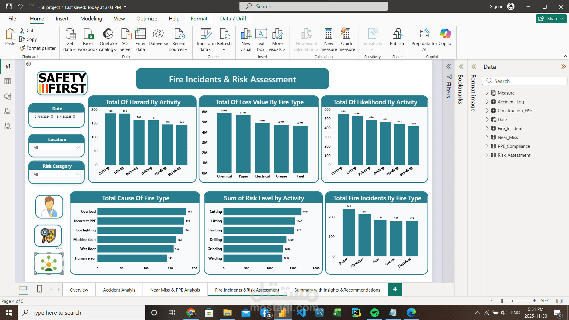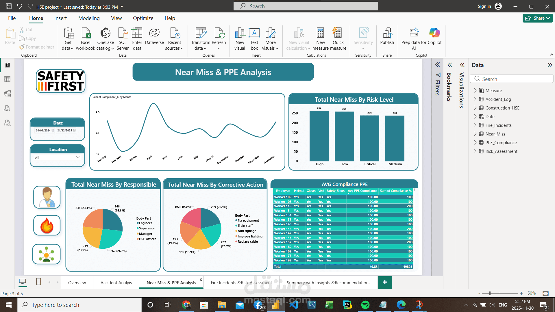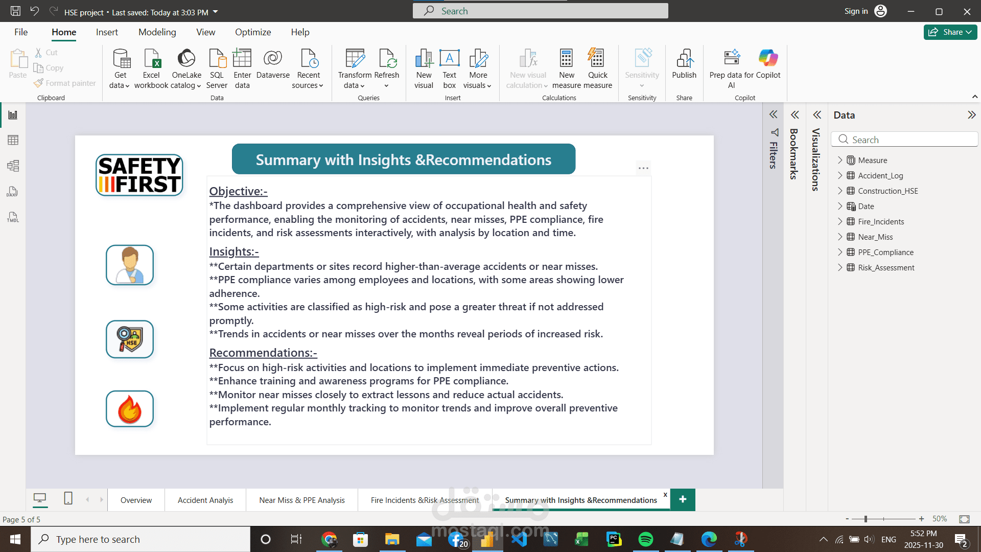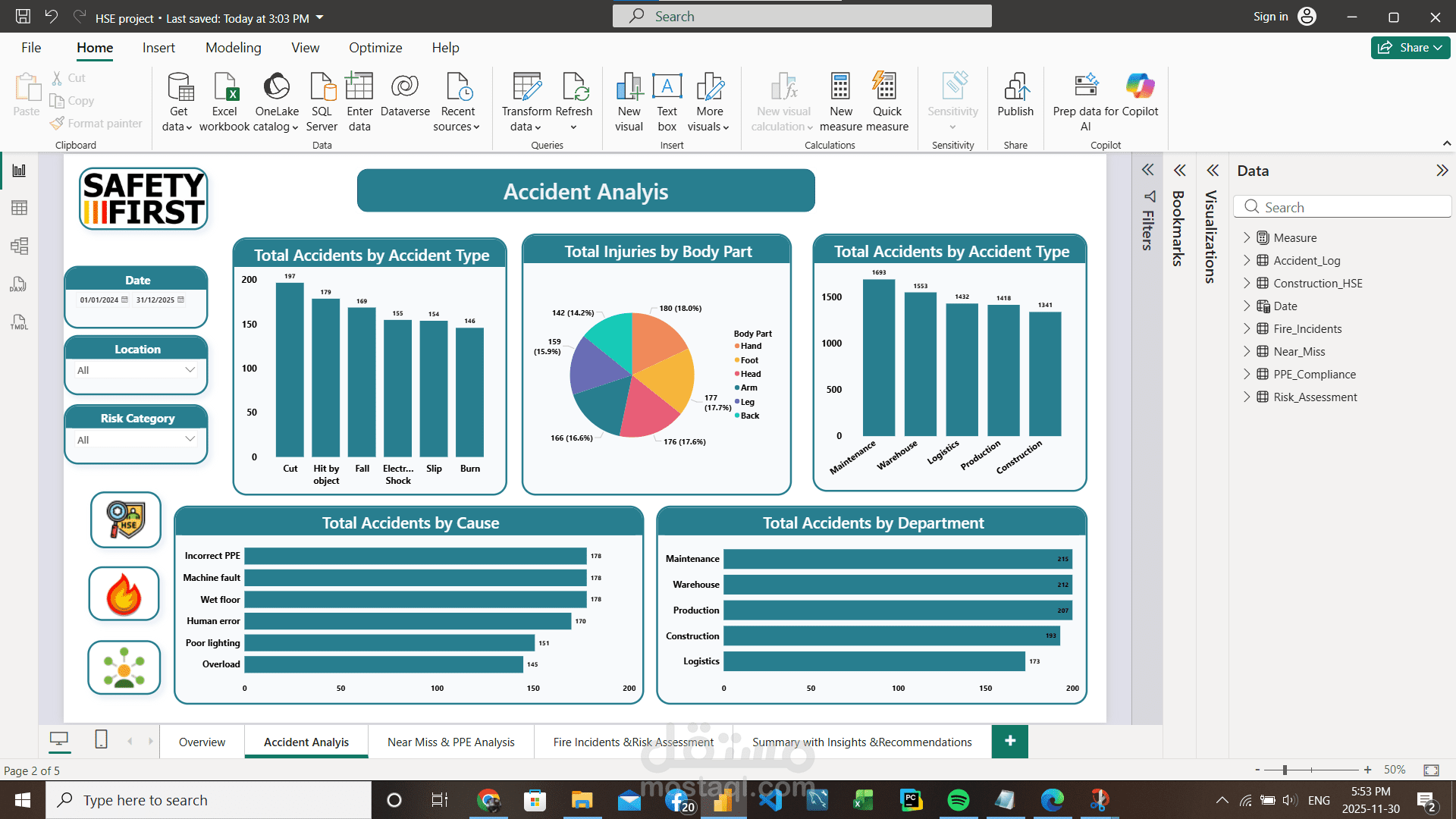 مشروع جديد في مجال الـ HSE Data Analysis، وهو تصميم وبناء HSE Dashboard متكاملة باستخدام Power BI، الهدف منها متابعة وتحليل بيانات السلامة والصحة المهنية داخل المنشآت بشكل احترافي.