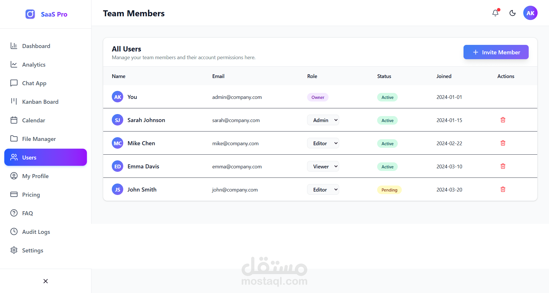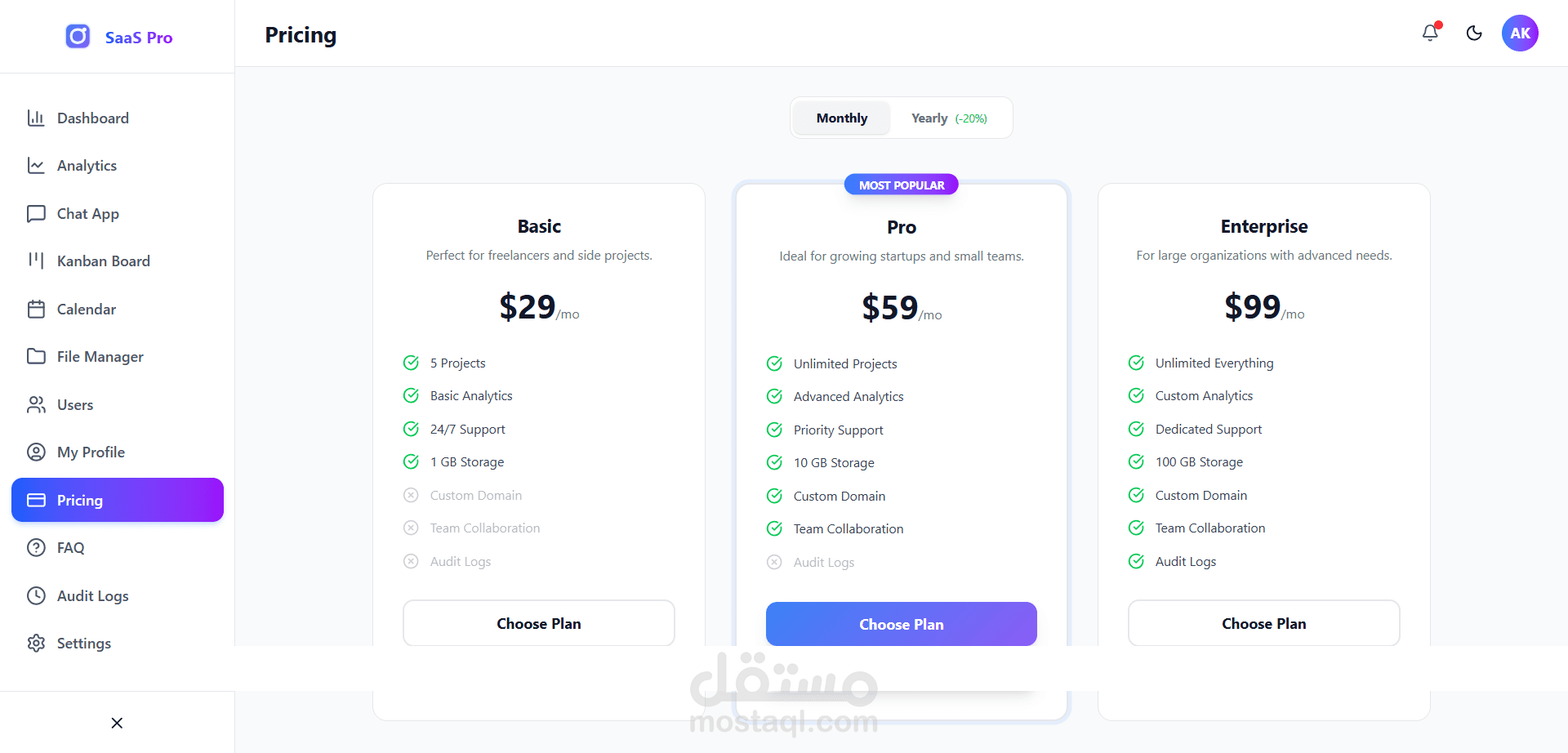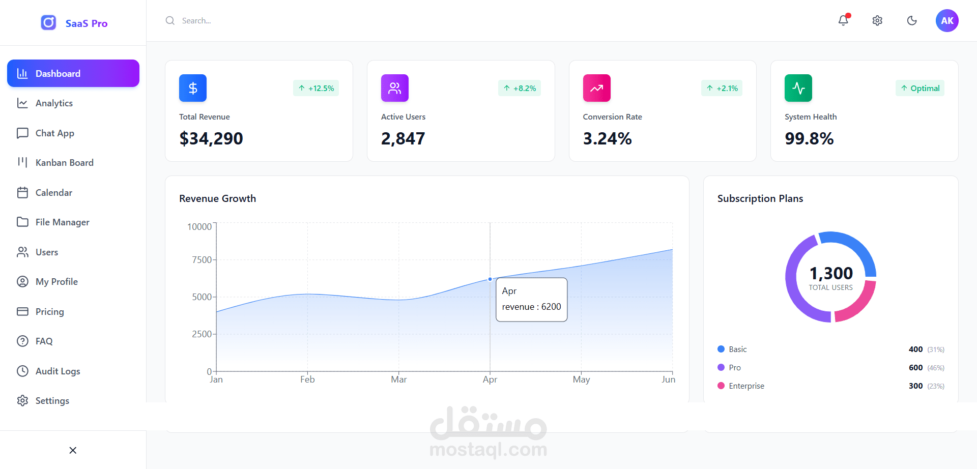 5. صفحات جاهزة: يتضمن صفحات للمستخدمين، الإعدادات، المصادقة (دخول/تسجيل)، الفواتير، والأسئلة الشائعة.