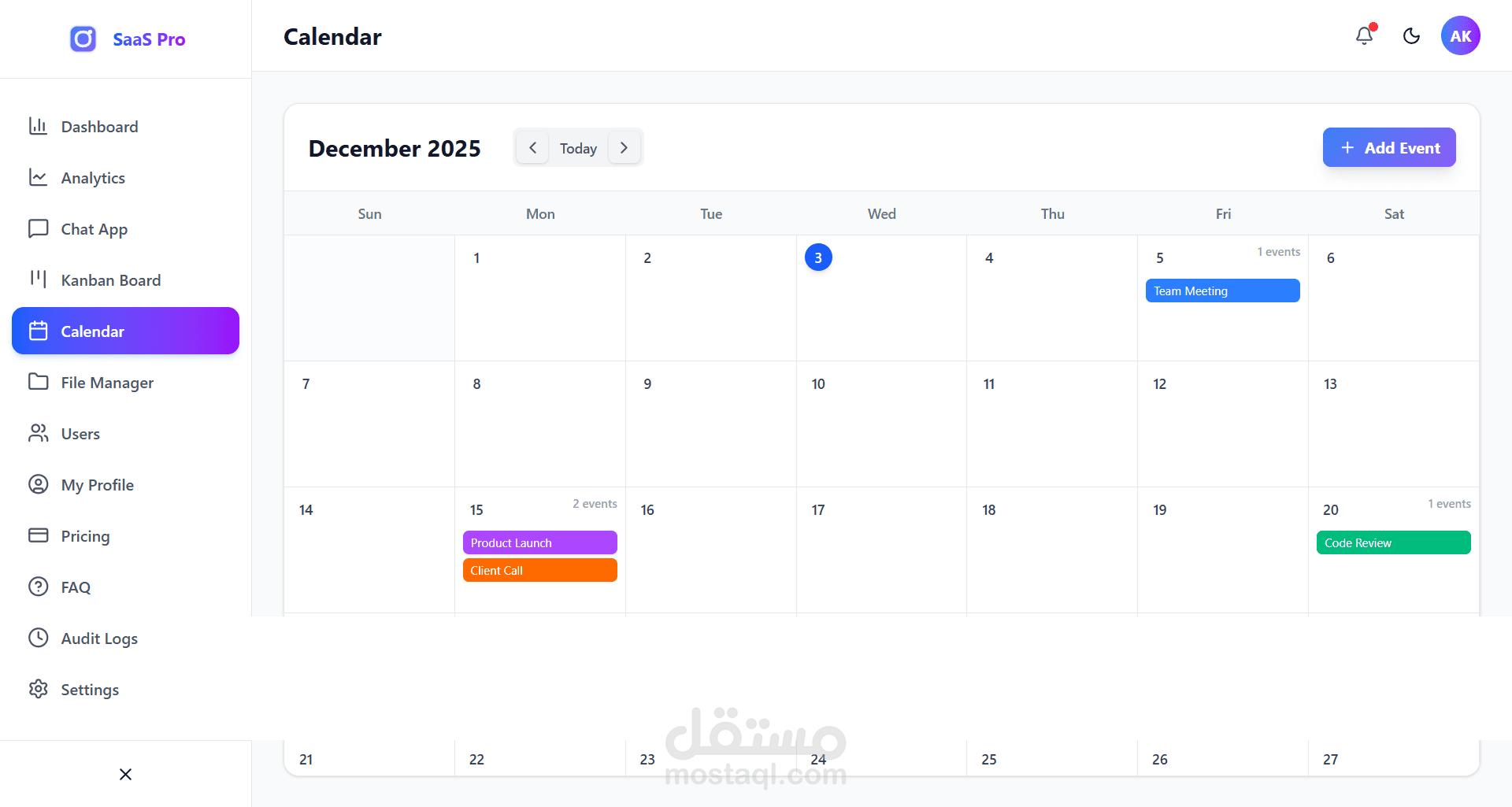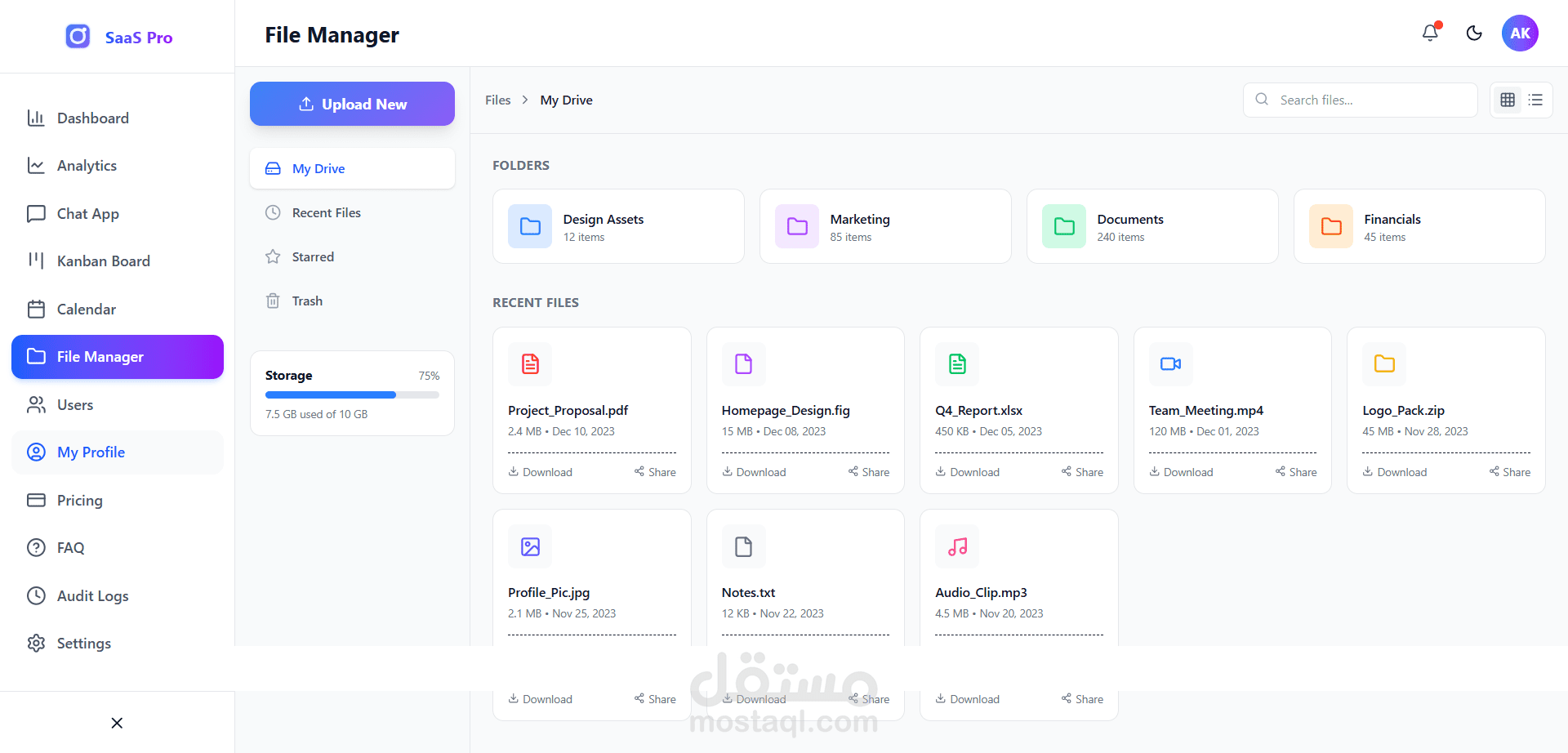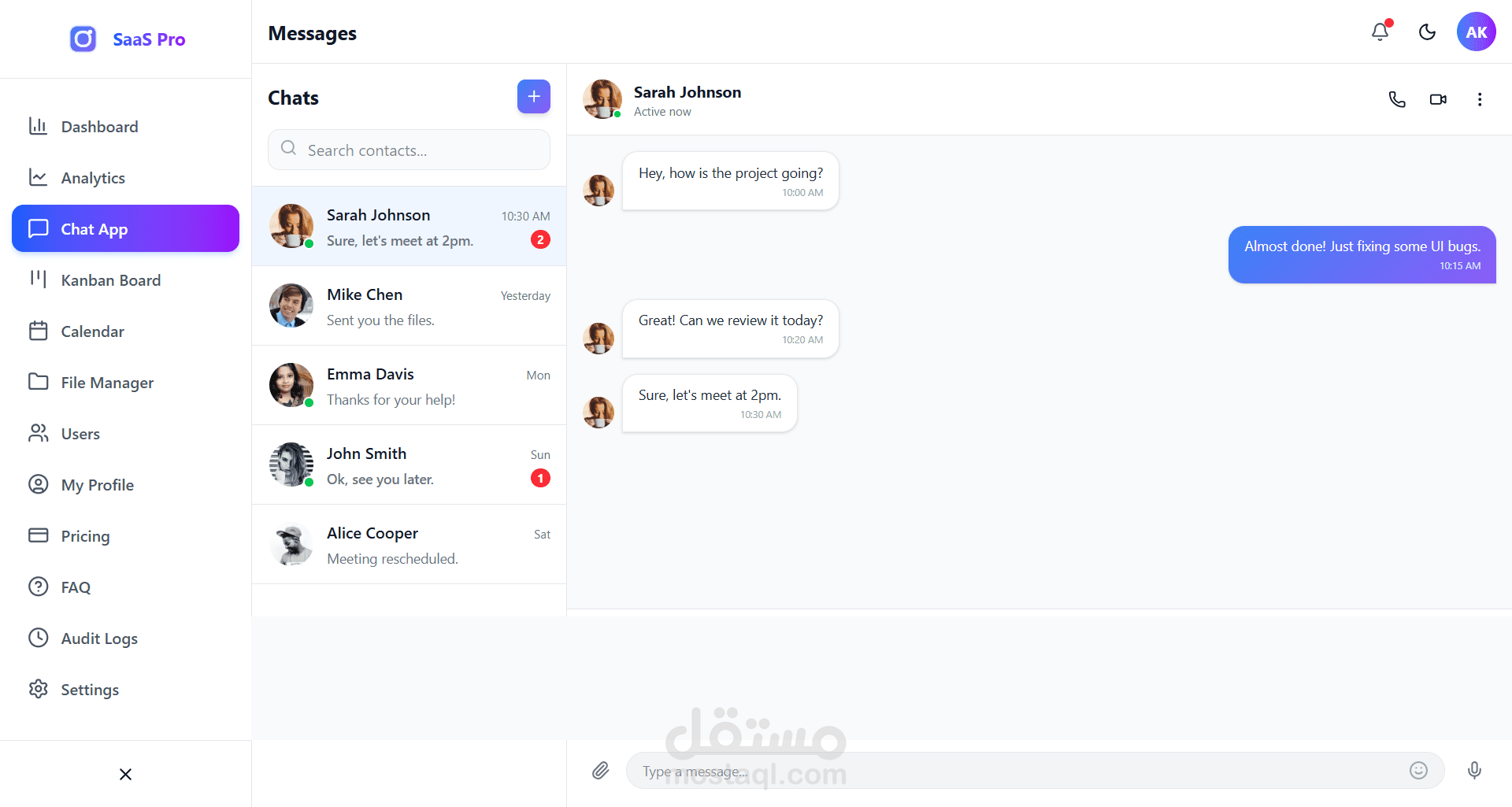 5. صفحات جاهزة: يتضمن صفحات للمستخدمين، الإعدادات، المصادقة (دخول/تسجيل)، الفواتير، والأسئلة الشائعة.