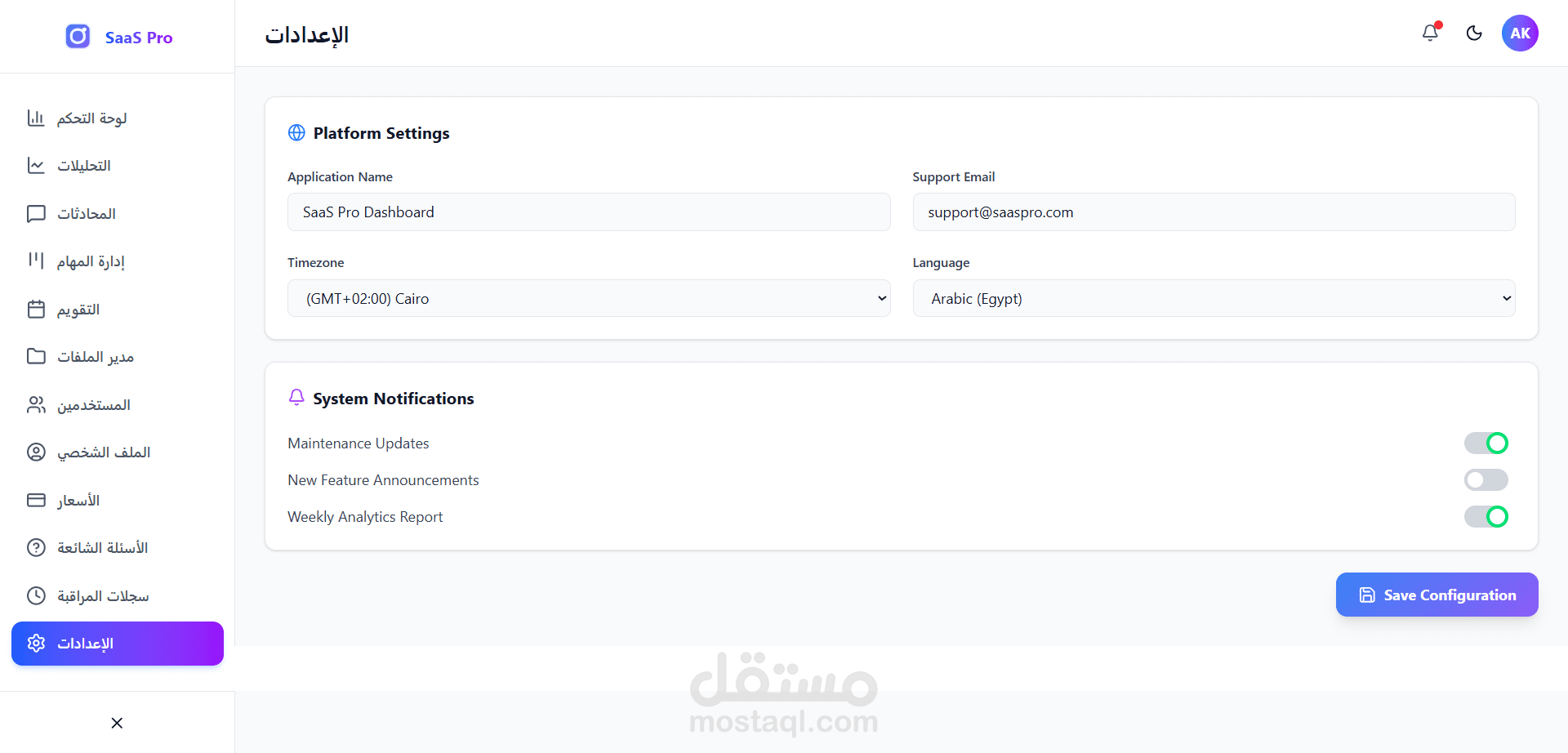 2. دعم اللغة العربية (RTL Support):** واجهة تدعم التحويل الكامل للغة العربية والاتجاه من اليمين لليسار.