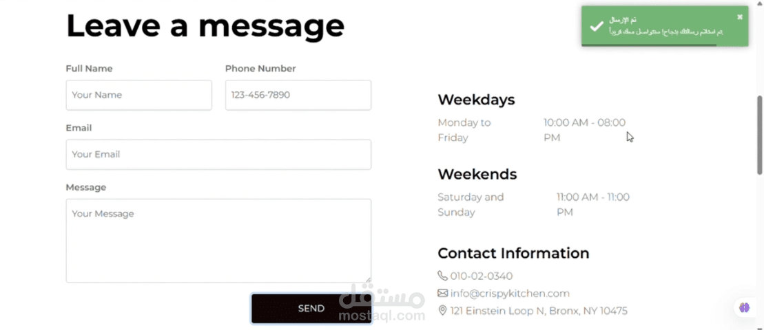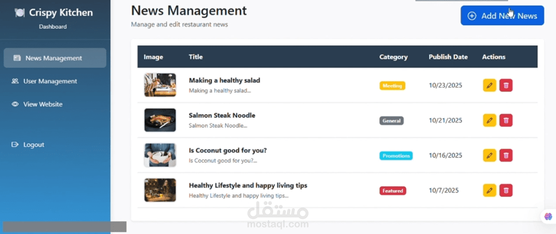 نظام مطعم متكامل تم تطويره باستخدام Laravel و MySQL، يتيح تصفح قائمة الطعام، قراءة الأخبار والعروض، وحجز الطاولات من الموقع مباشرة. يحتوي المشروع على لوحة تحكم خاصة للإدارة لإدارة الطلبات والحجوزات والمحتوى والقائمة، مع صلاحيات مختلفة للمستخدمين (مدير – موظف – زبون).