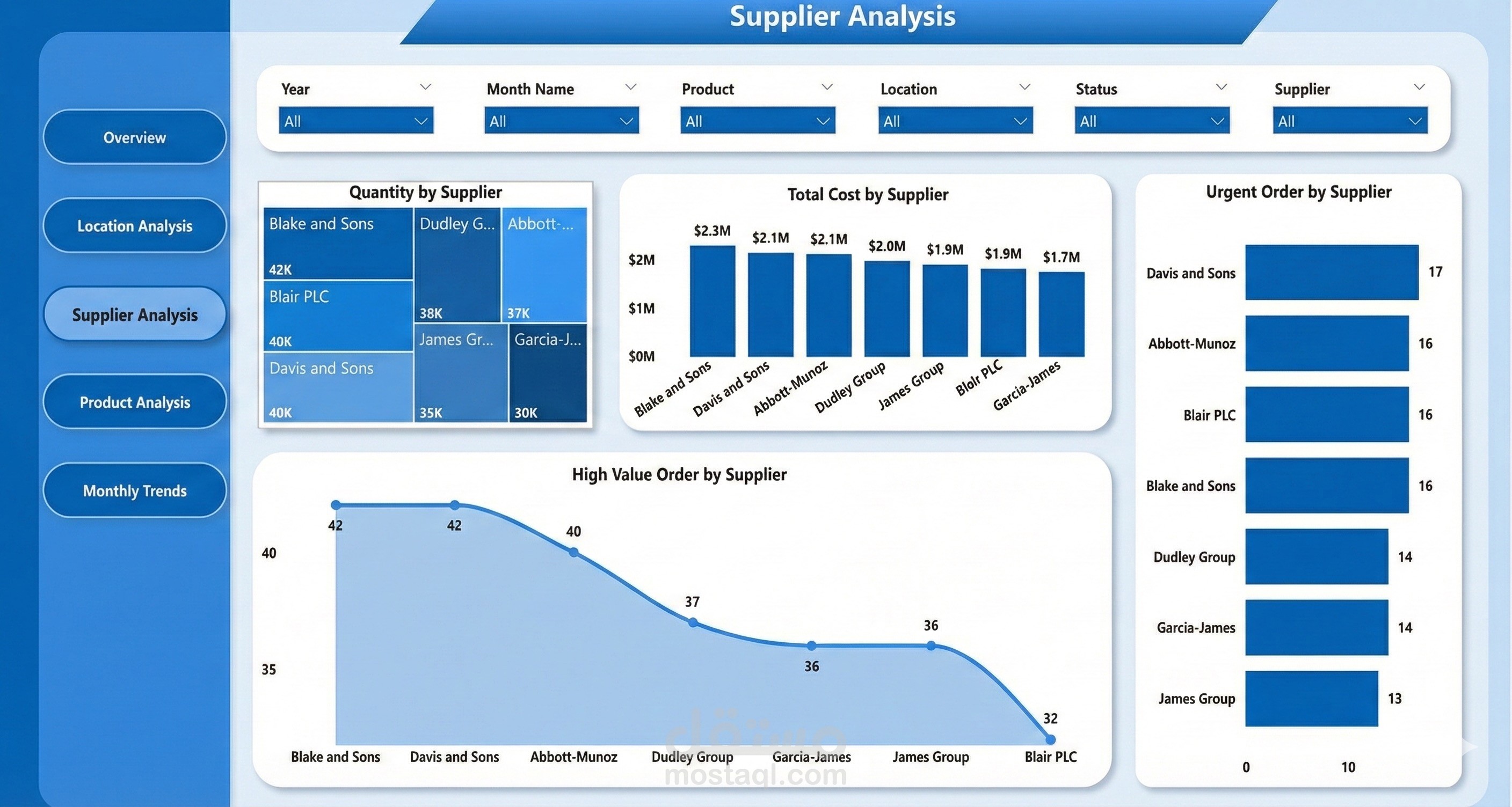 This interactive Supply Chain BI Dashboard provides a 360° real-time view of procurement, supplier performance, product analytics, and monthly operational trends. It consolidates key data from orders, costs, suppliers, and material movements into a unified interface to support fast, data-driven decision making.