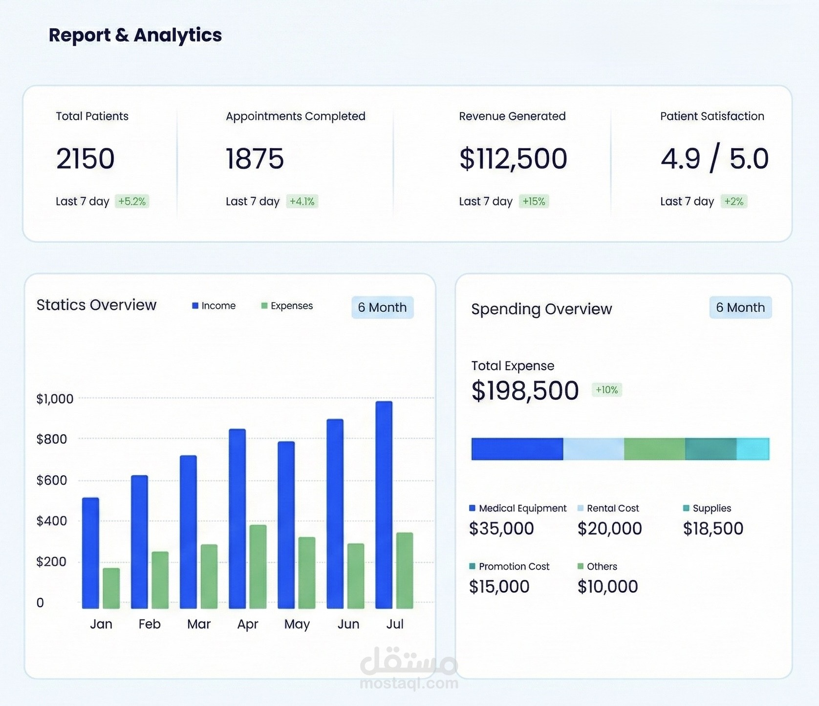 This project presents a comprehensive Healthcare Performance Dashboard designed to track key operational, financial, and patient-centric metrics in real time. The dashboard visualizes total patients, appointments completed, revenue generated, and patient satisfaction, supported by detailed income-vs-expense trends and a full spending breakdown. It provides clear, data-driven insights that support better decision-making, cost control, and service quality improvement across the healthcare facility.