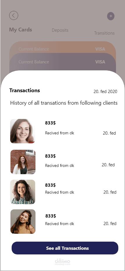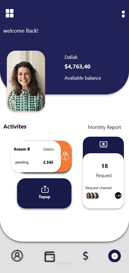 تصميم واجهة تطبيق بنكي حديث، يعرض الحسابات والعمليات بطريقة منظمة وسلسة.
