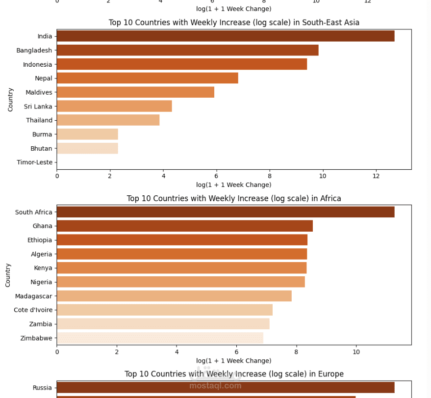 انتشار الفيروس يختلف بشكل كبير بين أقاليم منظمة الصحة العالمية؛ بعض المناطق تظهر نموًا أسبوعيًا أعلى بكثير من غيرها.