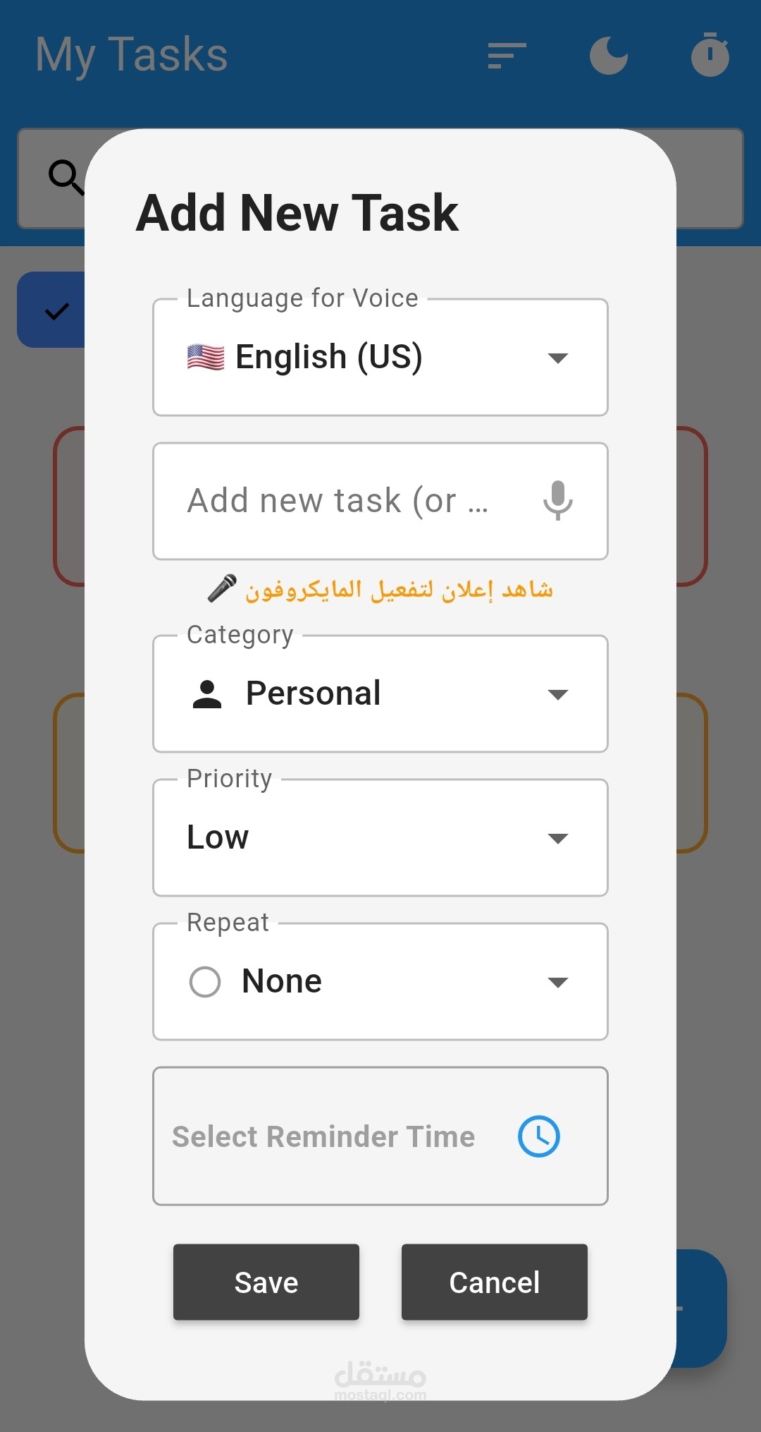 إضافة المهام صوتيًا عبر المايك لتسهيل إدخال المهام بسرعة وسهولة.