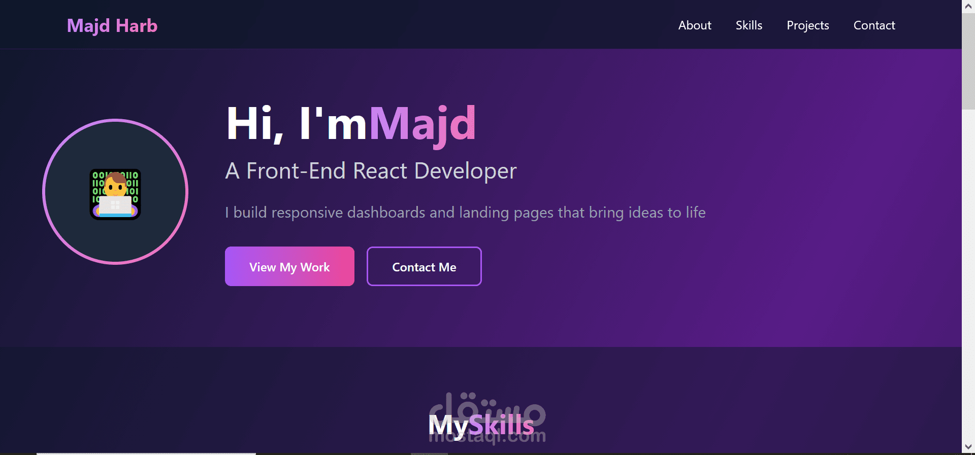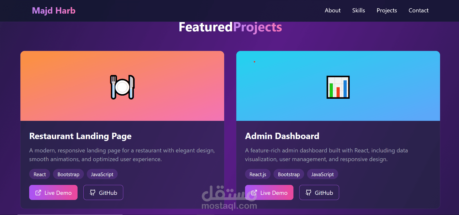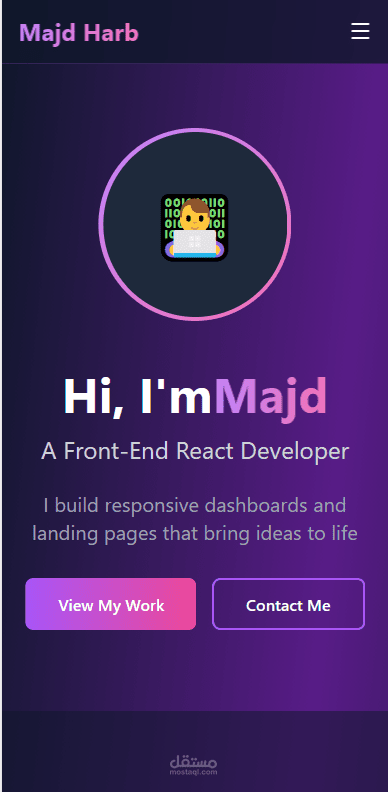 هذا المشروع هو موقعي الشخصي (Portfolio) الذي قمت بتصميمه وتطويره بالكامل ليكون الواجهة التعريفية لخدماتي ومهاراتي. يهدف الموقع إلى تقديم تجربة مستخدم سلسة وعصرية تعكس قدرتي على بناء واجهات أمامية متقنة.