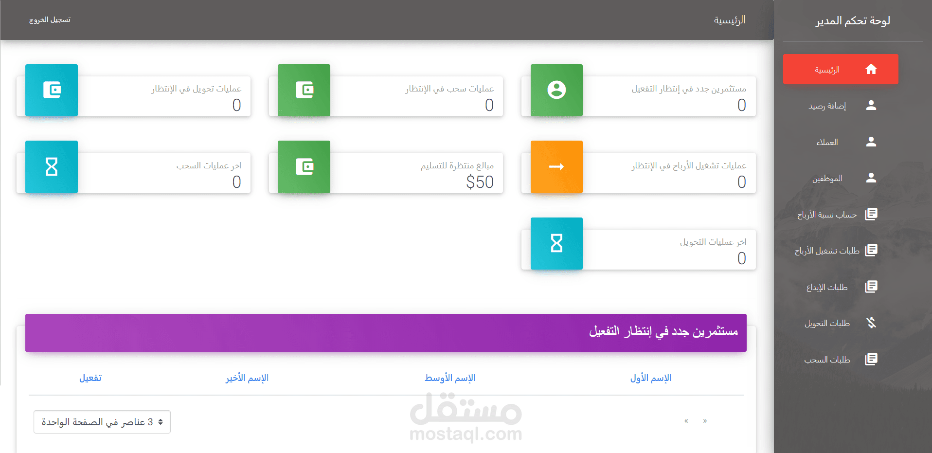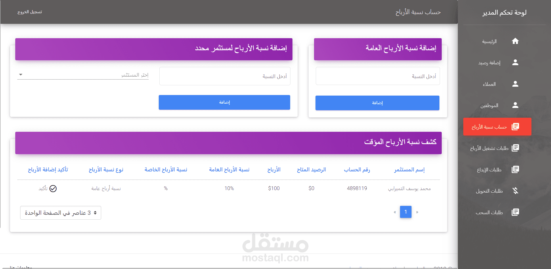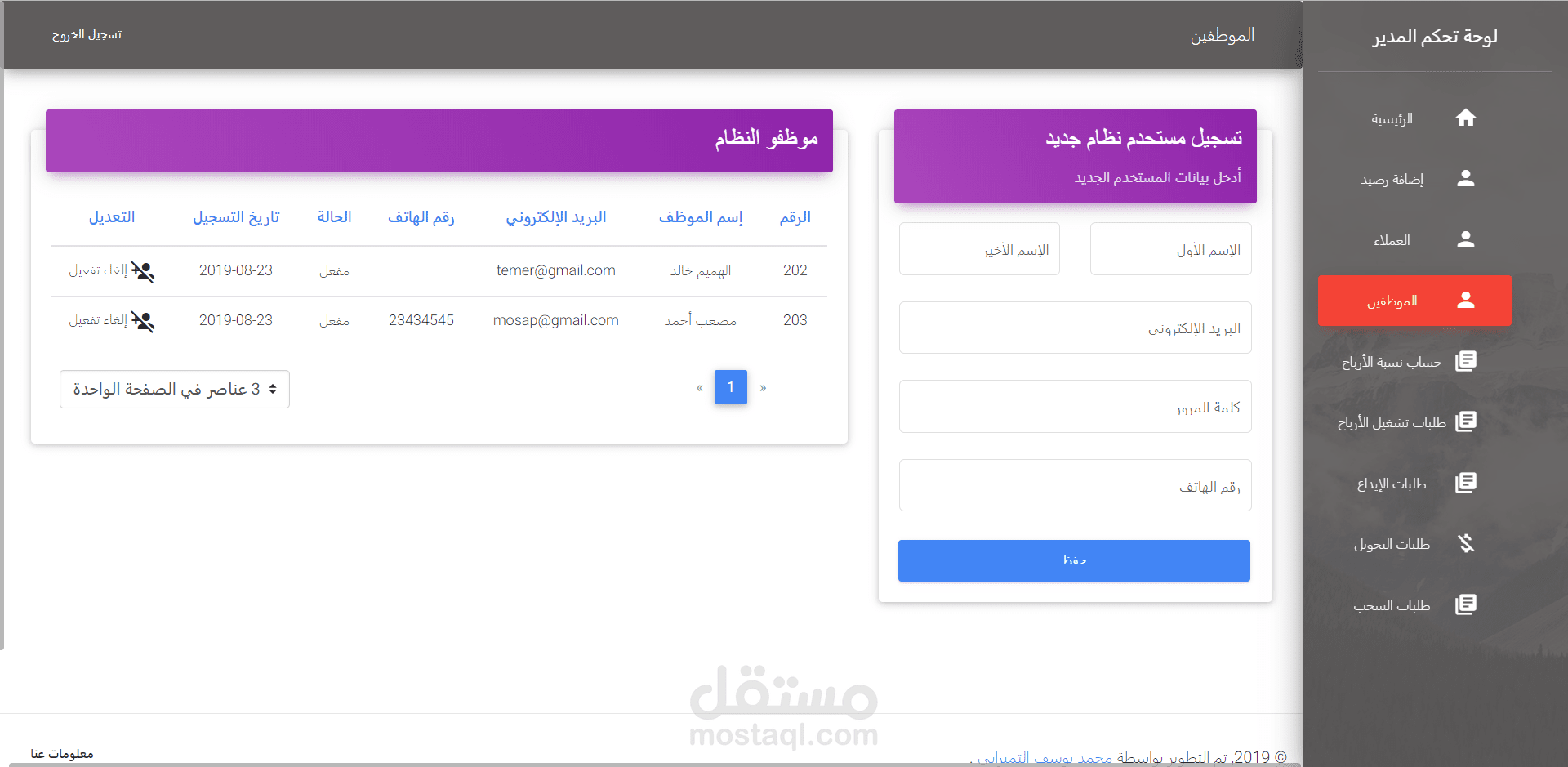 موقع إلكتروني لمحفظة إلكترونية يحتوى على ثلاثة مستخدمين مدير ، موظف ومستثمر