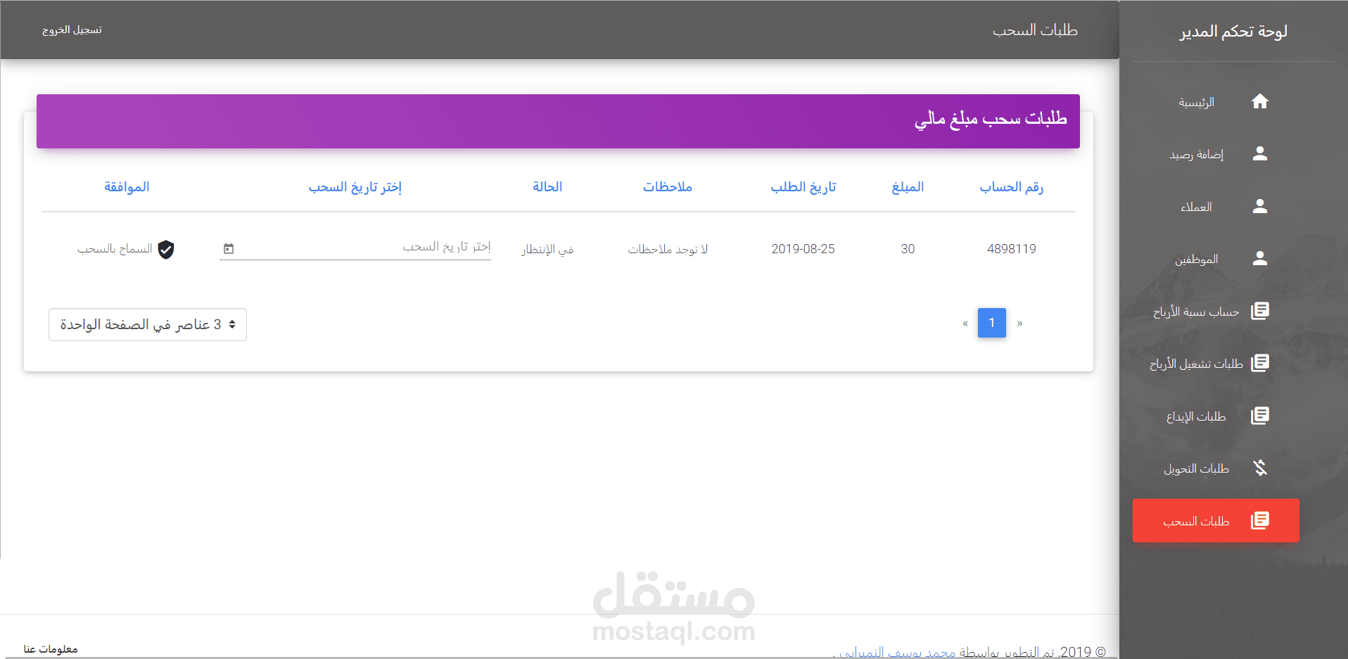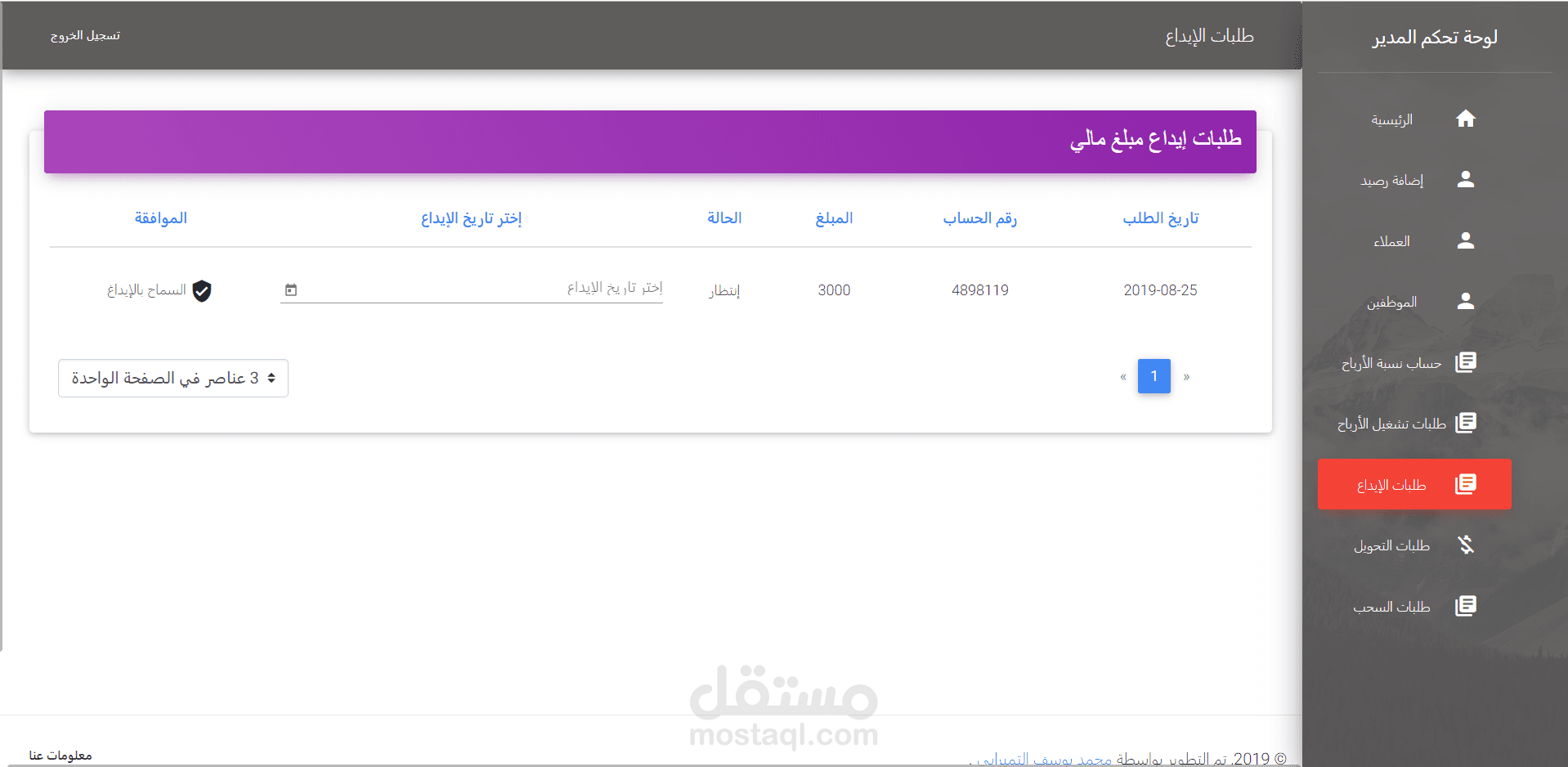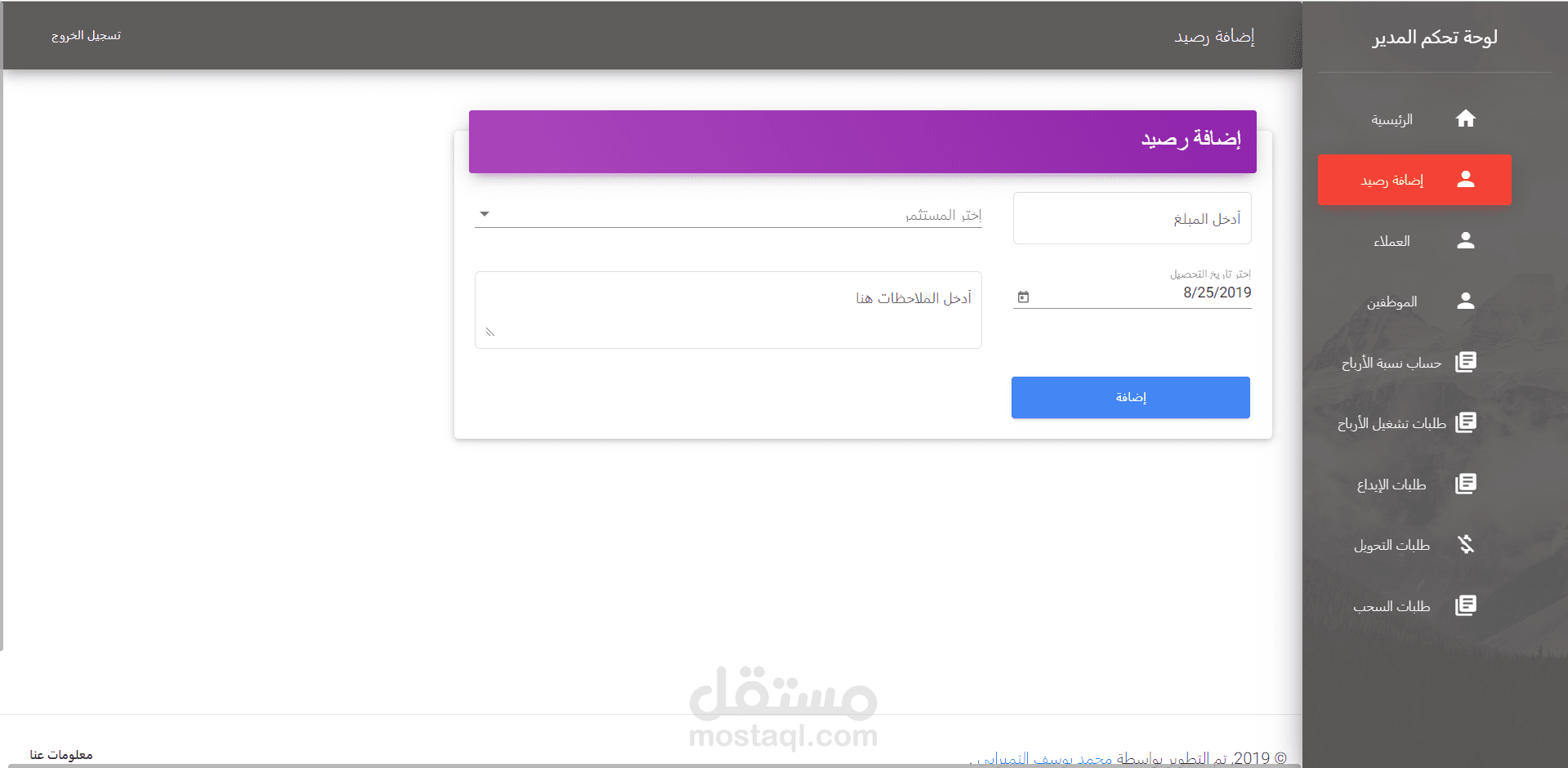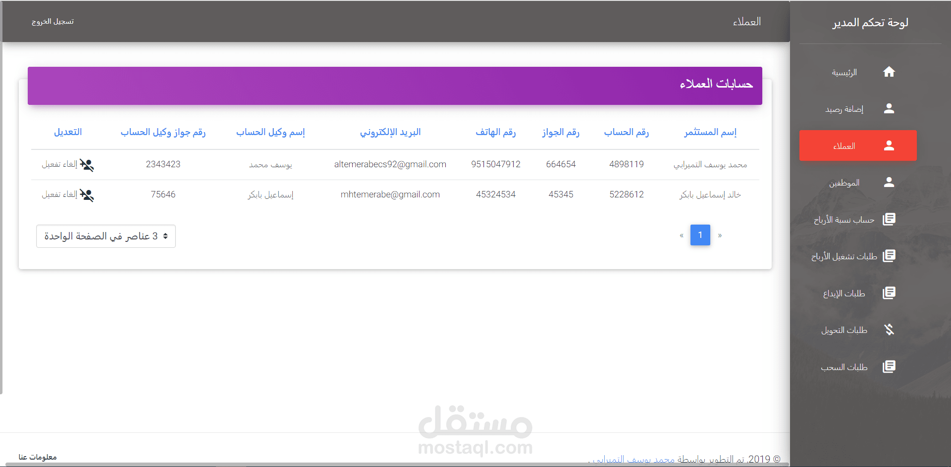 موقع إلكتروني لمحفظة إلكترونية يحتوى على ثلاثة مستخدمين مدير ، موظف ومستثمر