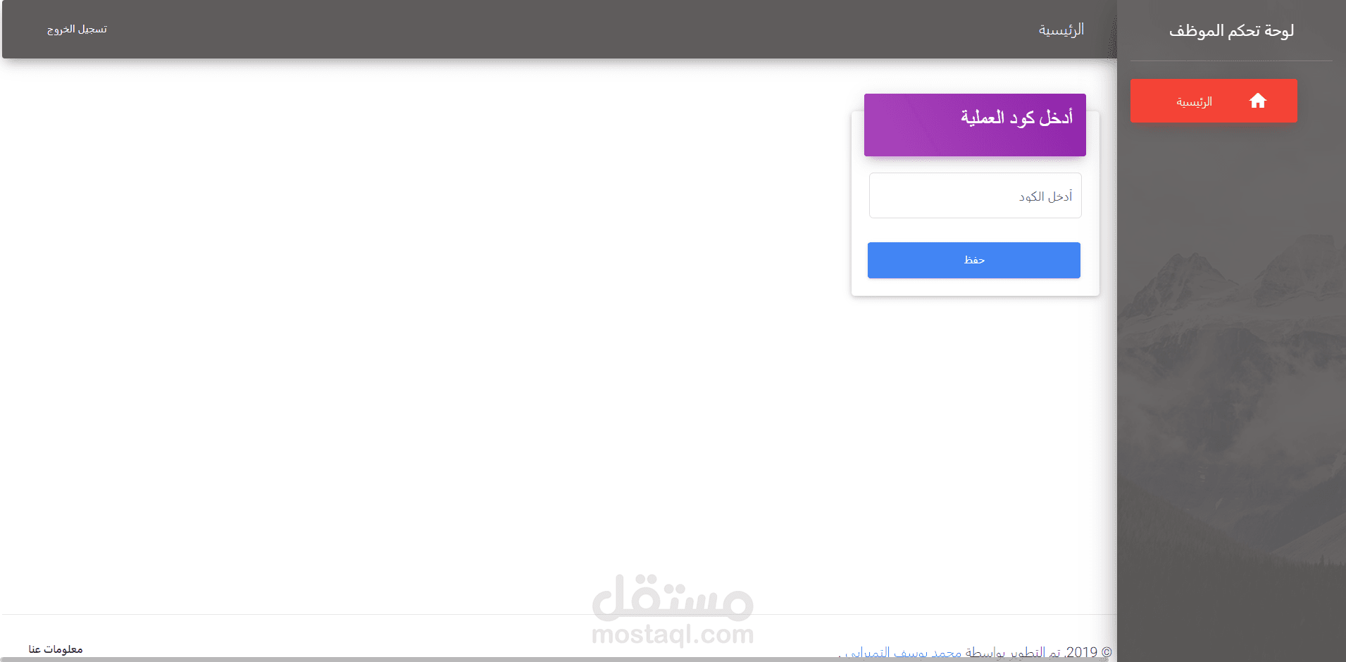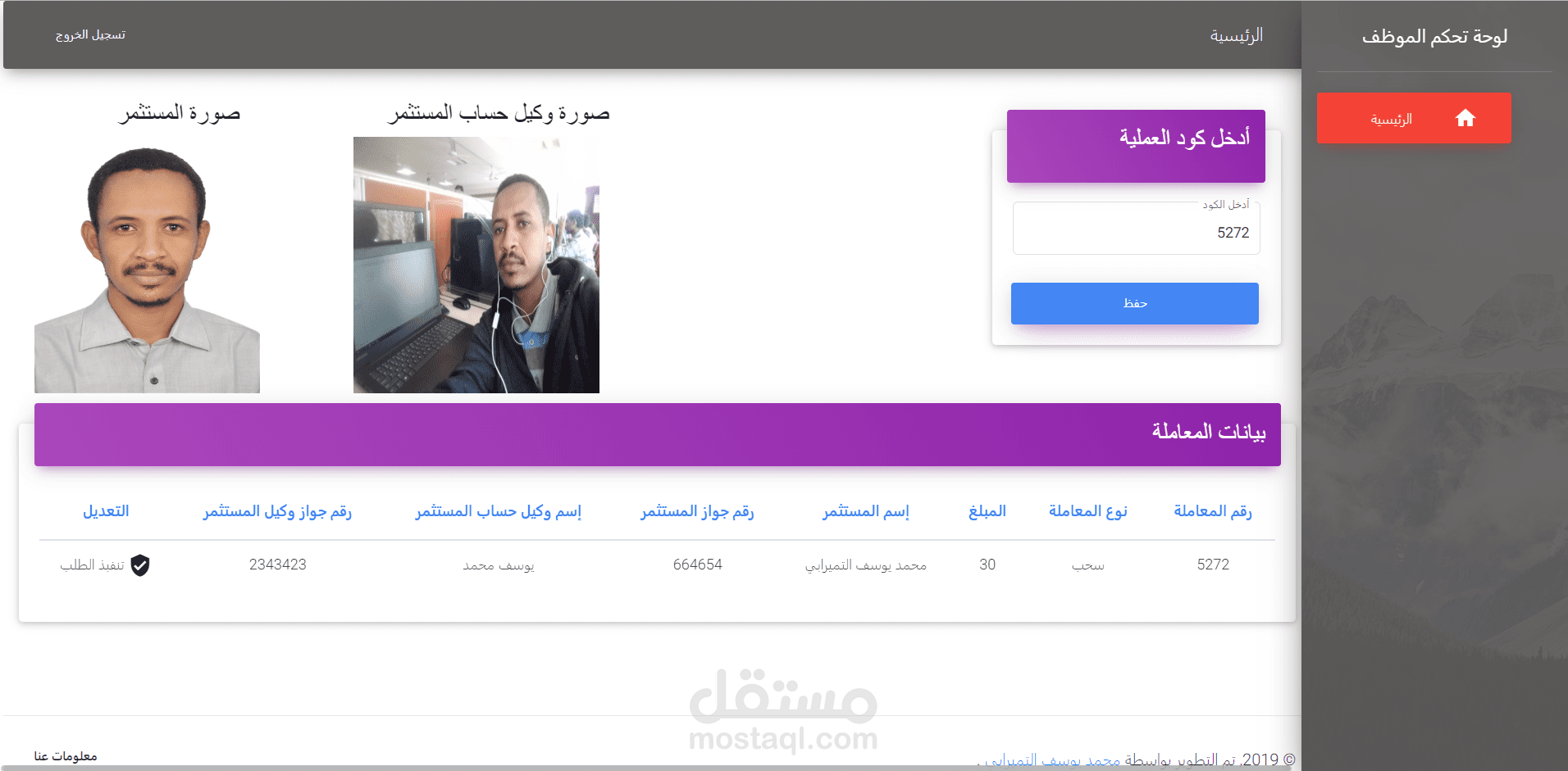 لكل مستحدم لوحة تحكم خاصة به يستطيع من خلالها إنجاز بعض العمليات كإضافة الرصيد والموافقة على عمليات السحب والإيداع التي قام بإجراءها المستثمرين كما في حالة صلاحيات الادمن ، أو القيام بعمليات سحب وإيداع وكشف مفصل عن هذه العمليات كما في حالة المستثمرين ، الموظف يقوم من خلال هذا التطبيق بالتعامل مع المستثمرين حيث يقوم بإستلام رمز العملية من المستثمر والتحقق من نوع العملية وبيانات المستثمر حيث سيقوم بتسليمه مبلغ مالي إن كانت العملية عملية سحب أو إستلام مبلغ مالي منه إن كانت العملية عملية إيداع.