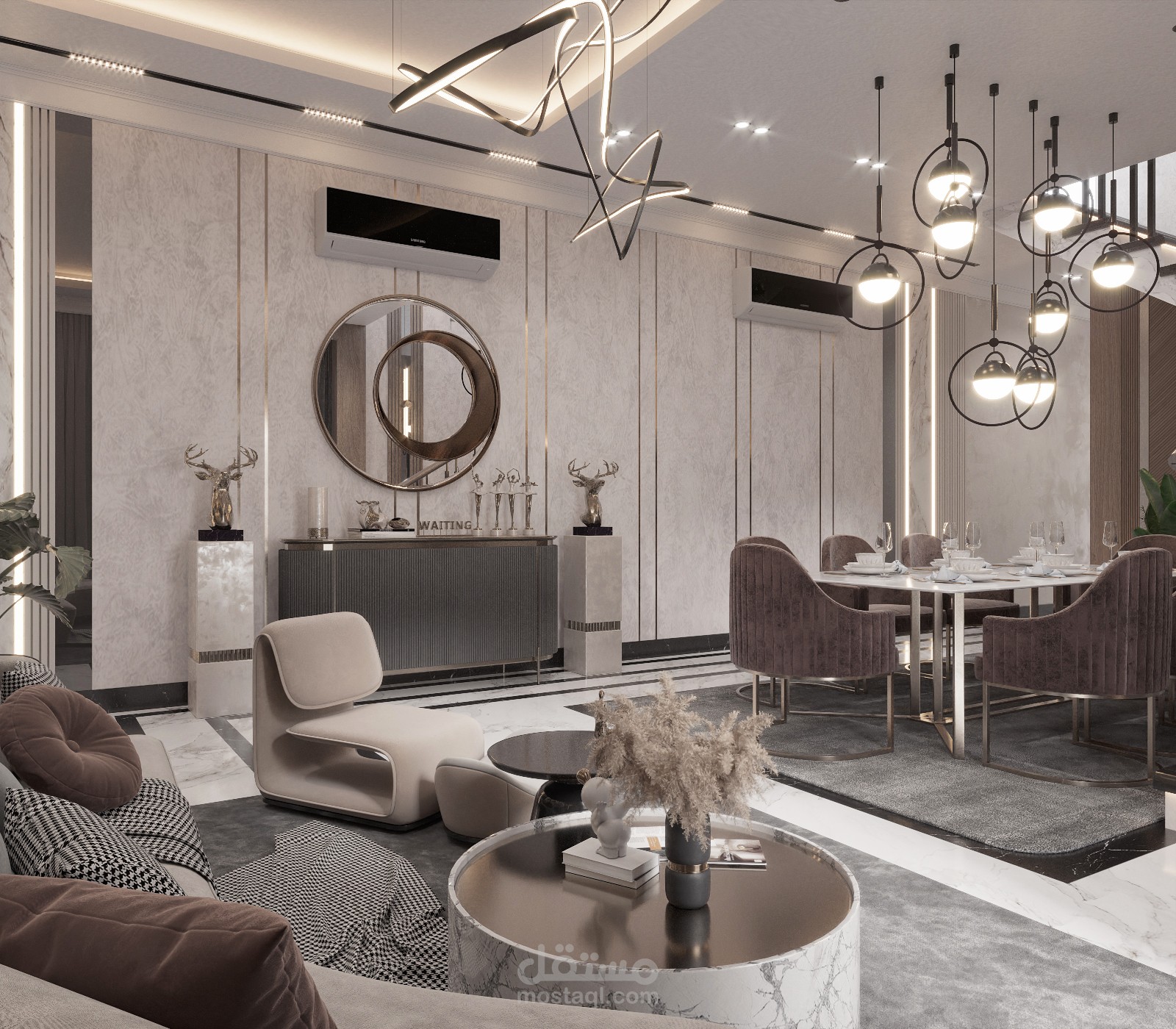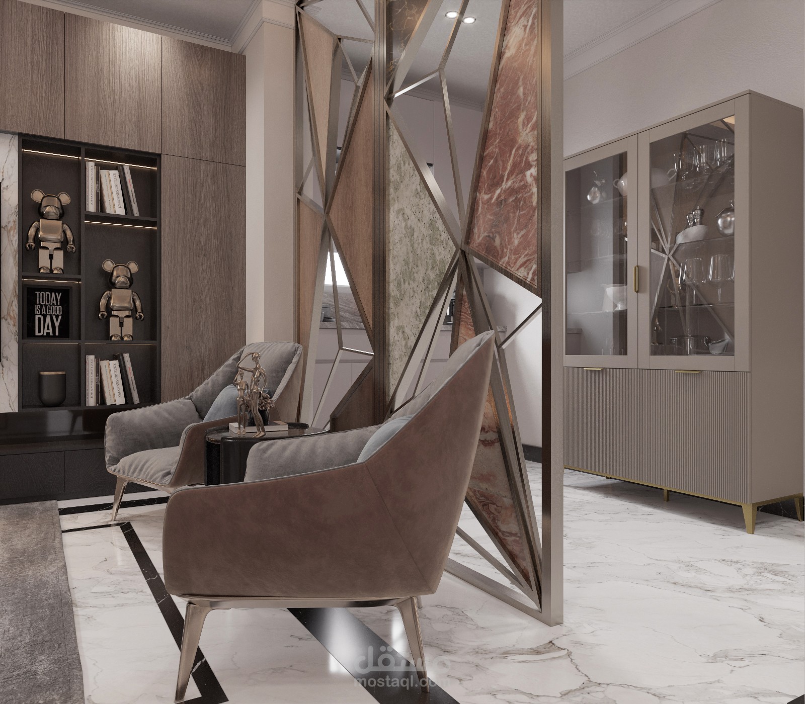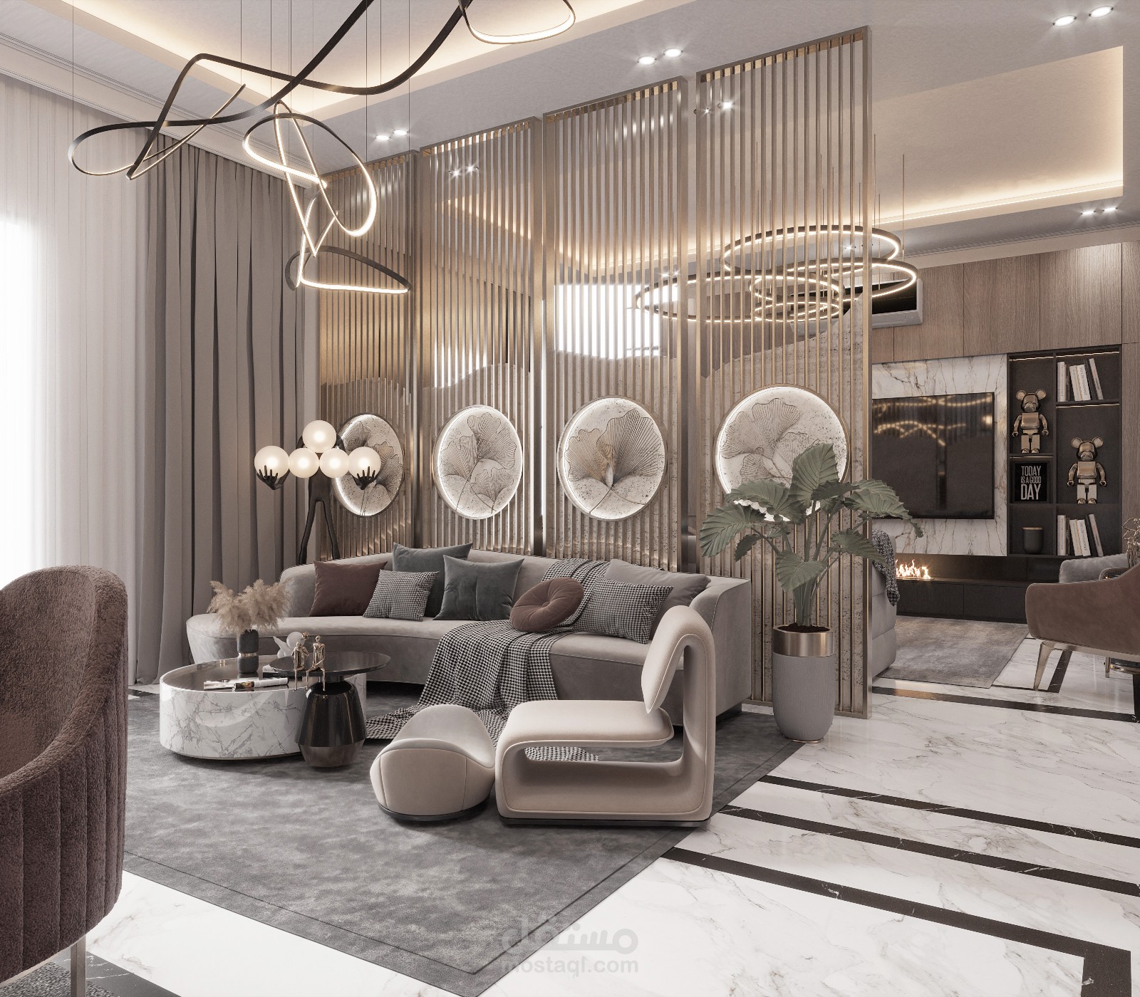 شغلي شمل تطوير تصور كامل لمساحة المعيشة بما يتوافق مع احتياجات العميل وستايل الفيلا، ثم إخراج الرسومات بشكل تفصيلي يوضّح كل عنصر داخل الفراغ.