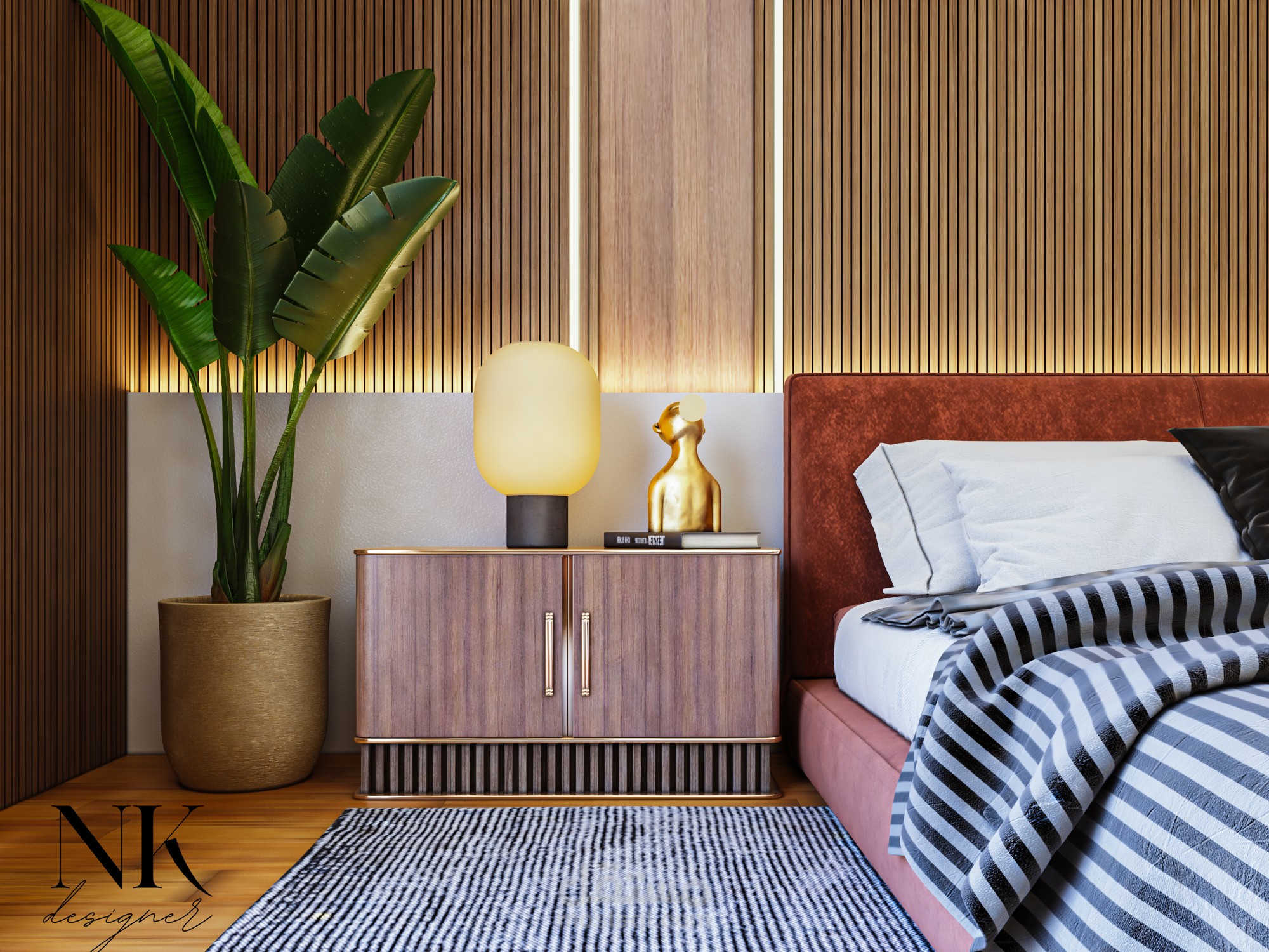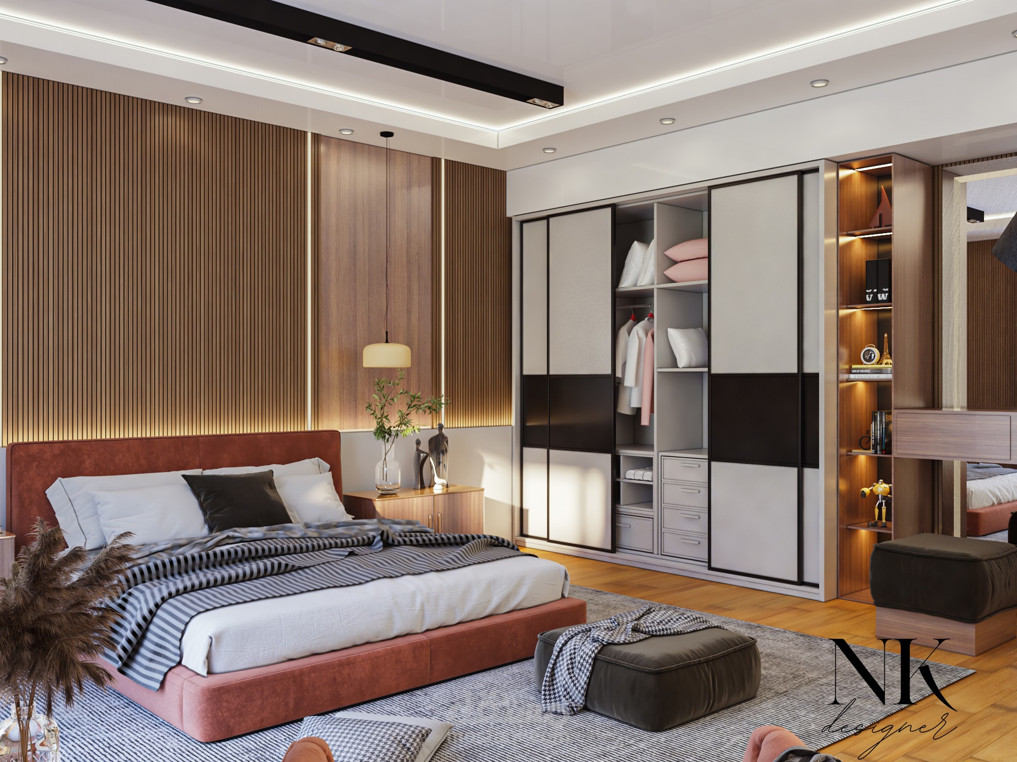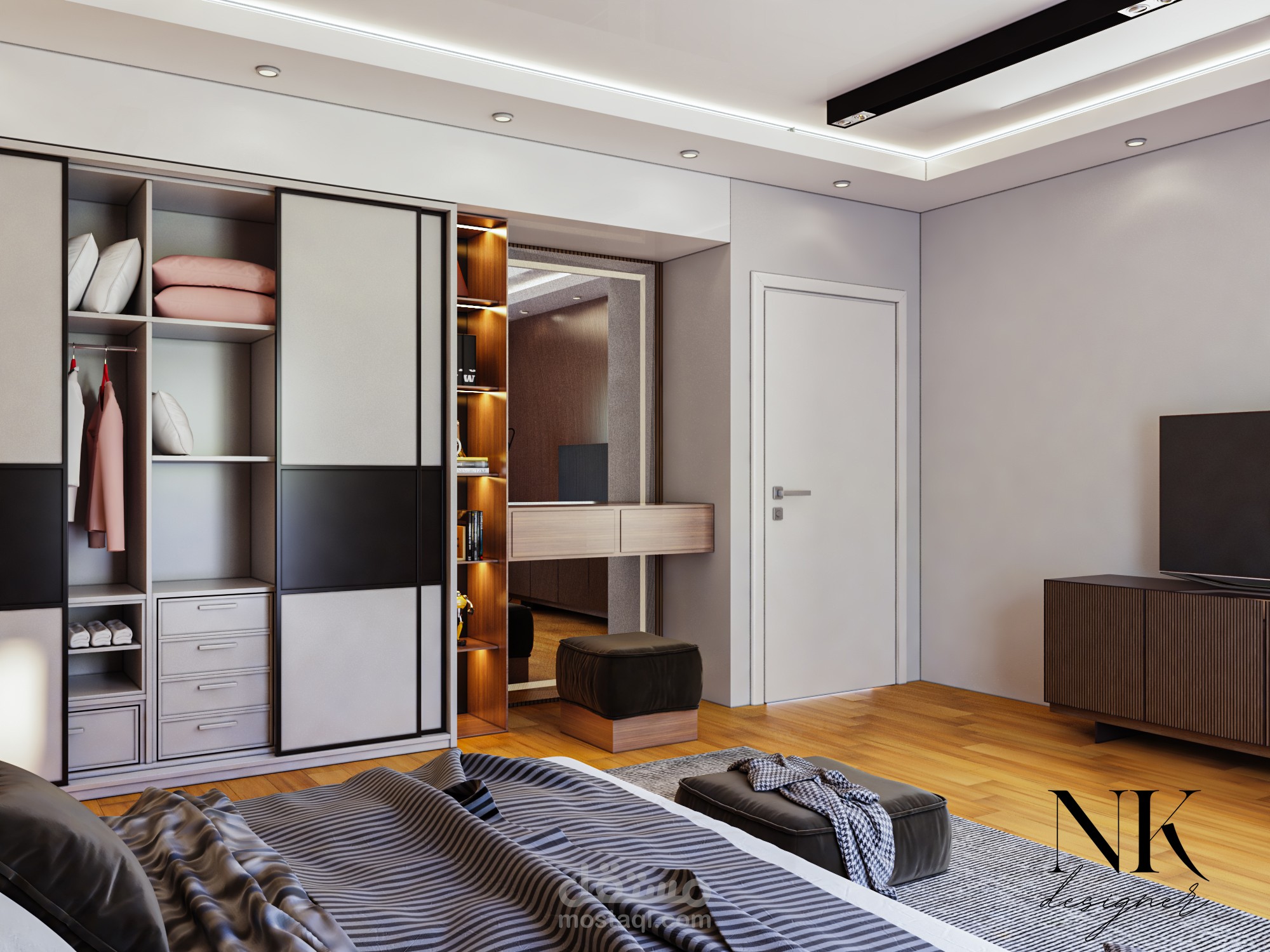 قمت بتصميم غرفة نوم رئيسية (Master Bedroom) داخل فيلا سكنية بستايل مودرن يجمع بين الهدوء، الفخامة، والبساطة. الهدف من المشروع كان خلق مساحة مريحة وراقية تمنح شعور بالاسترخاء، مع الحفاظ على لمسات تصميمية عصرية تضيف شخصية واضحة للغرفة.