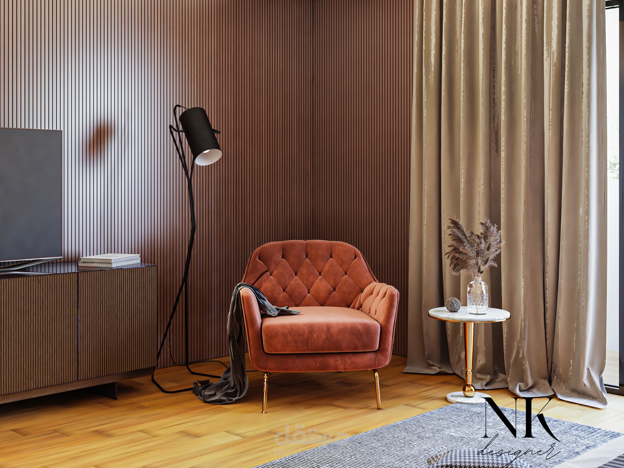 اختيار لوحة ألوان (Color Palette) تعتمد على درجات البيج والرمادي، مع تفاصيل خشبية تزيد إحساس الدفء.
