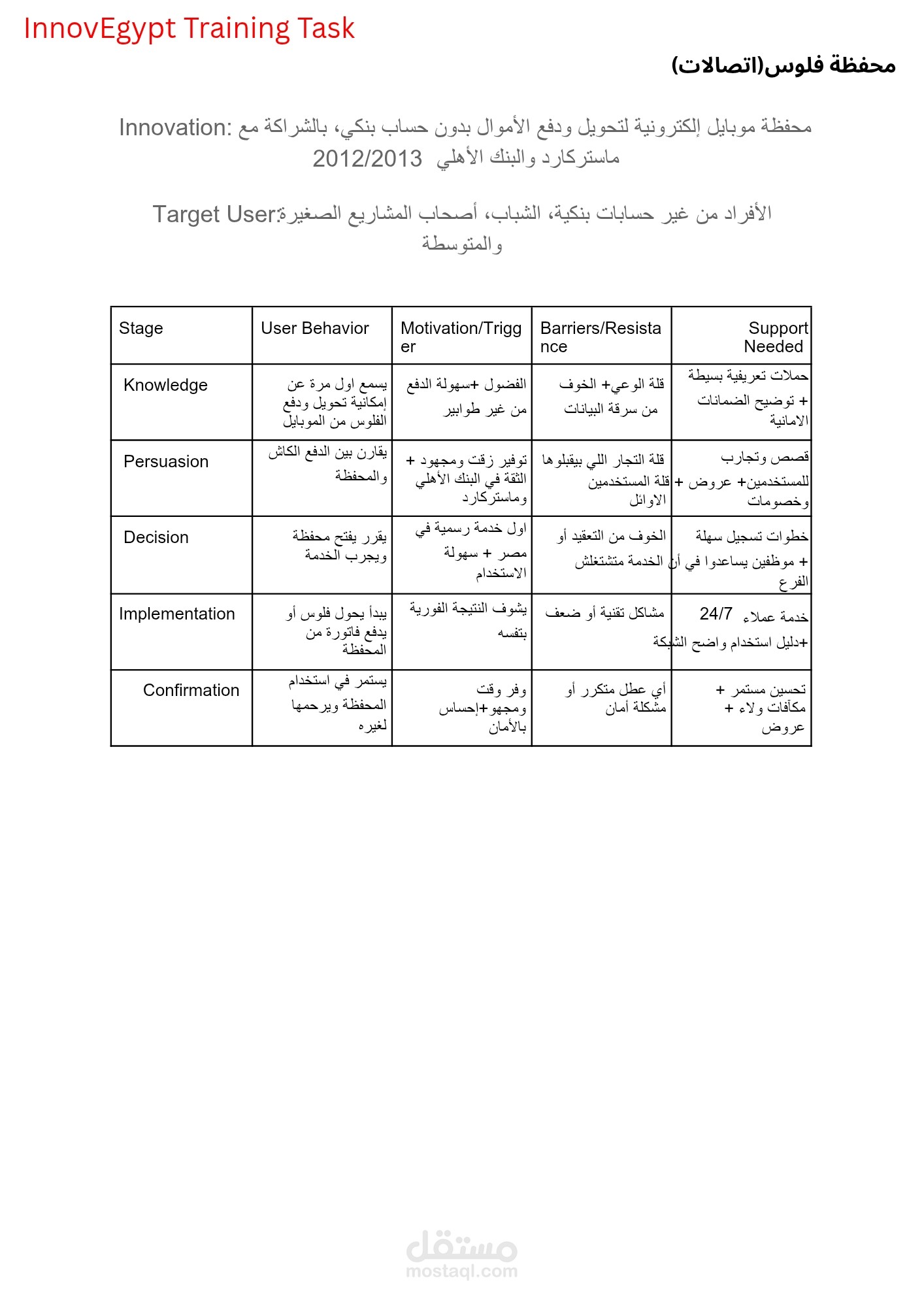 A task for analyzing innovation, target users, and the five stages of oppression, from knowledge to confirmation, for a wallet from Etisalat and the Coursera platform