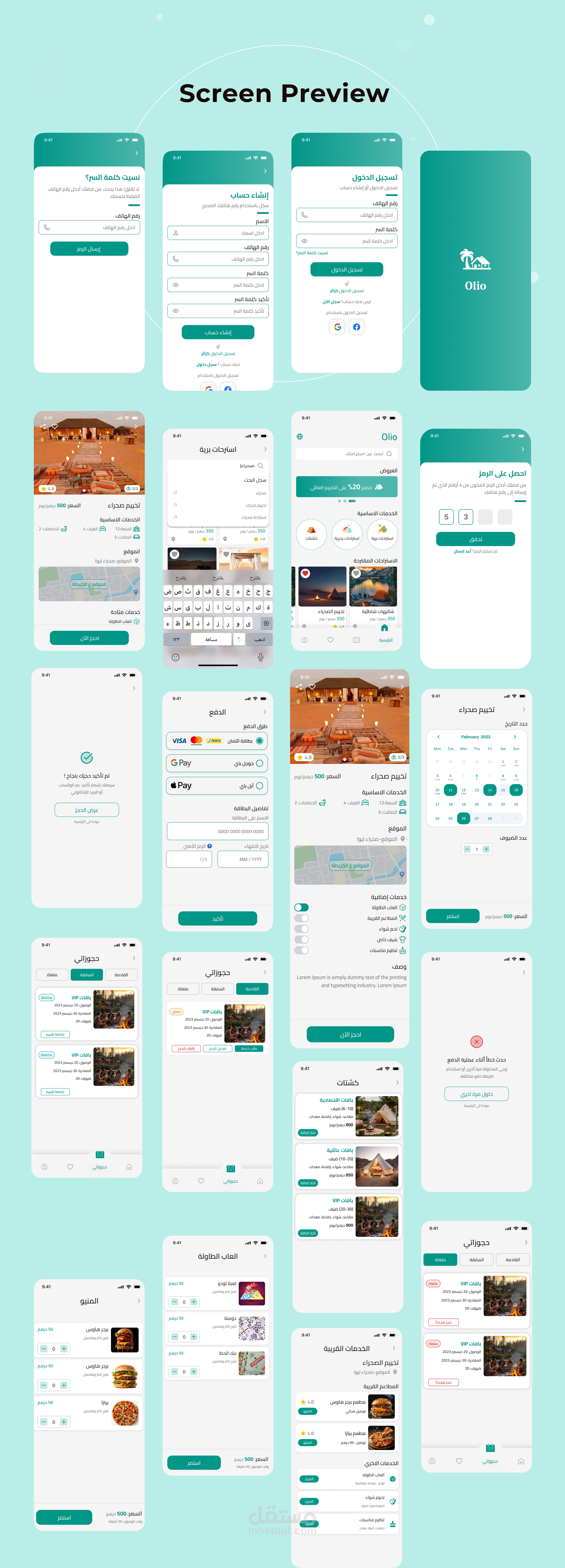 تطبيق "Oilo"، وهو مخصص لحجز الكشتات البرية والبحرية، مع إمكانية اختيار باقات مختلفة تناسب أعداد مختلفة من الأشخاص، زي عائلات أو مجموعات كبيرة. كمان فيه خدمات قريبة من موقع الكشتة زي المطاعم، والطاولات، والكوتشينة، وأيضاً خدمات الشيف والوجبات. بالإضافة إلى إمكانية إدارة الحجزات الخاصة بالمستخدم، وإضافة العناصر المفضلة.