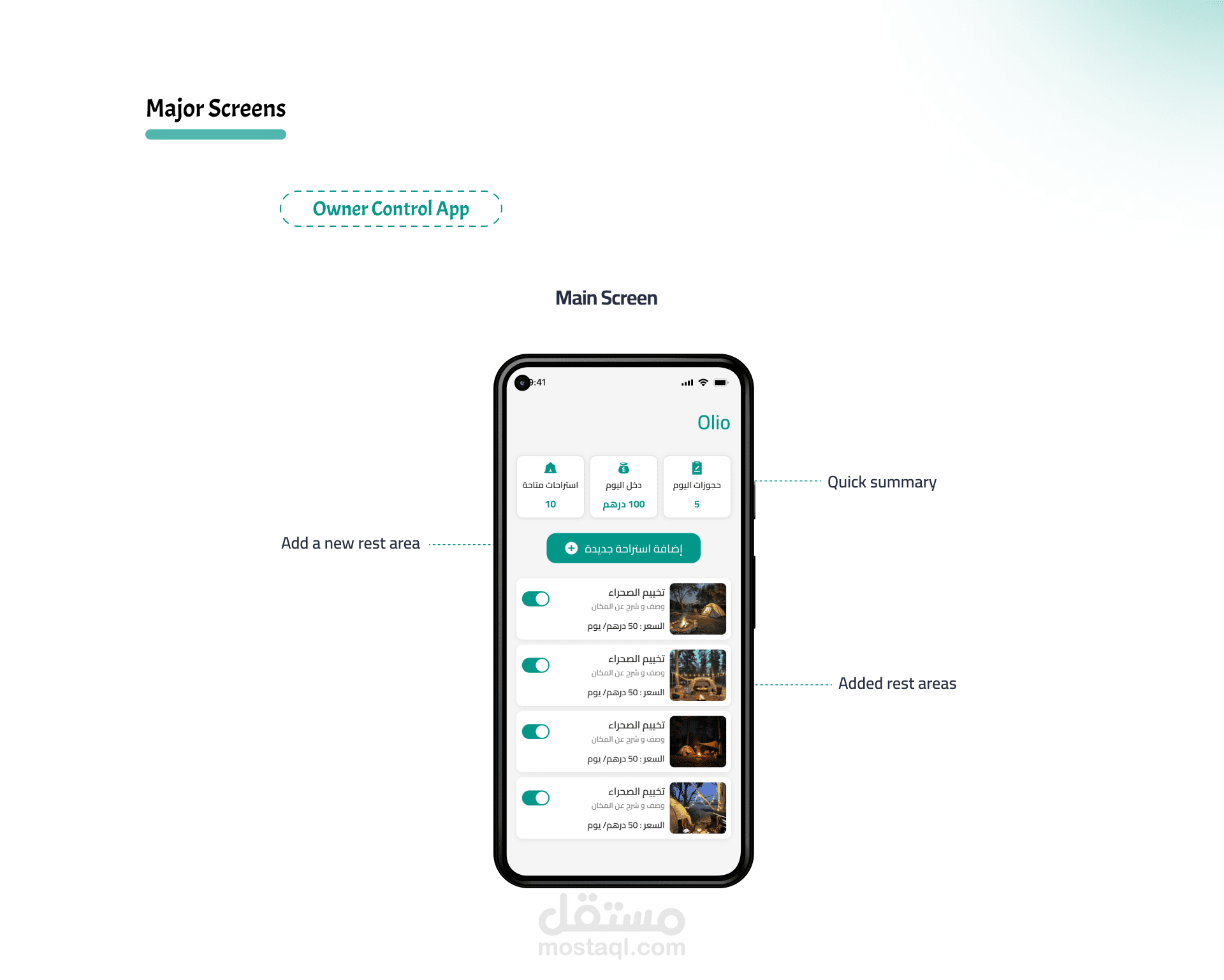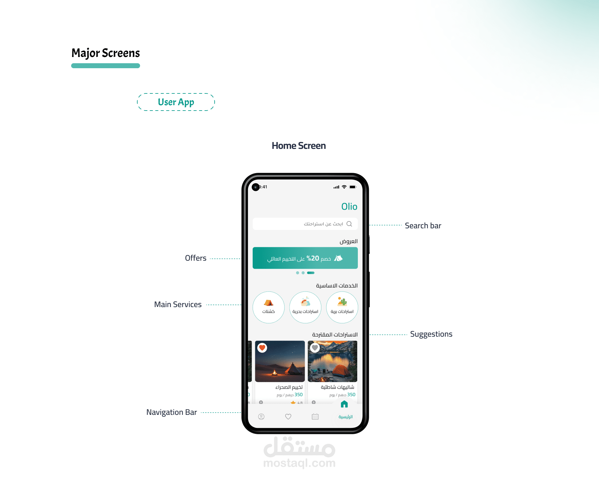 تطبيق "Oilo"، وهو مخصص لحجز الكشتات البرية والبحرية، مع إمكانية اختيار باقات مختلفة تناسب أعداد مختلفة من الأشخاص، زي عائلات أو مجموعات كبيرة. كمان فيه خدمات قريبة من موقع الكشتة زي المطاعم، والطاولات، والكوتشينة، وأيضاً خدمات الشيف والوجبات. بالإضافة إلى إمكانية إدارة الحجزات الخاصة بالمستخدم، وإضافة العناصر المفضلة.