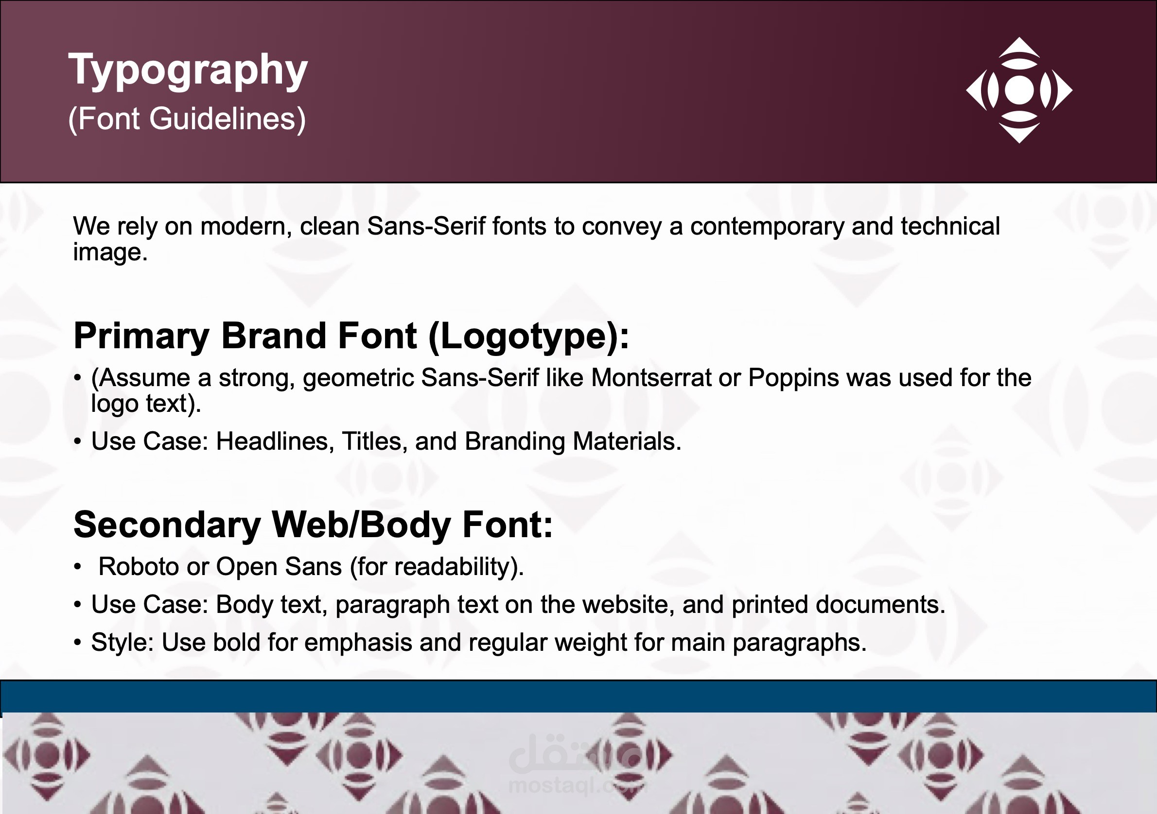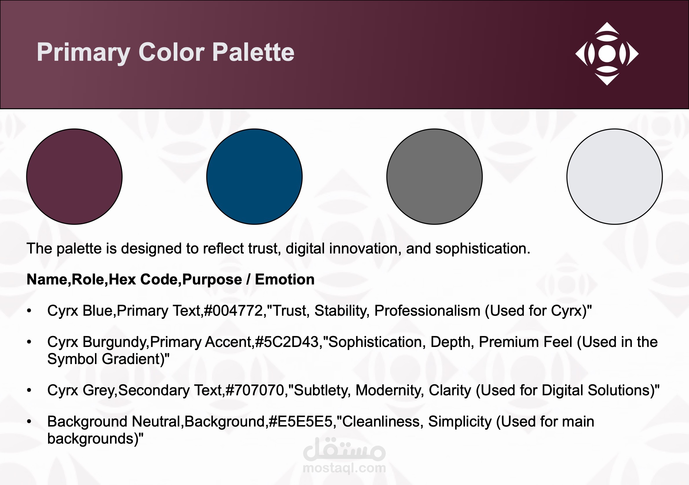 اعتمدت الهوية البصرية على الموازنة بين الفخامة والحداثة؛ حيث تم دمج اللون الخمري العميق (Burgundy) الذي يوحي بالأصالة والتميز، مع الأزرق البترولي الداكن (Dark Teal) الذي يعكس الثقة والتقدم التكنولوجي. يكتمل هذا المزيج باستخدام خطوط (Typography) عصرية خالية من الزوائد (Sans-Serif) لتعزيز طابع الوضوح والمباشرة.