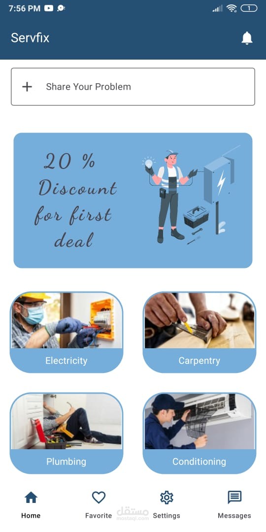 ServFix هو تطبيق Android أصلي يربط بين المستخدمين ومقدّمي الخدمات المنزلية مثل السباكين، الكهربائيين، فنّيي التكييف، والنجّارين، من خلال واجهة سهلة وحديثة. التطبيق يهدف لحل مشكلة العثور على مقدّمي خدمات موثوقين بسرعة وتنظيم عمليات الطلب، التواصل، وتقييم الخدمة.