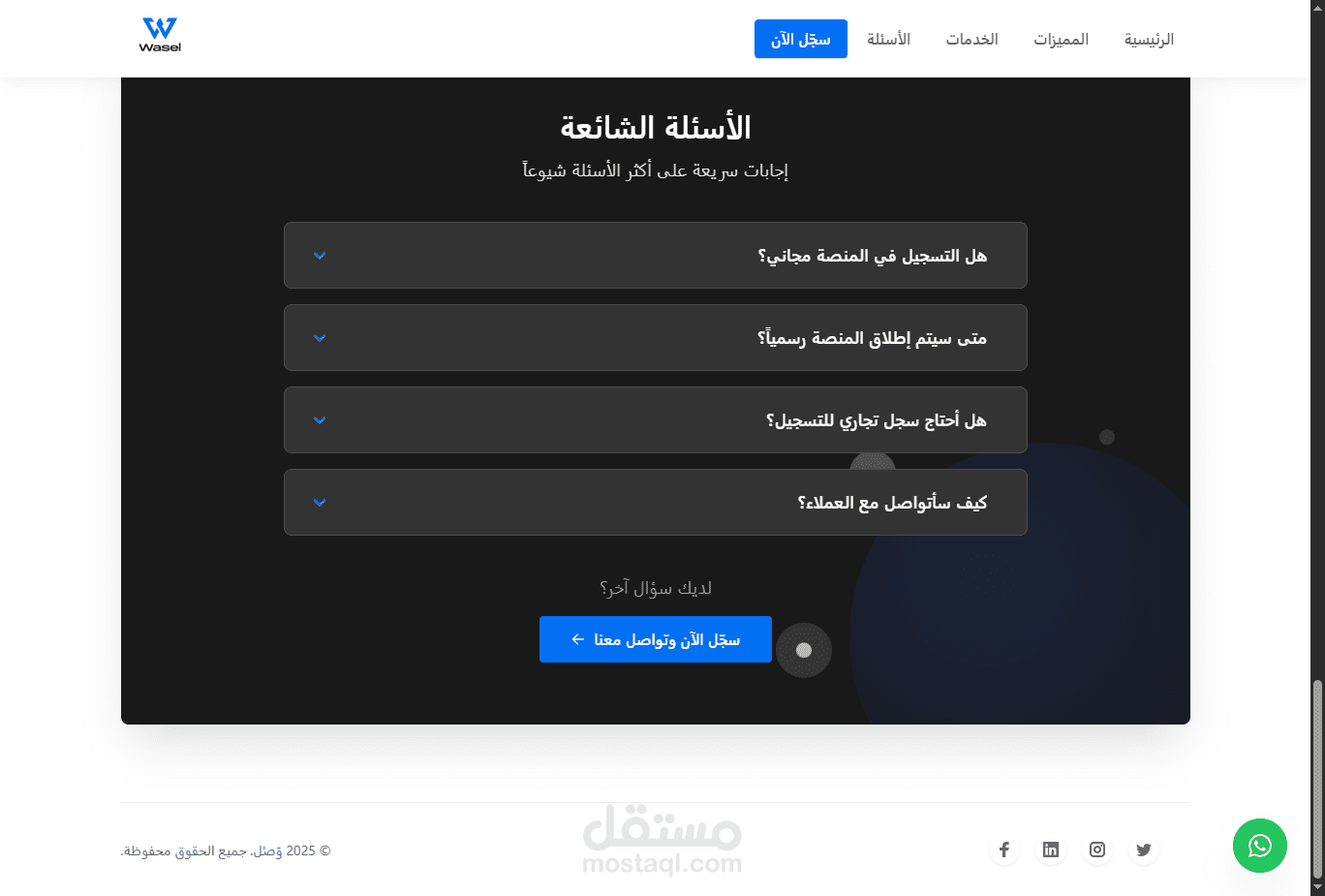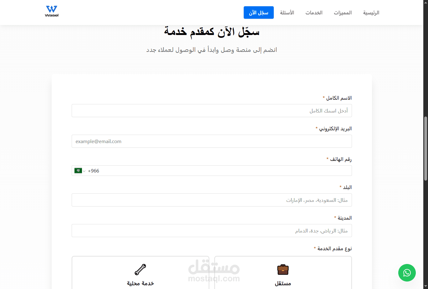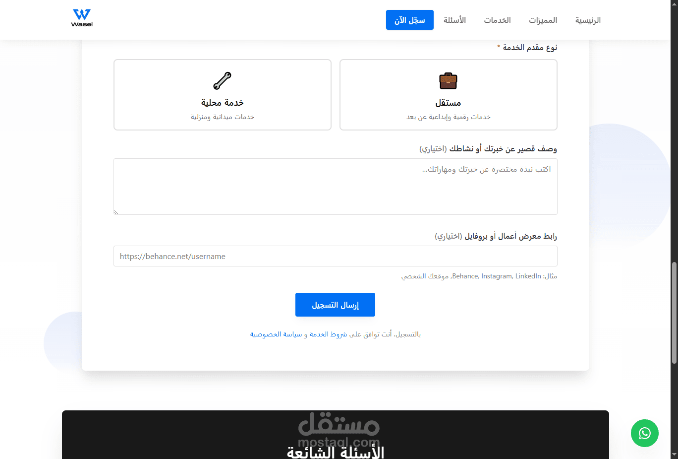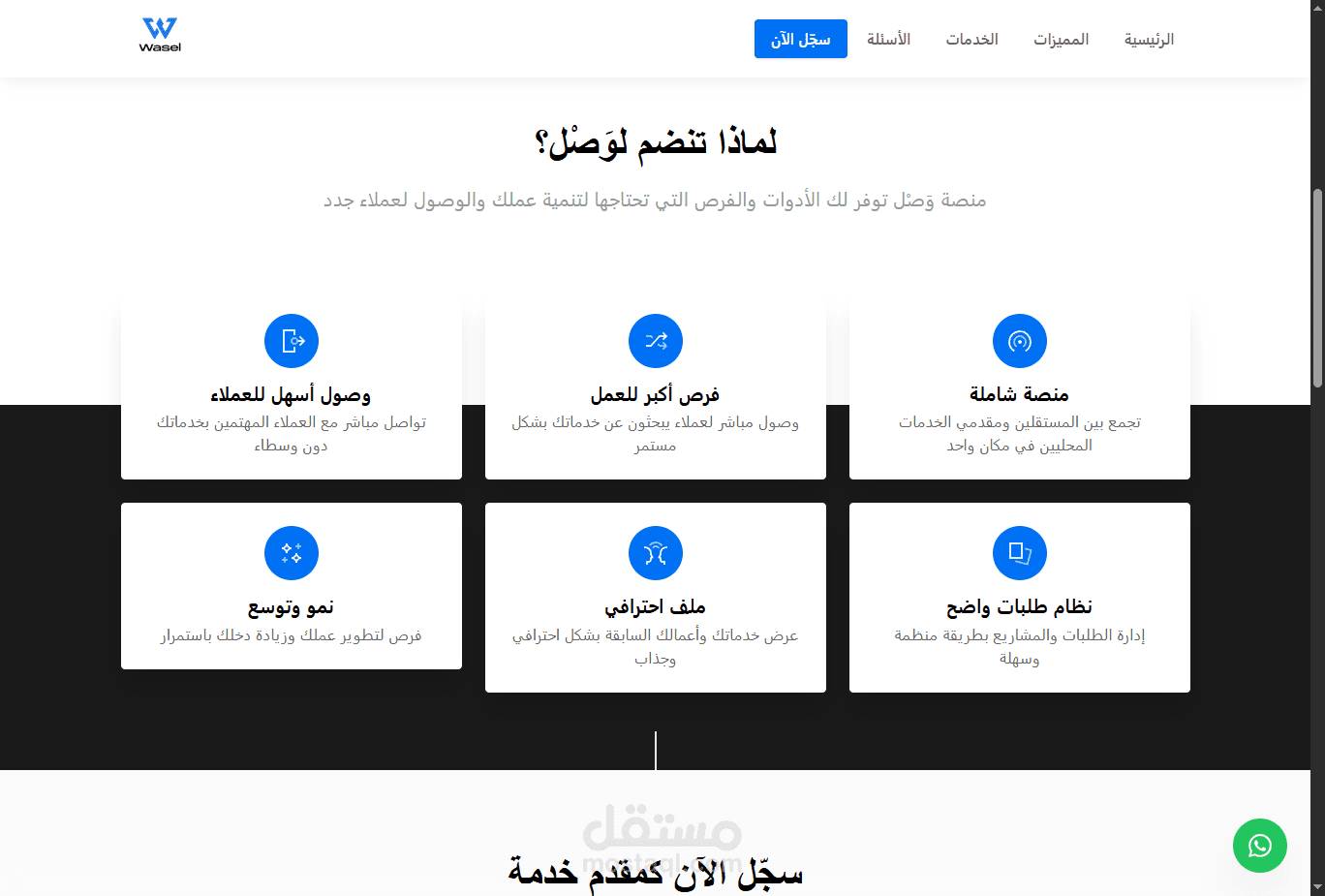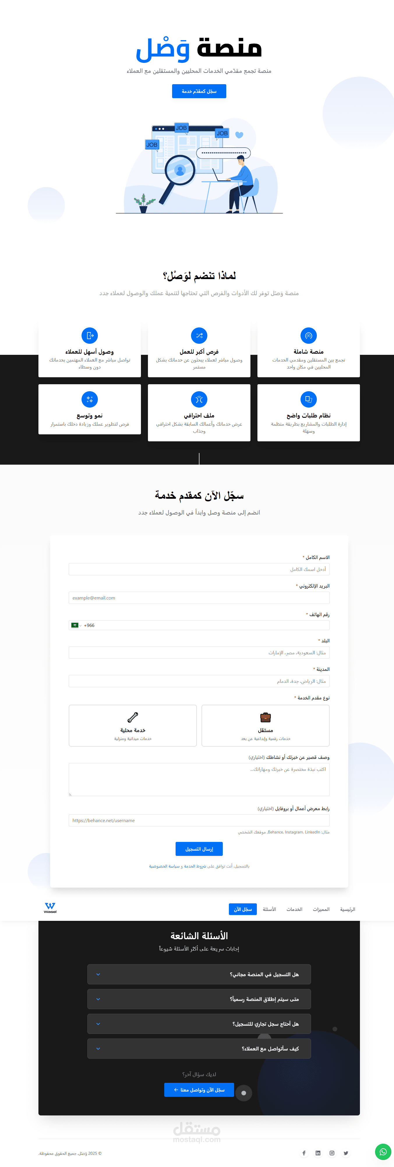 تصميم وتطوير صفحة هبوط متكاملة لمنصة "وَصْل"، وهي منصة سعودية تهدف لربط مقدمي الخدمات المستقلين والمحليين بالعملاء.