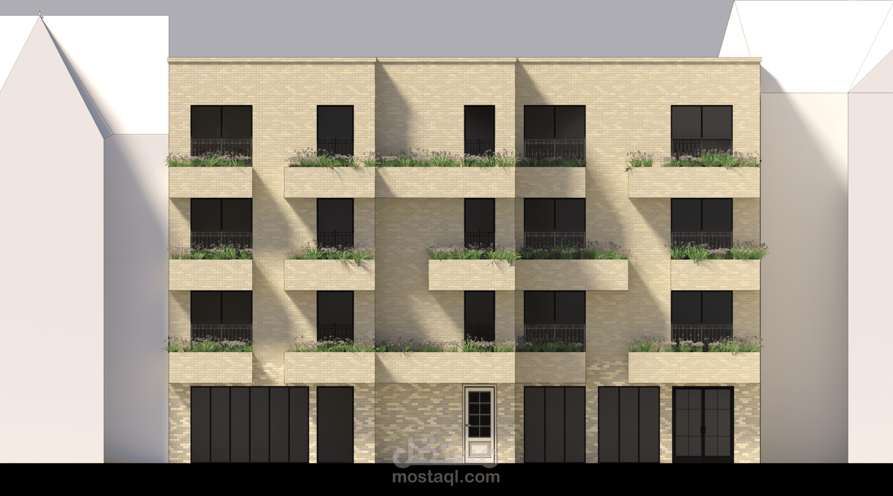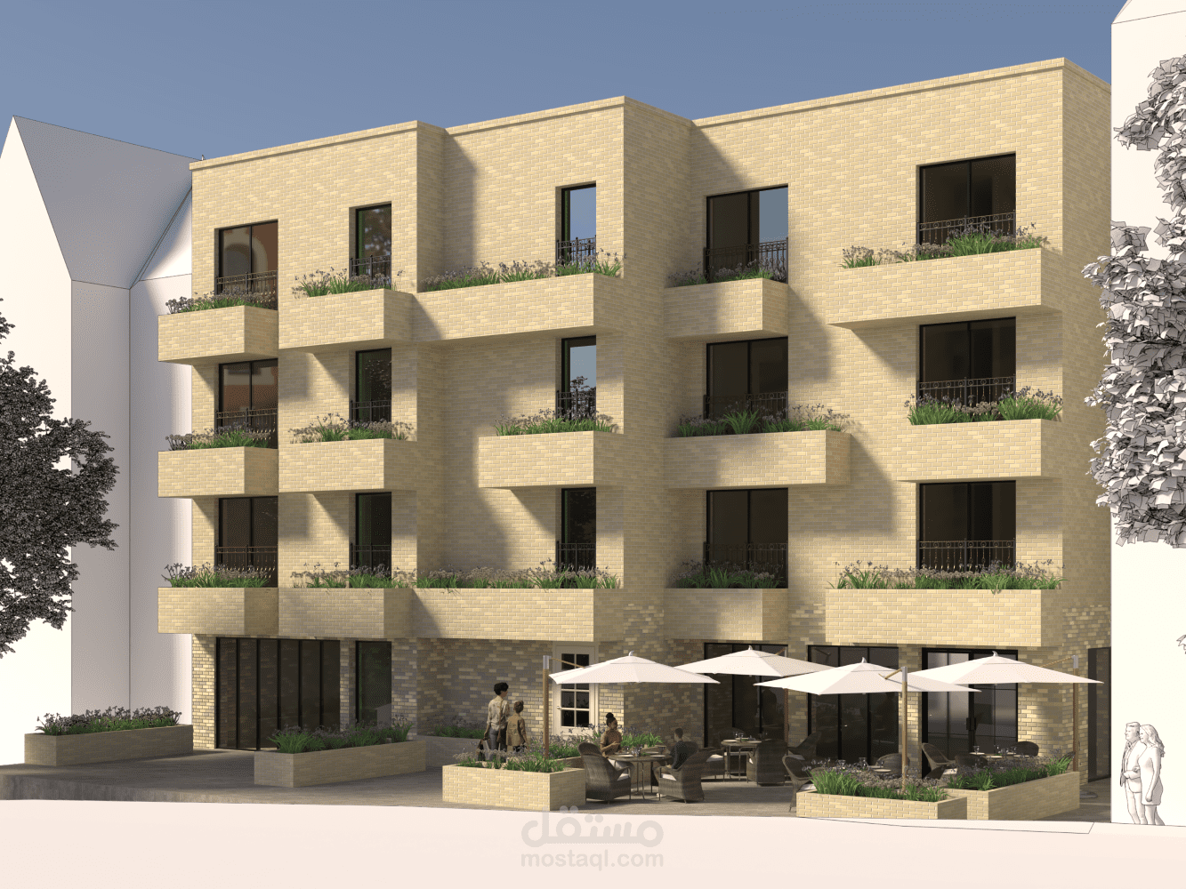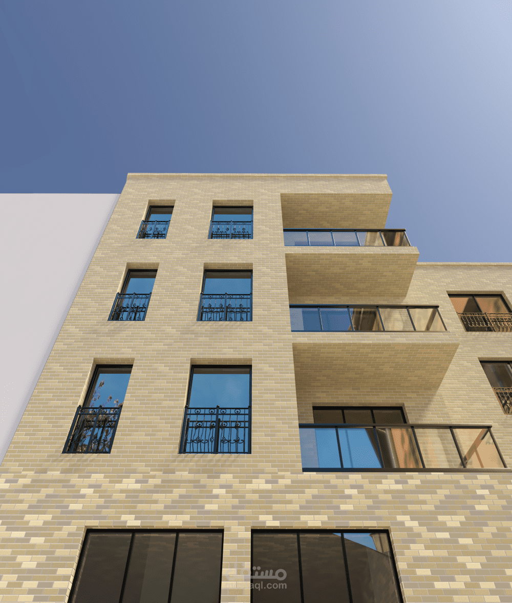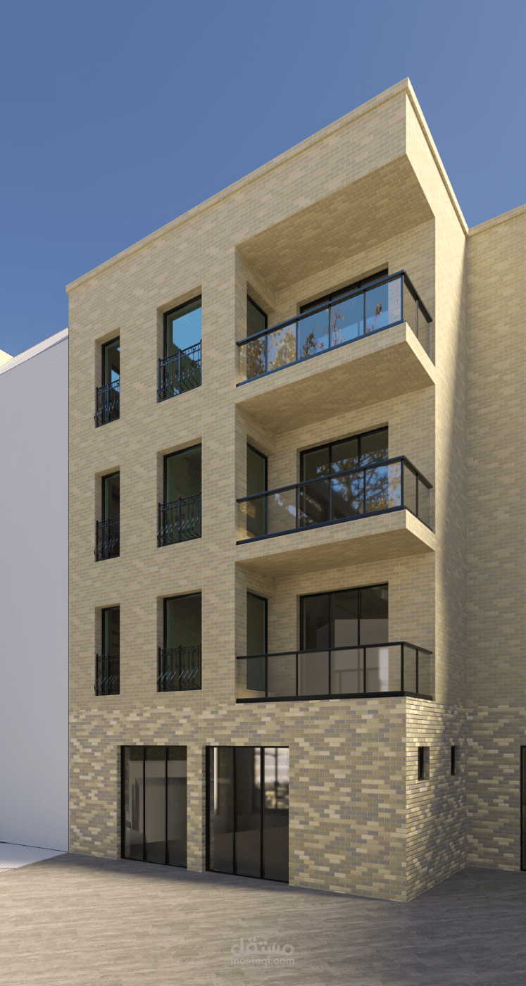 بناء سكني تجاري يجمع بين الحجر الأنيق والخطوط المعمارية الواضحة, وهو مؤلف من طابق تجاري أرضي و3 طوابق سكنية.