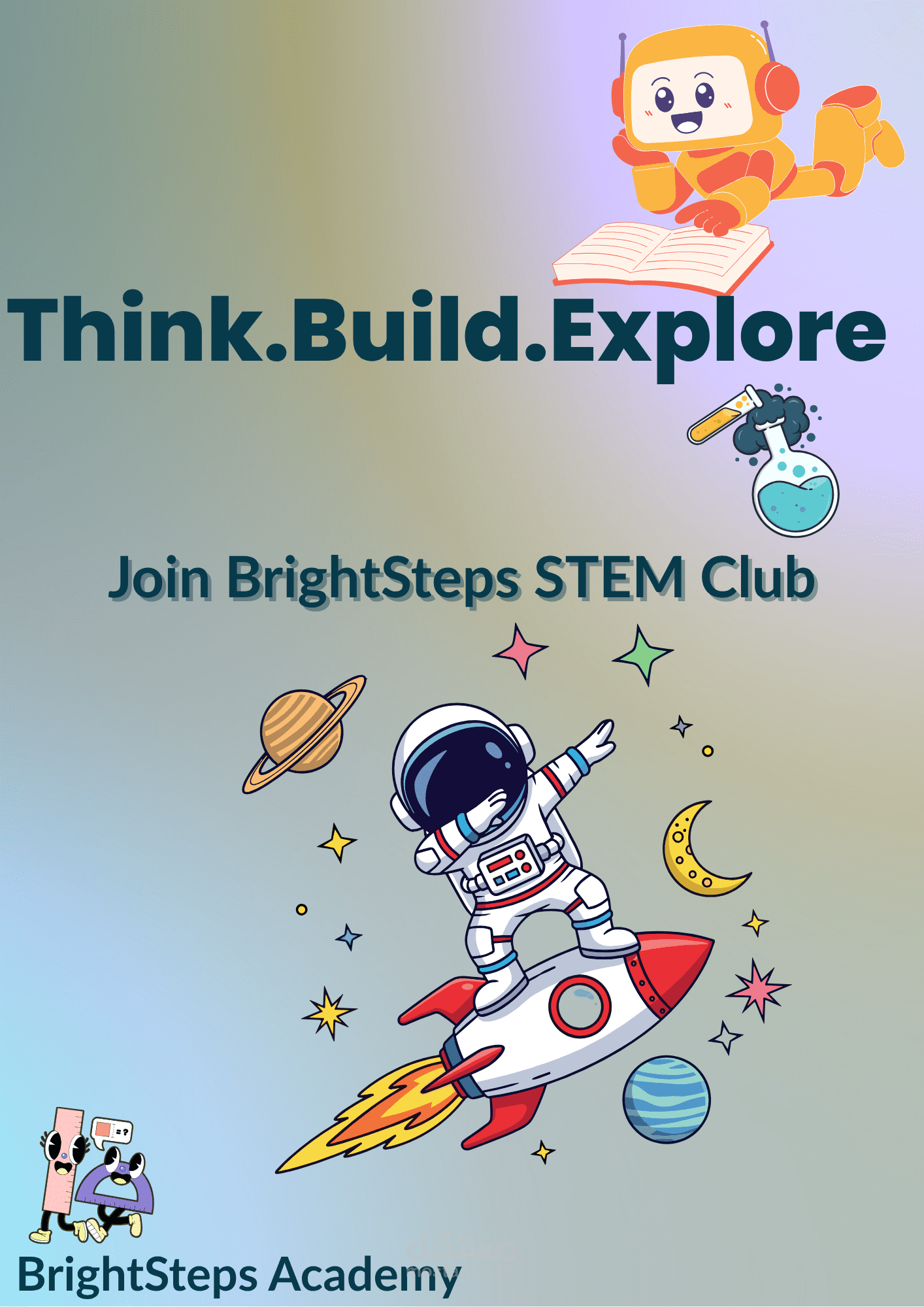 تصميم بوستر لنادي "STEM Club" التعليمي للأطفال، بأسلوب يعتمد على الخيال العلمي والرسوم الكرتونية الفضائية. تم استخدام رسومات جذابة (رائد فضاء، كوكب، روبوت) وعبارات تحفيزية (Think. Build. Explore.) لجذب الأطفال وحثهم على الانضمام. التصميم يجمع بين الإثارة التعليمية والمرح، وهو مصمم لـ إثارة الفضول واهتمام الفئة العمرية المستهدفة.