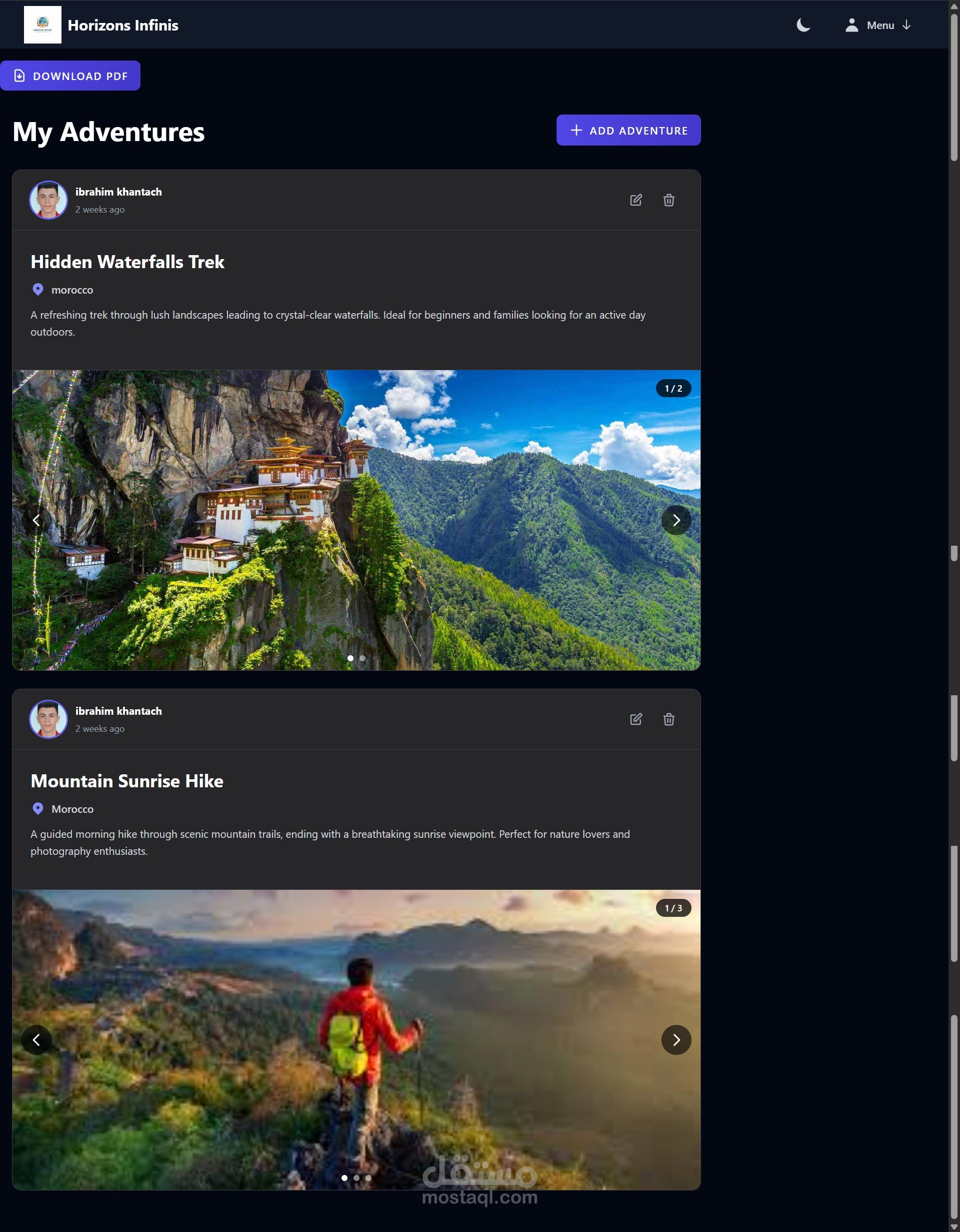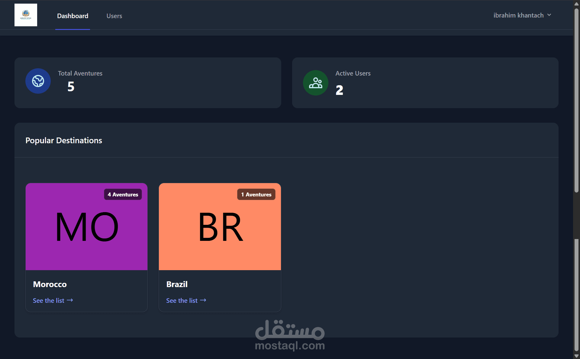 منصة المغامرات هي تطبيق ويب يتيح للمستخدمين اكتشاف المغامرات وإضافتها. تتميز بواجهة سهلة الاستخدام، ونظام مصادقة آمن، وقاعدة بيانات للمغامرات. كما تتضمن المنصة إحصائيات عن المغامرات والمستخدمين.