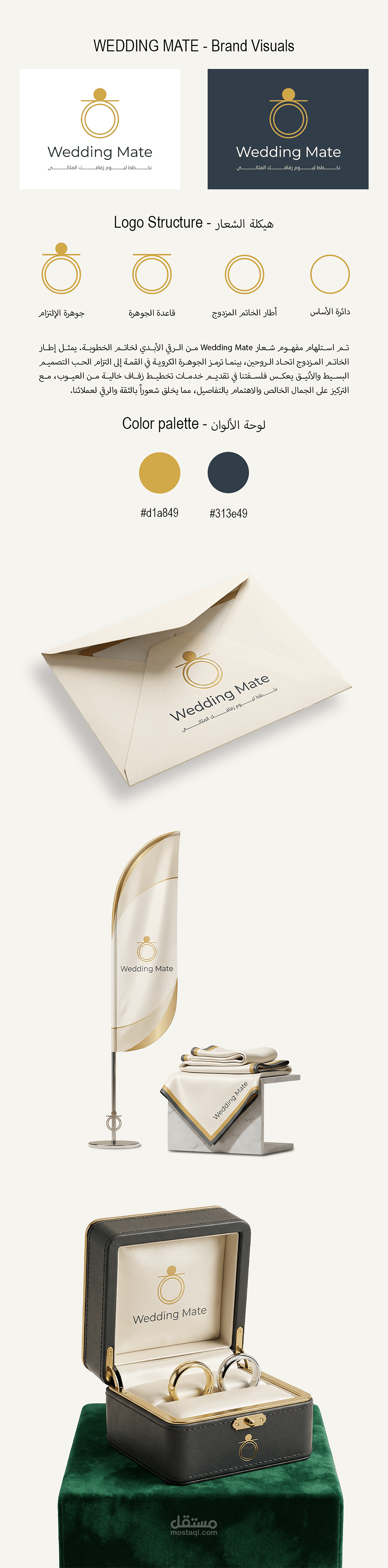 تم استلهام مفهوم شعار Wedding Mate من الرقي الأبدي لخاتم الخطوبة. يمثل إطار الخاتم المزدوج اتحاد الروحين، بينما ترمز الجوهرة الكروية في القمة إلى التزام الحب. التصميم البسيط والأنيق يعكس فلسفتنا في تقديم خدمات تخطيط زفاف خالية من العيوب، مع التركيز على الجمال الخالص والاهتمام بالتفاصيل، مما يخلق شعوراً بالثقة والرقي لعملائنا.