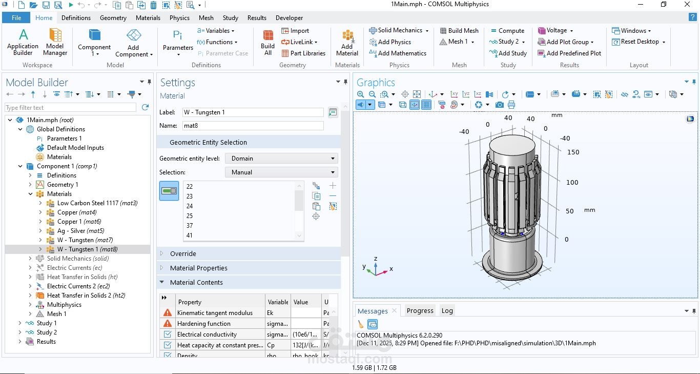 Thermal and electromagnetic simulation of an SF₆ circuit breaker in the closed position, including dynamic motion modeling and arc visualization, performed using COMSOL Multiphysics. This project involved detailed analysis of thermal stresses, electromagnetic fields, contact movement, and arc behavior under operational conditions. The study showcases my ability to execute advanced multiphysics simulations, interpret complex field interactions, and deliver high-fidelity models for performance evaluation and design optimization.
