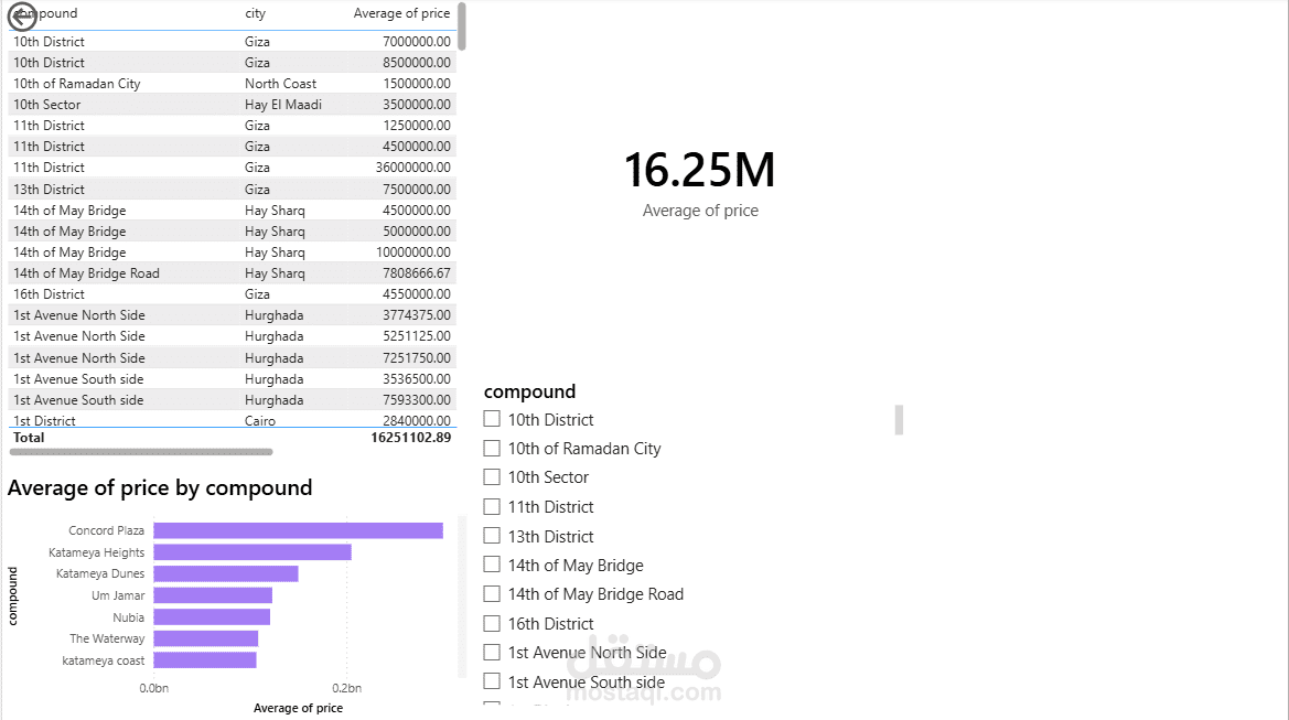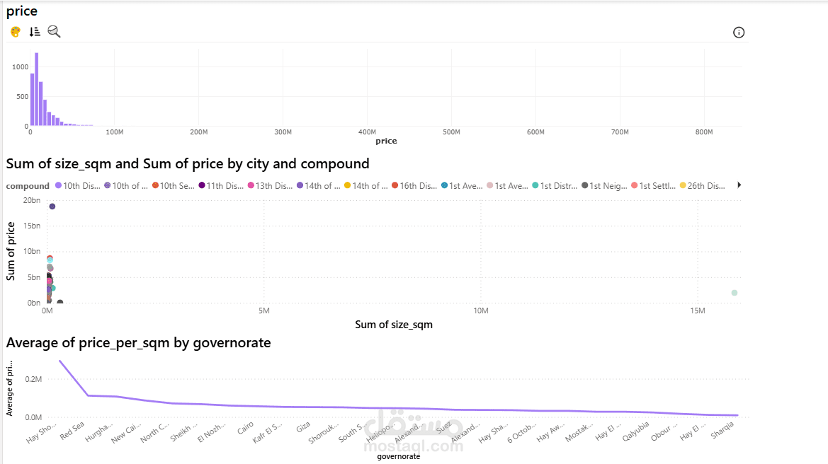 ذا كان داش بورد لتحليل العقارات بمصر و لكن تم بعد معملت موديل ذكاء اصطناعي segment بناء علي مستوي العقارات اذا كانت غالية ام متوسطة و طبعا مبنية علي قرارات مختلفة زي الاسعار و المكان و المساحات