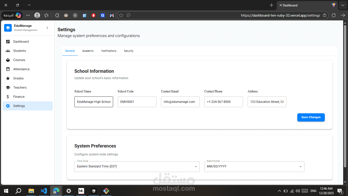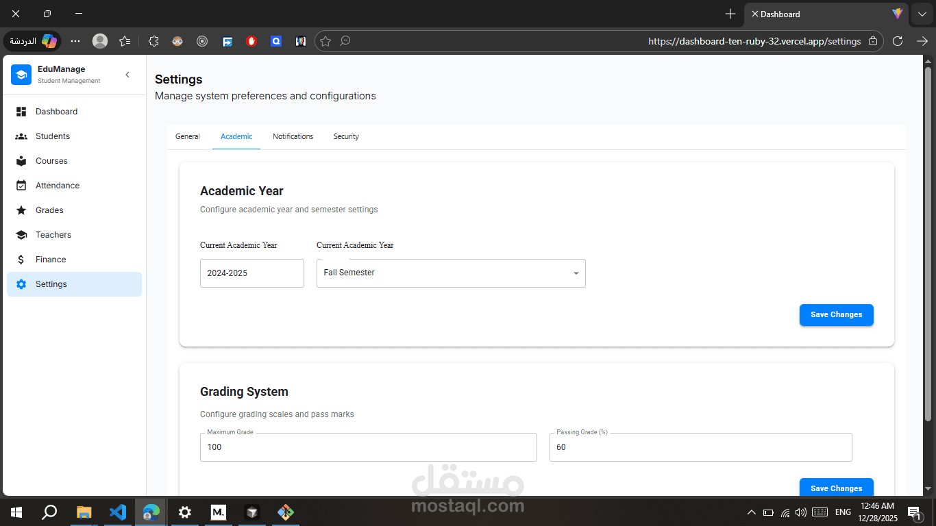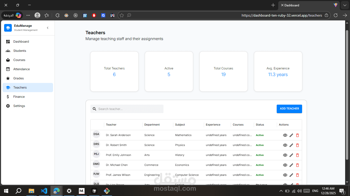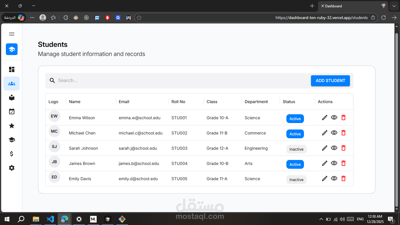 تم تصميم وتطوير لوحة تحكم متكاملة لإدارة بيانات الطلاب، الأقسام، الحضور والدرجات، مع واجهة مستخدم سلسة وسهلة الاستخدام. المشروع يتيح إضافة وتعديل وحذف البيانات بطريقة منظمة مع الحفاظ على تجربة المستخدم.