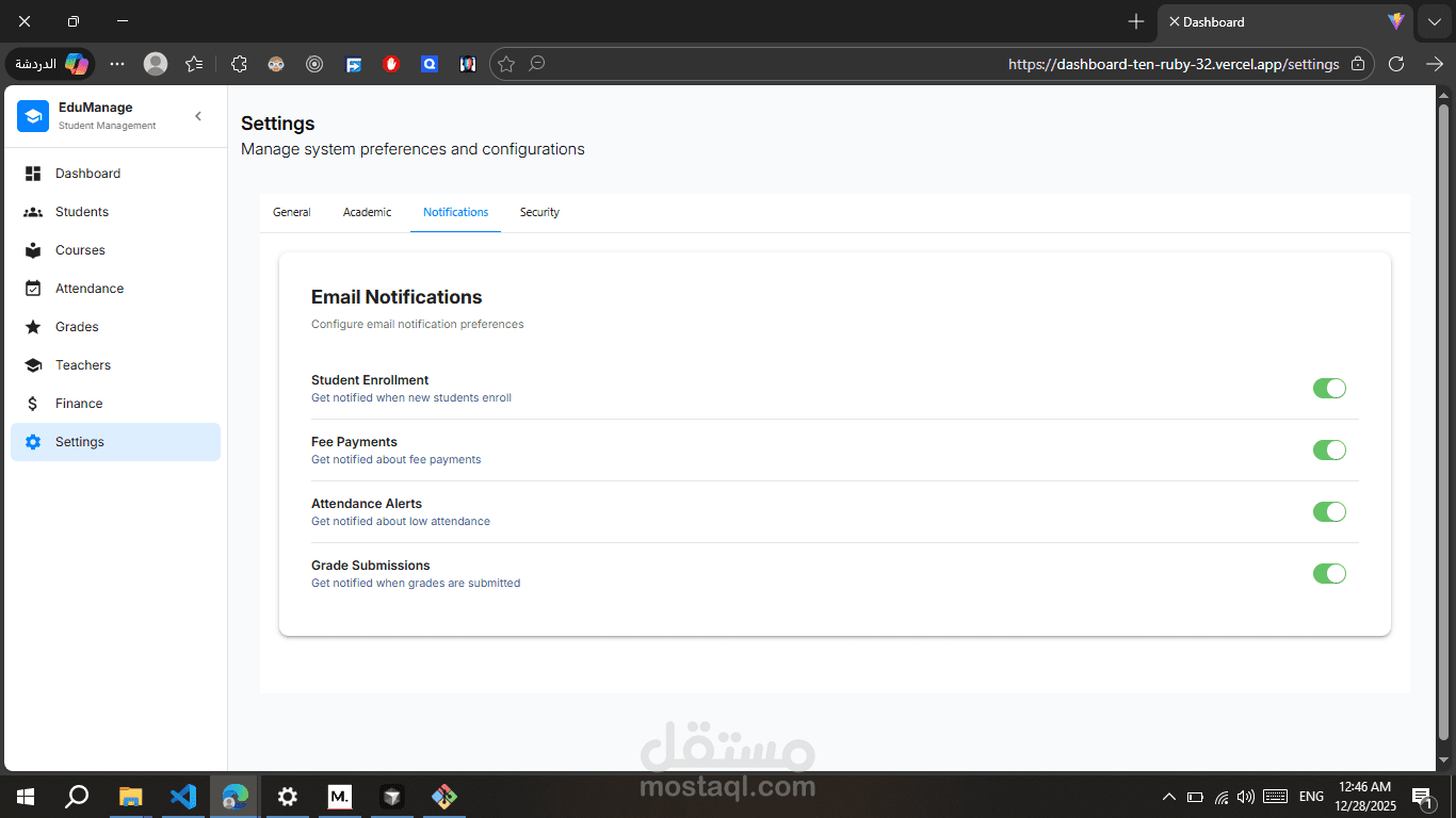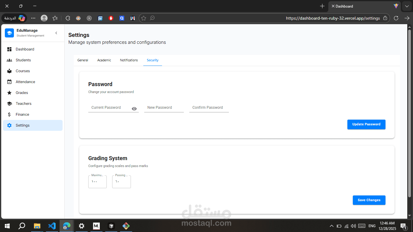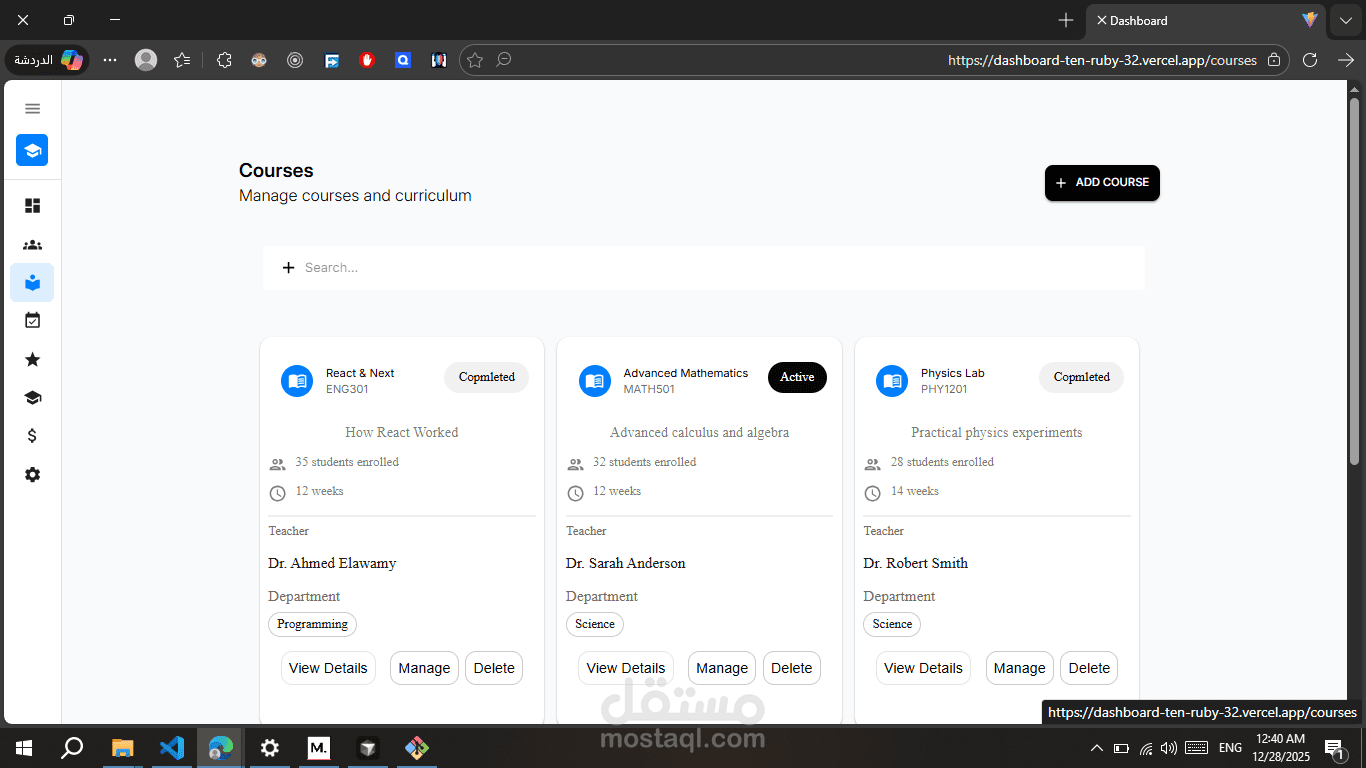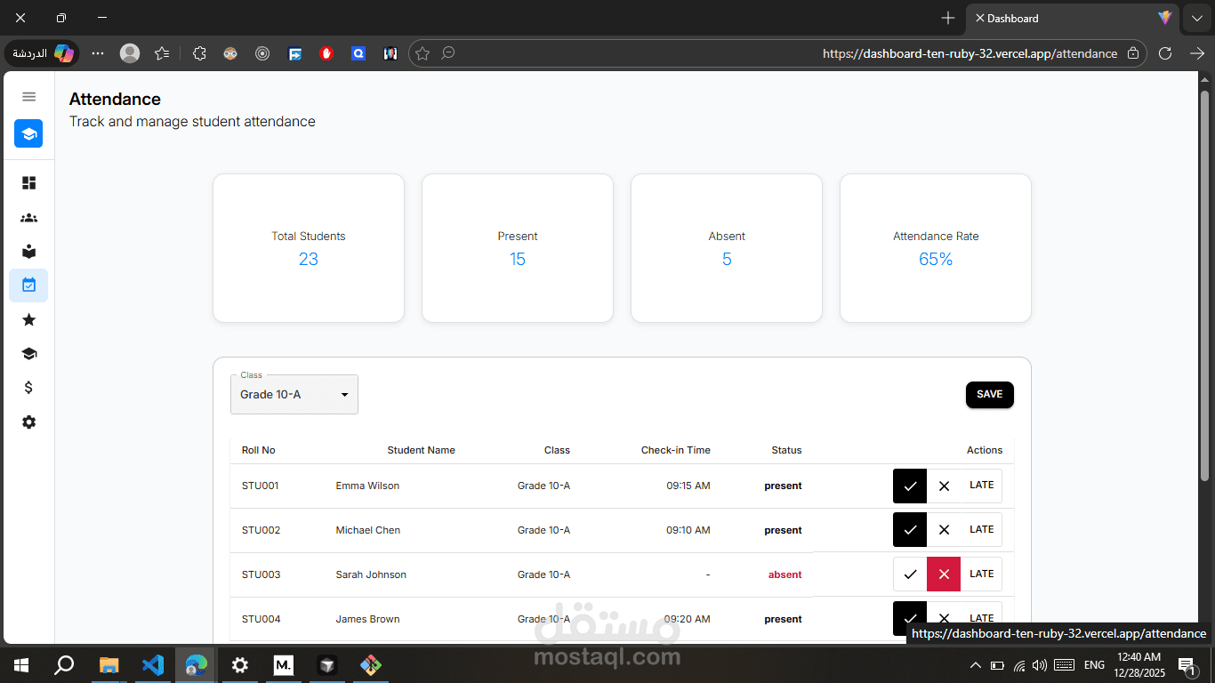 تم تصميم وتطوير لوحة تحكم متكاملة لإدارة بيانات الطلاب، الأقسام، الحضور والدرجات، مع واجهة مستخدم سلسة وسهلة الاستخدام. المشروع يتيح إضافة وتعديل وحذف البيانات بطريقة منظمة مع الحفاظ على تجربة المستخدم.