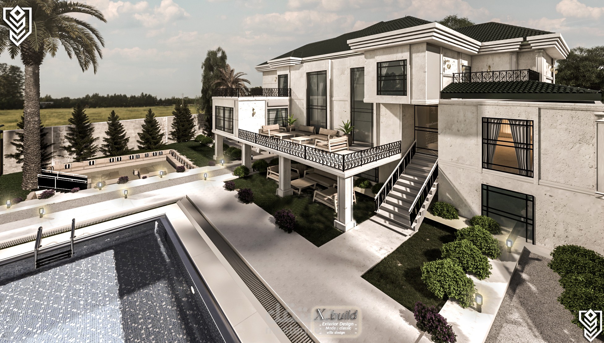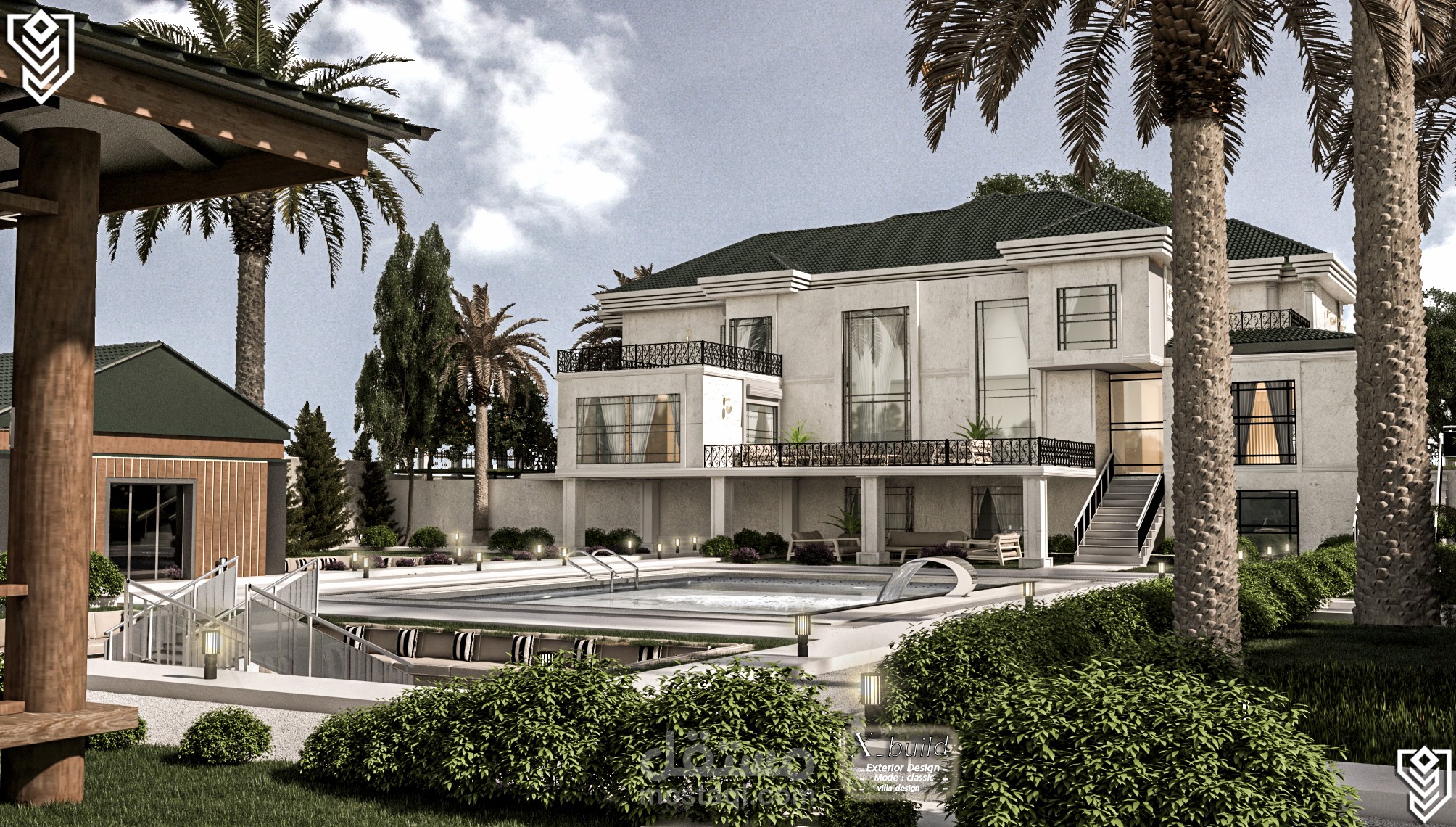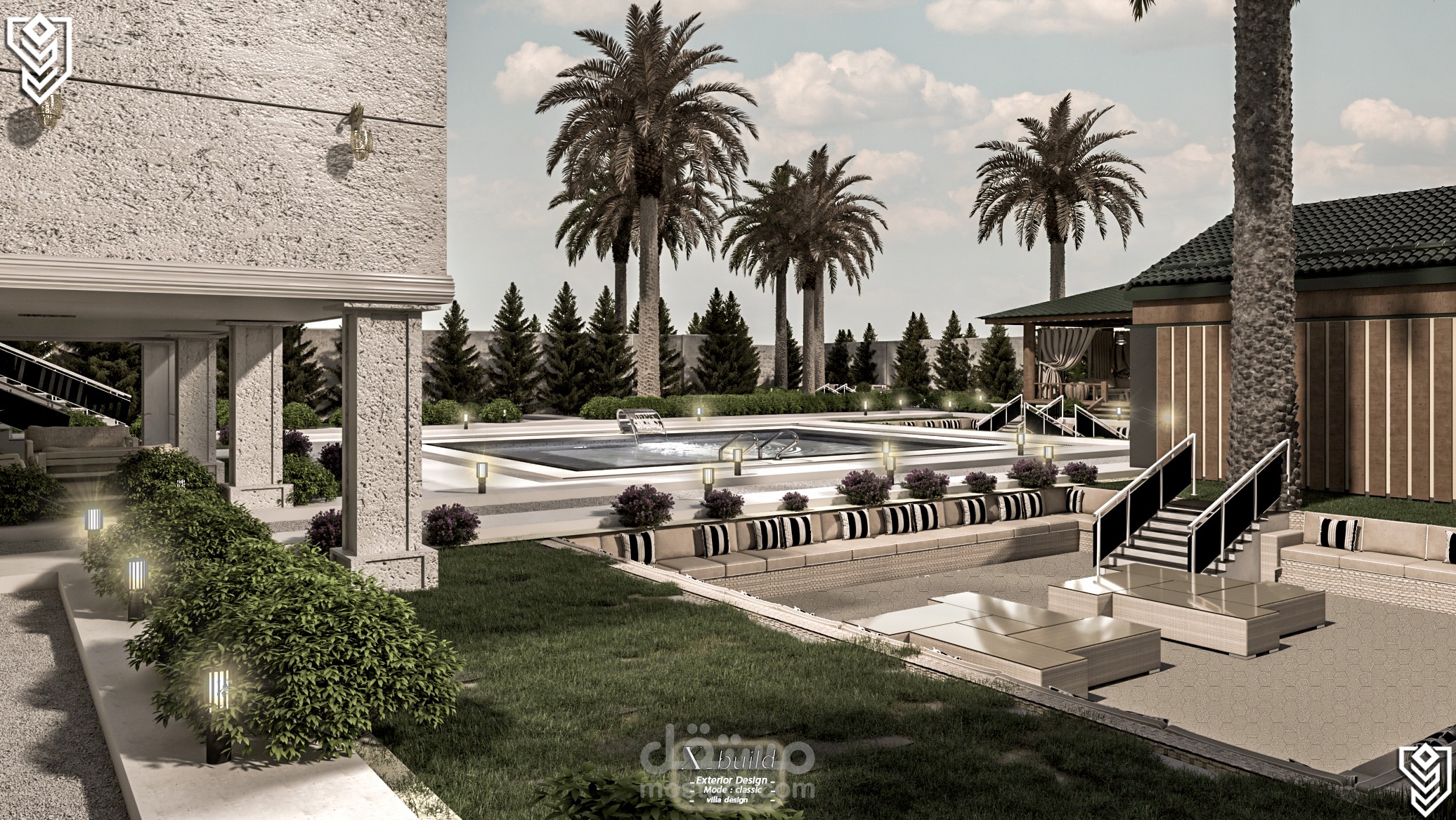 بصفتي المصمم الرئيسي، وضعتُ رؤية متكاملة لفيلا كلاسيكية فاخرة على أرض منحدرة بلطف، فابتكرتُ شرفات تُعزز جمال التصميم والمناظر الطبيعية على حد سواء. يتميز التصميم الخارجي بأعمال حجرية راقية، وأعمدة كلاسيكية، وفتحات واسعة تسمح بدخول الضوء الطبيعي. أما التصميم الداخلي، فيجمع بين المساحات الرحبة والتشطيبات الفاخرة ليعكس ذوقًا عصريًا أنيقًا. وتُضفي المناظر الطبيعية لمسة جمالية متكاملة من خلال حدائق متدرجة، وممرات انسيابية، وإضاءة تُبرز روعة التصميم المعماري ليلًا.