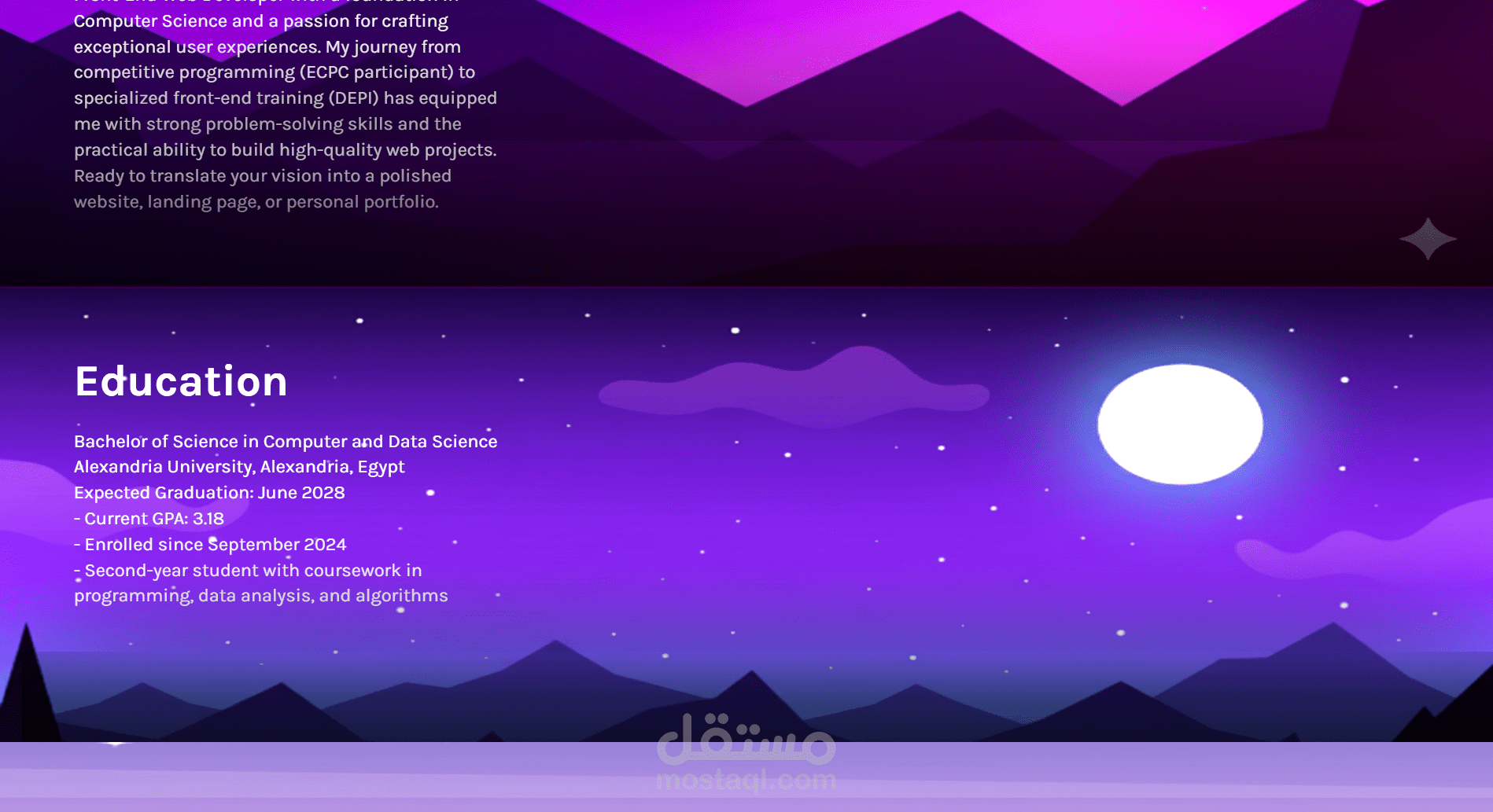 يمثّل البورتفوليو خطوة مهمة لتعزيز حضوري الرقمي كمطور ويب، وإظهار قدرتي على إنشاء واجهات حديثة، سريعة، ومتناسقة، مع الاهتمام بأدق التفاصيل في التصميم والتجربة البصرية.