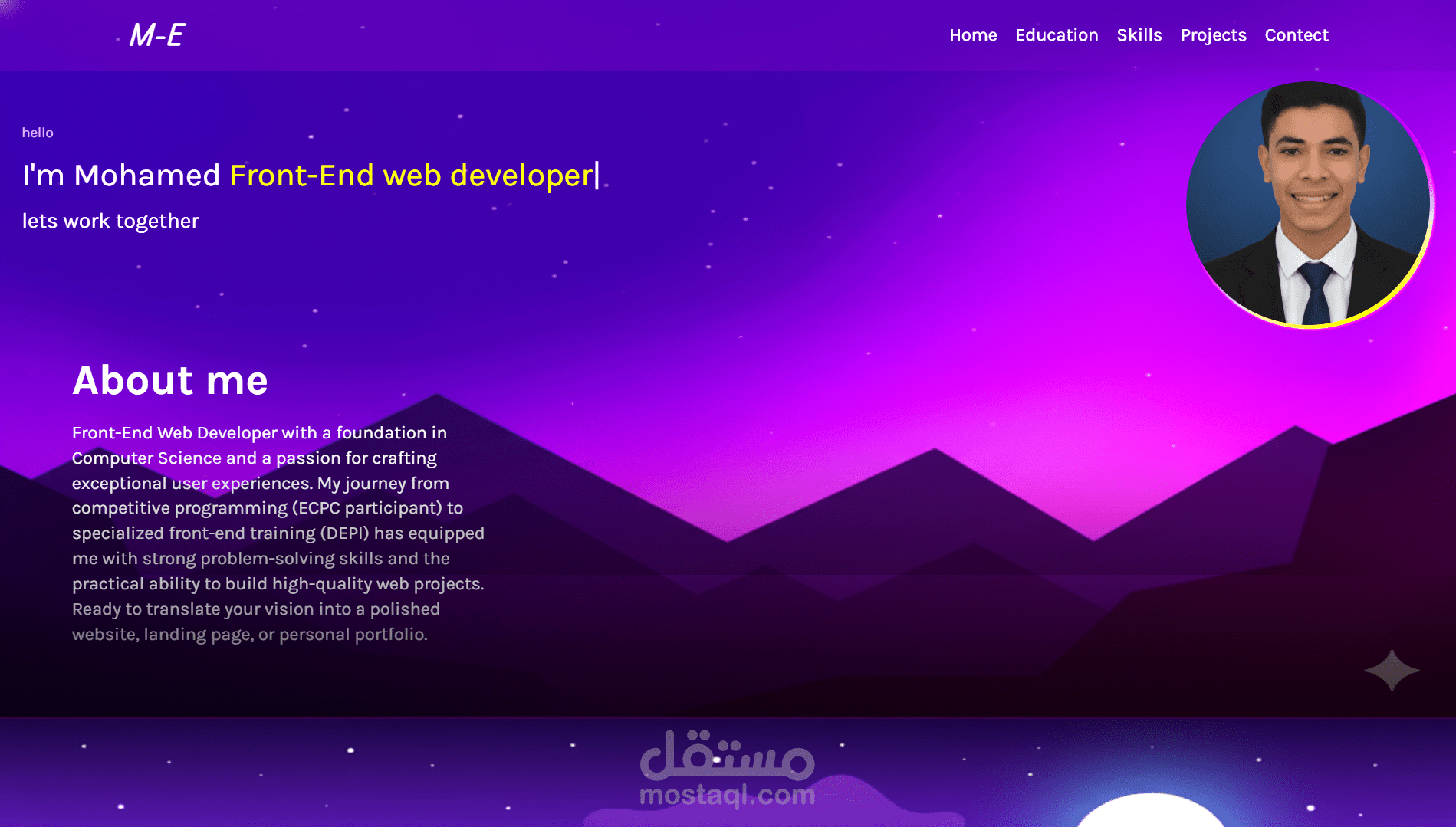 هذا البورتفوليو هو مساحة شخصية أستعرض فيها مهاراتي كمطوّر واجهات أمامية (Front-End Developer)، من خلال تصميم بسيط، نظيف، وسهل التصفح. تم بناء الموقع باستخدام HTML وCSS وJavaScript بشكل يمنح الزائر تجربة سلسة ومريحة أثناء استعراض أقسام الموقع.