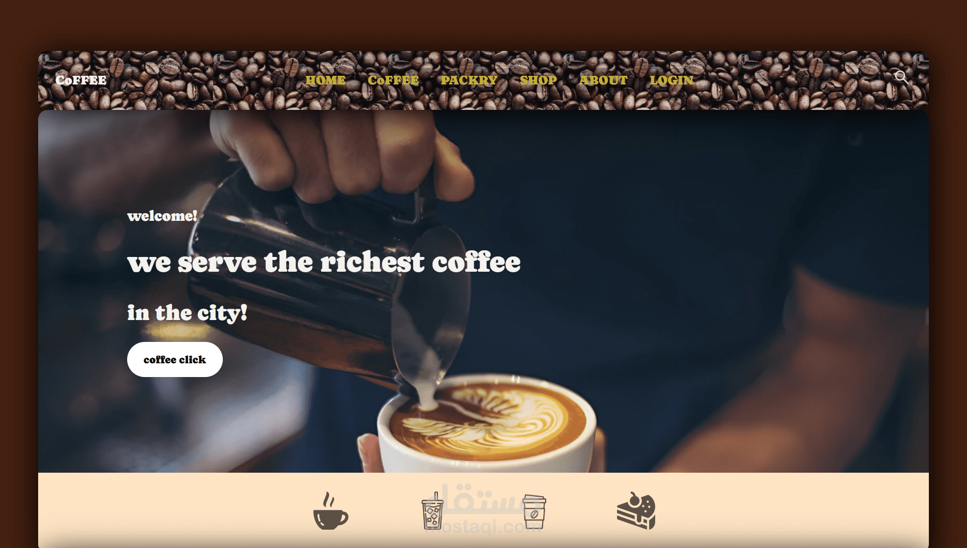 هذا الموقع هو واجهة مميزة وعصرية لعلامة تجارية متخصصة في القهوة، تم تصميمه باستخدام HTML، CSS، وJavaScript ليقدم تجربة بصرية جذابة وسلسة للمستخدم. يعتمد الموقع على أسلوب تصميم حديث، صور عالية الجودة، وألوان دافئة تتماشى مع الطابع العام لمتاجر القهوة.