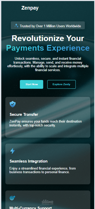 Landing Page لخدمة الدفع الإلكتروني ZenPay تم تطويرها باستخدام HTML وCSS مع تصميم متجاوب بالكامل (Responsive). تشمل الصفحة Navbar، وHero Section، وعرضًا مختصرًا لميزات الخدمة مثل التحويل الآمن، التكامل السلس، ودعم العملات المتعددة، مع تنسيق بسيط ومنظم وتجربة مستخدم واضحة.