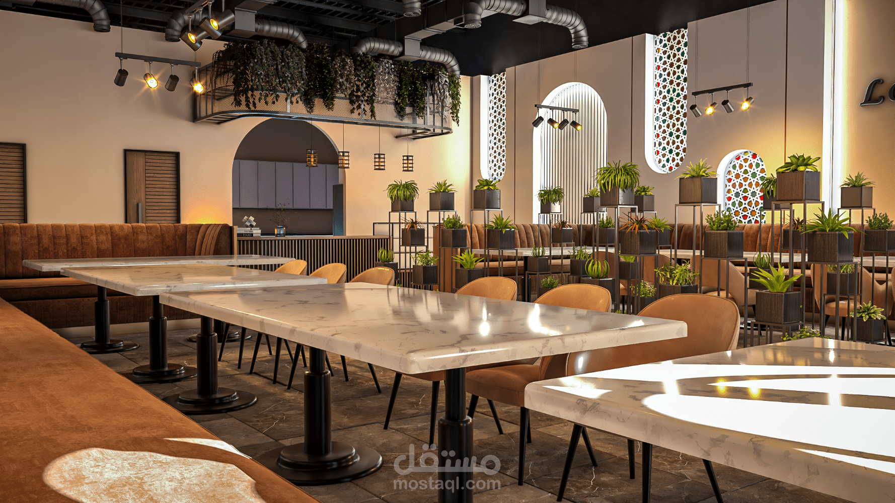تصميم الكافيه في أونتاريو، كندا يجمع بين الطابع العصري والدفء، مع استخدام ألوان ترابية هادئة ولمسات أنيقة. تضيف النباتات الداخلية والأقواس الجدارية ذات الزخارف الهندسية إحساسًا بالحيوية والتميّز، بينما تخلق الإضاءة الدافئة والمقاعد المريحة أجواءً مناسبة للاسترخاء واللقاءات الاجتماعية.