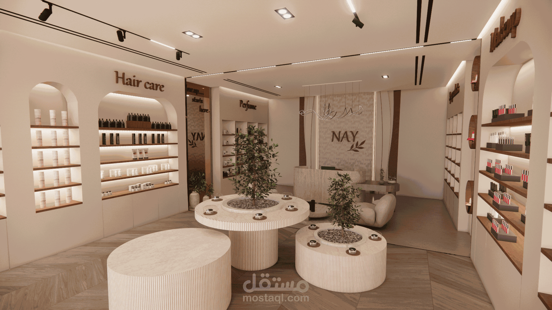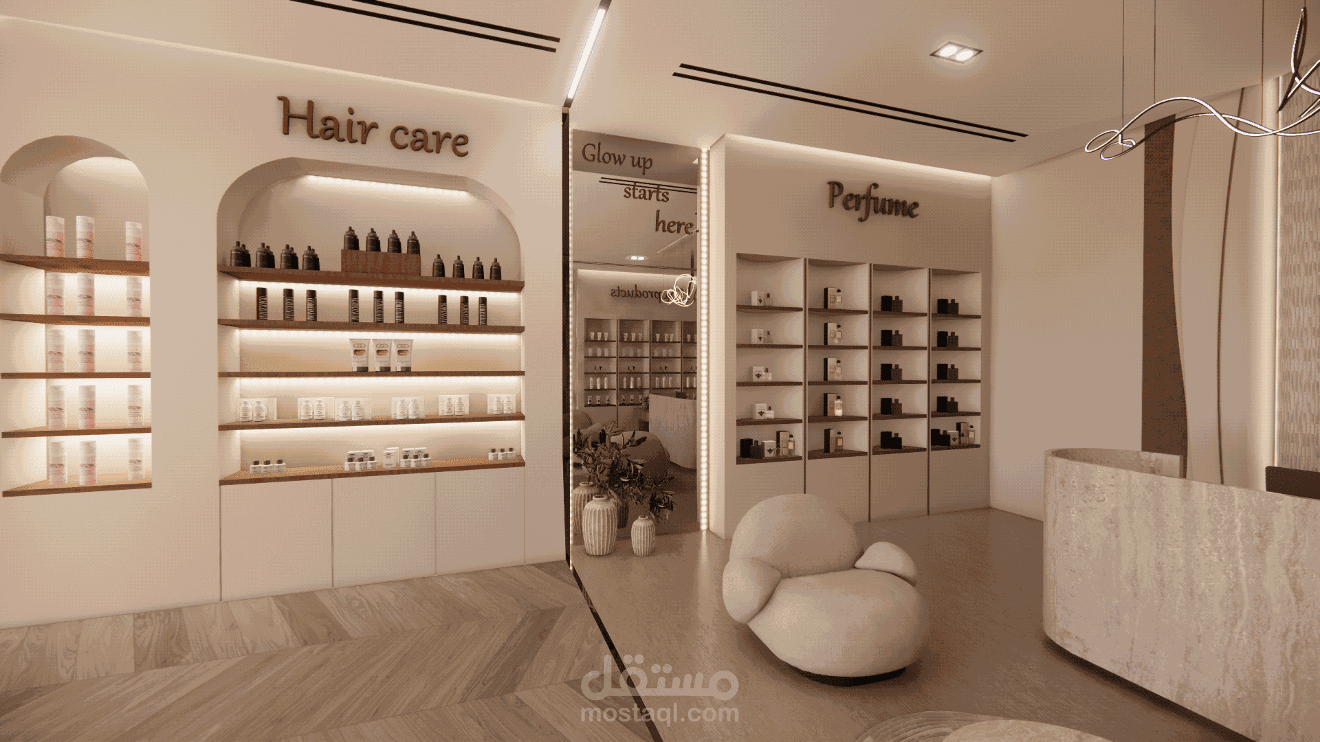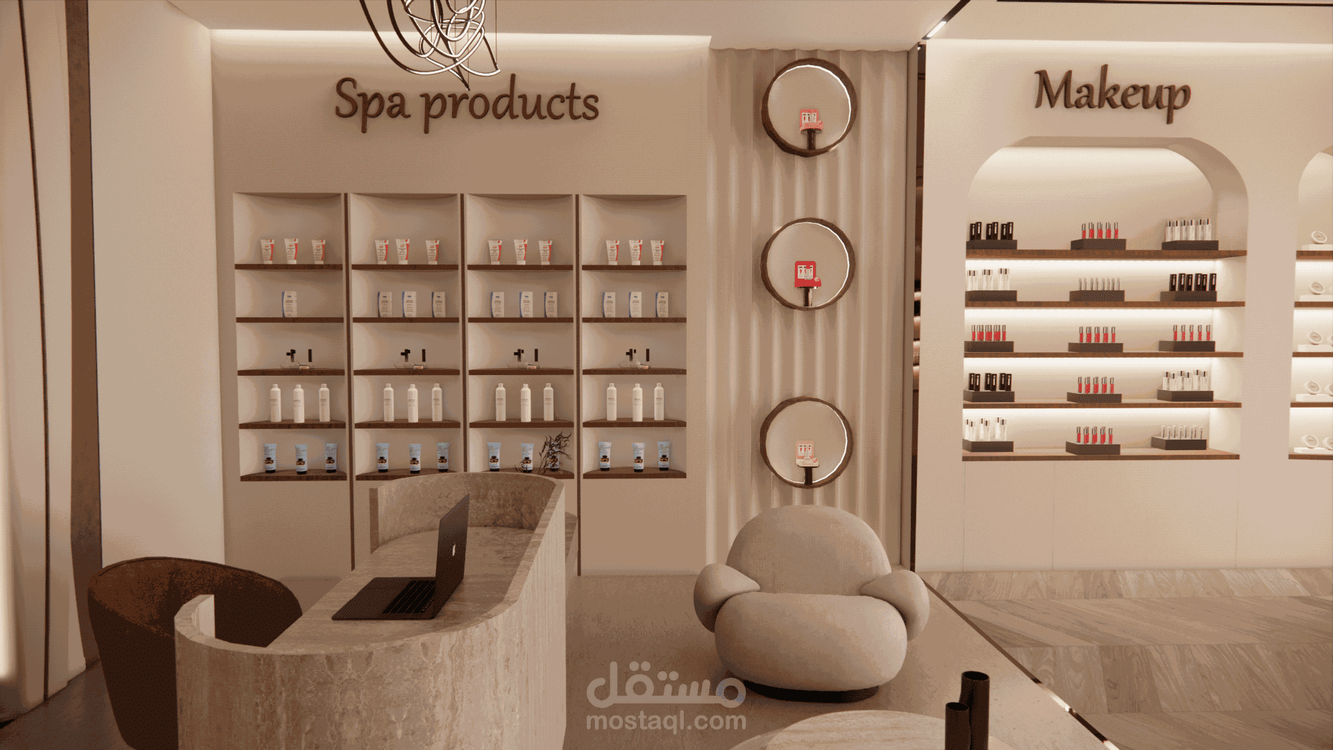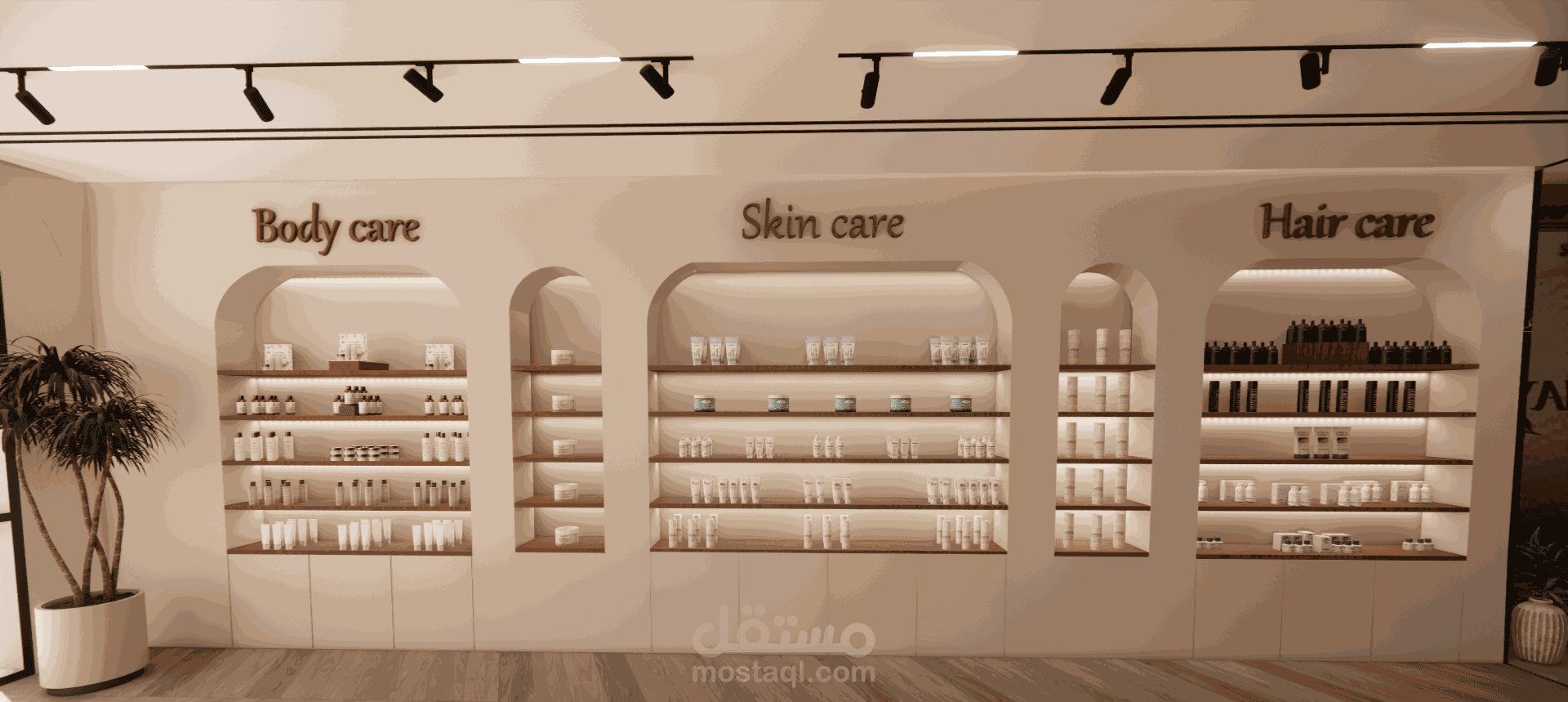 لقد قمت بتصميم محل لمستحضرات التجميل والعناية بالبشرة يجمع بين الحداثة والنعومة وروح الانوثة تم تصميه من البداية بفكرة ثم تطبيق مخطط الاوتوكاد ثم اسكتش اب لرفع المودل ثم رندر