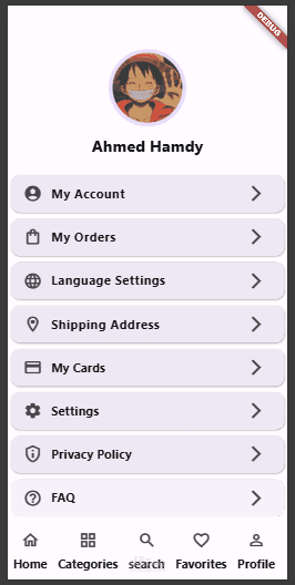 تنفيذ شريط تنقل سفلي ثابت (Fixed BottomNavigationBar) يربط بين الصفحات الرئيسية (Home, Categories, Search, Favorites, Profile) لضمان سهولة الوصول.