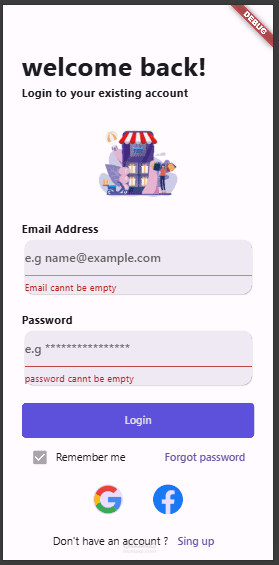 حقول إدخال (بريد إلكتروني وكلمة مرور) مع التحقق من صحة الإدخال (Form Validation) لعرض رسائل الأخطاء (مثل: "Email cannot be empty").