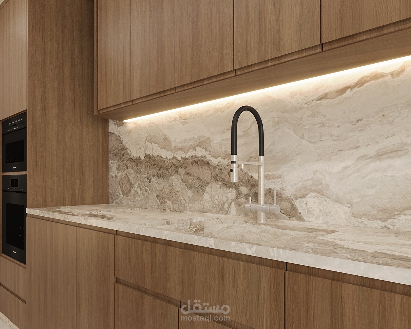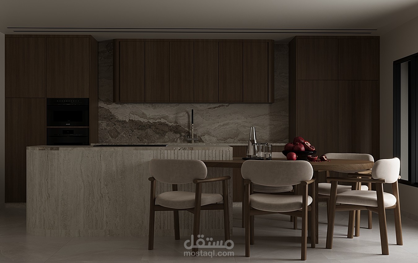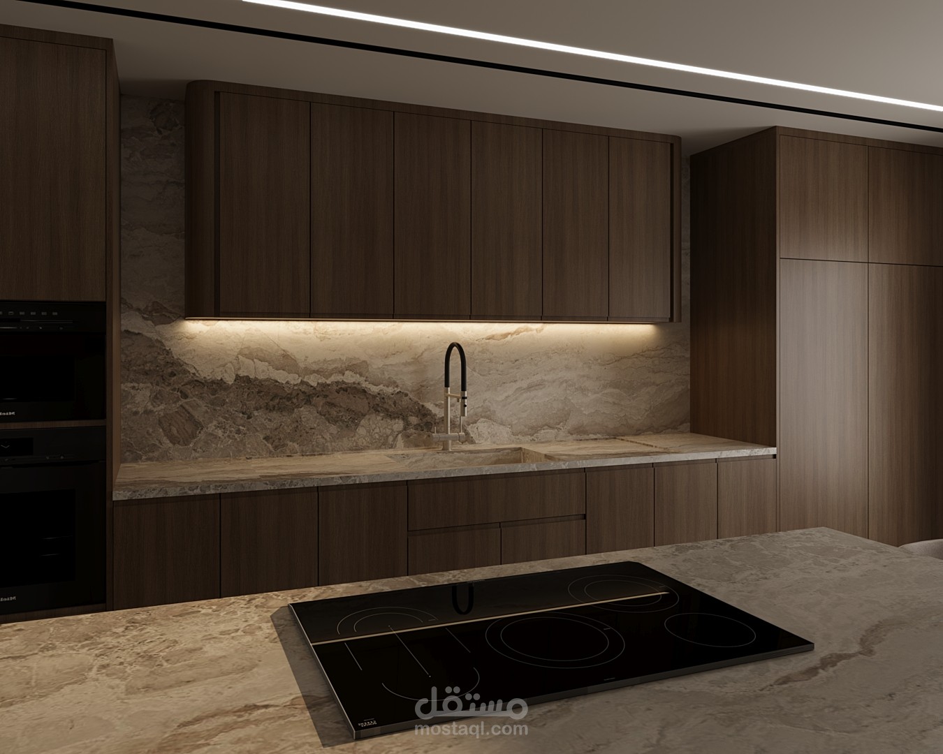 تصميم مطبخ بأسلوب عصري مميز بألوان الخشب الدافئة تناسب اختيار العميل وأختيار الأجهزة بنظام البلت ان والثلاجة المخفيه ودمج الجيزره بطاولة الطعام بأسلوب عملي مميز
