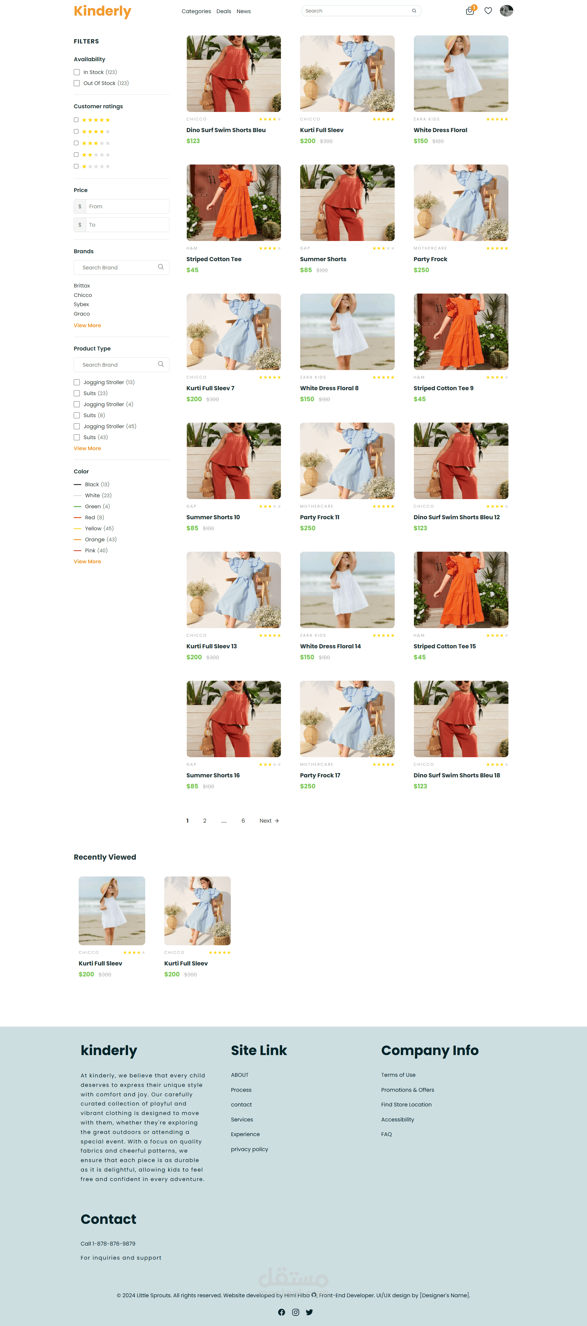 Category Pages: Filters by price, color, brand, availability, and ratings, with grid display and “Recently Viewed” section.