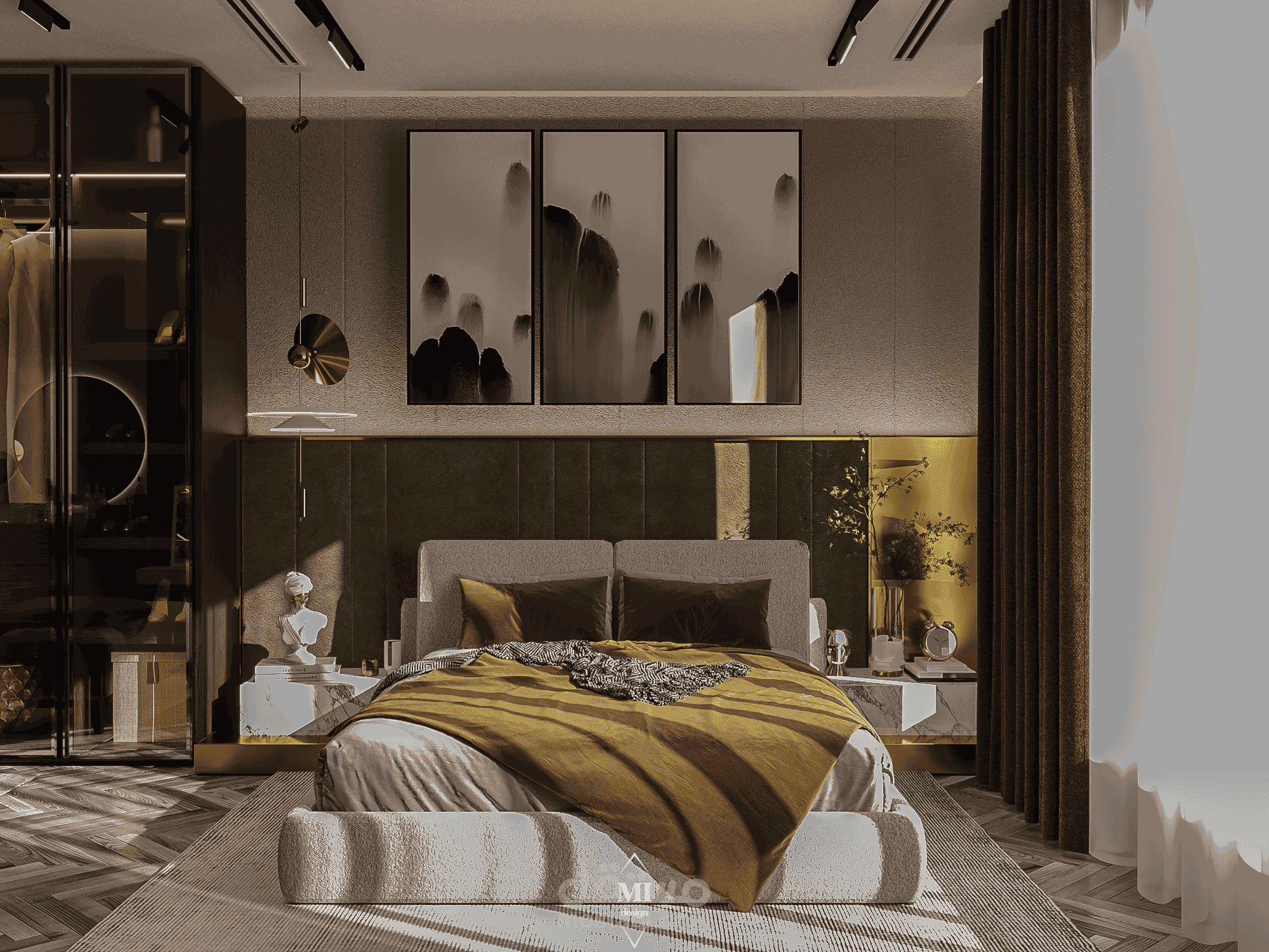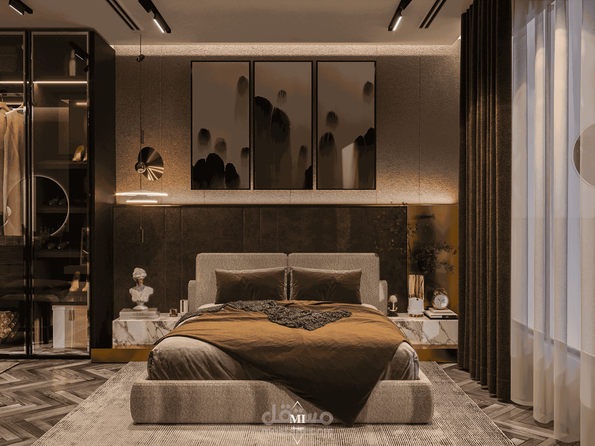تصميم داخلي متكامل لغرفة نوم ماستر تجمع بين الهدوء والفخامة بأسلوب مودرن دافئ.