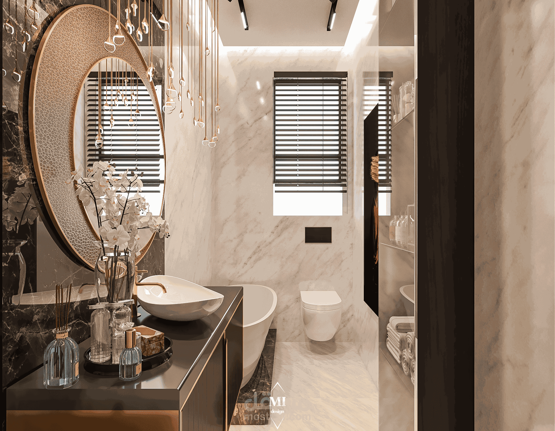 استمرار لنفس روح التصميم باستخدام رخام فاتح للجدران والأرضيات مع لمسات من الرخام الداكن واللون الذهبي في وحدات التخزين والإكسسوارات.