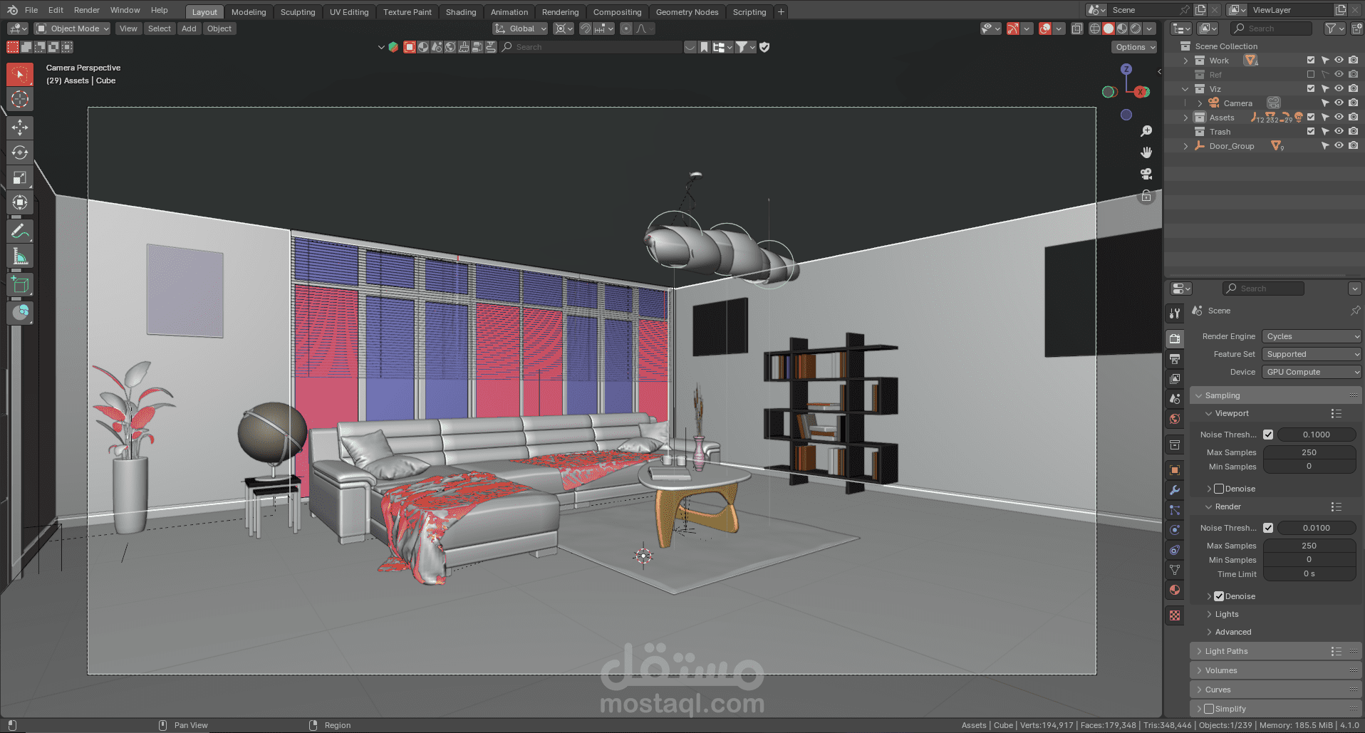 This personal project involved creating an interior render from a 2D lounge room plan inside Blender, covering the 3D modeling, texturing, and rendering.