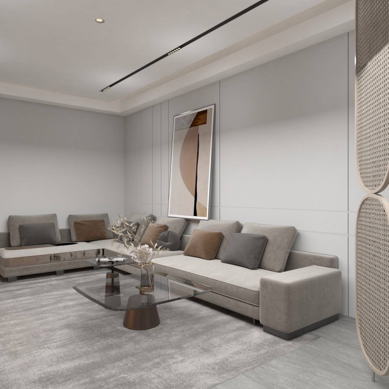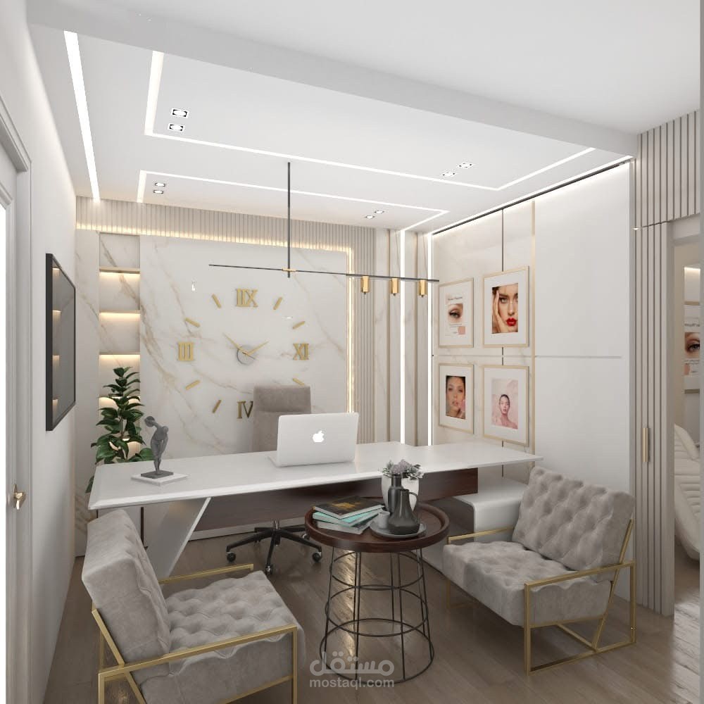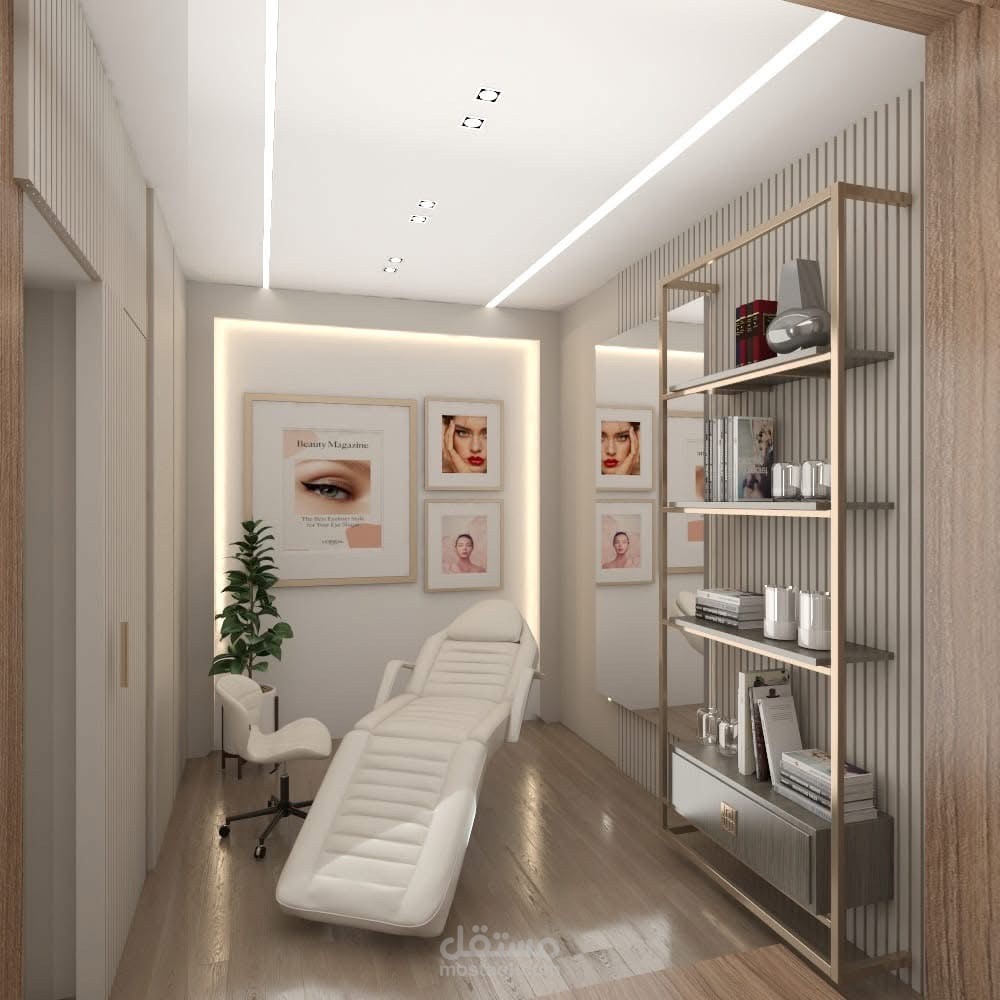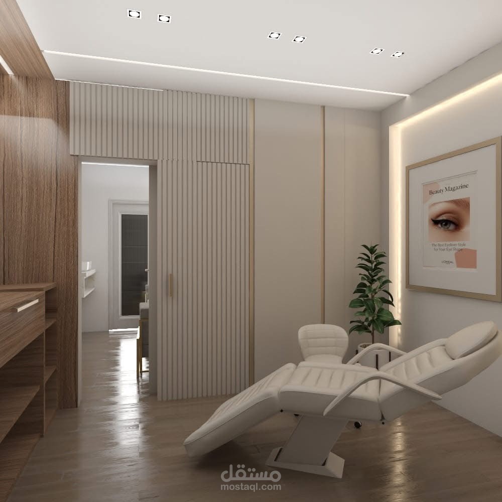 تصميم داخلي لمركز تجميل بأسلوب Modern Wellness يعكس الهدوء والنظافة البصرية، مع اعتماد ألوان فاتحة ولمسات خشبية طبيعية تعزز الإحساس بالراحة والاحترافية.