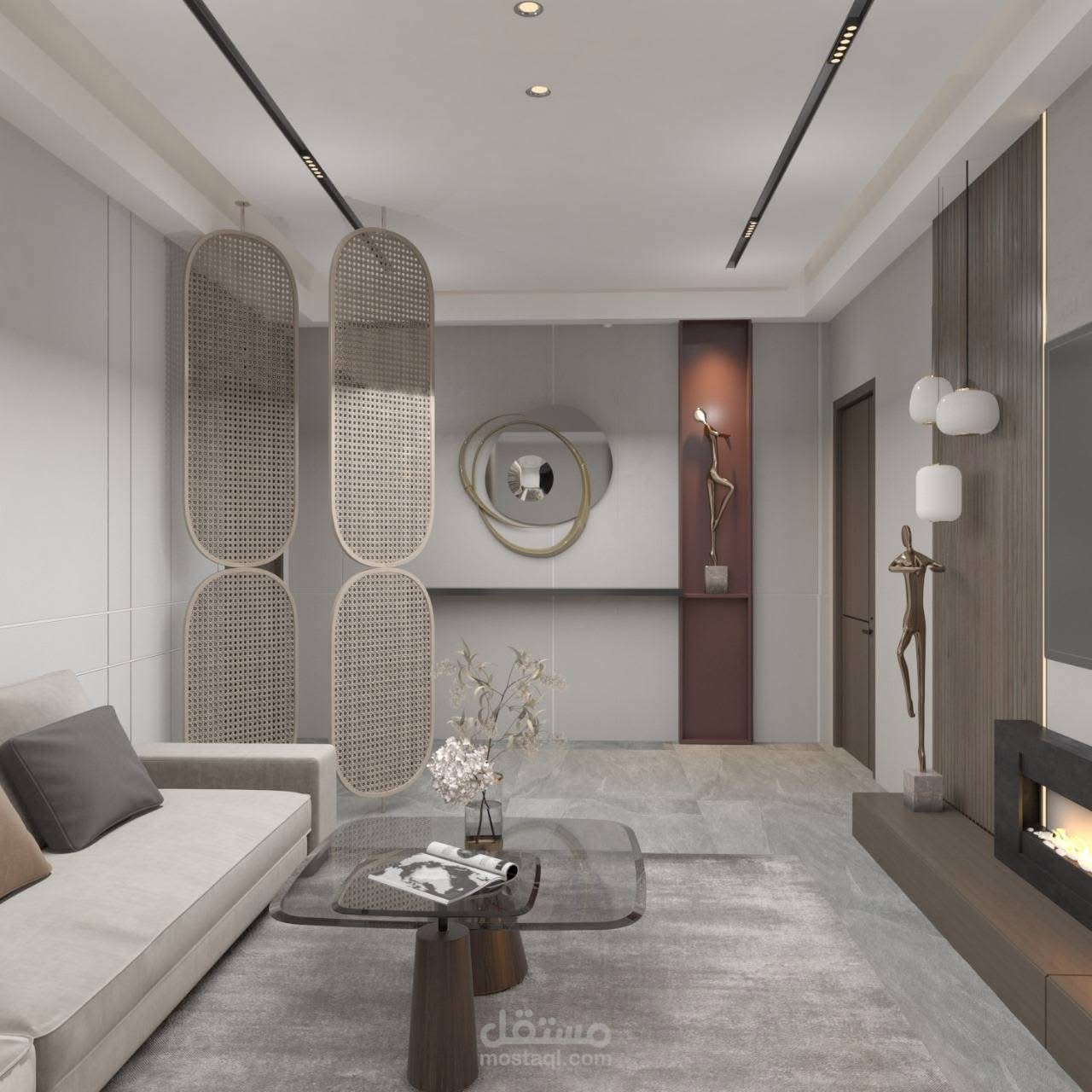 الإضاءة السقفية الخطية مدروسة لتوفير جو مريح، مع أثاث بسيط يحافظ على اتساع الفراغ وطابع عصري أنيق.