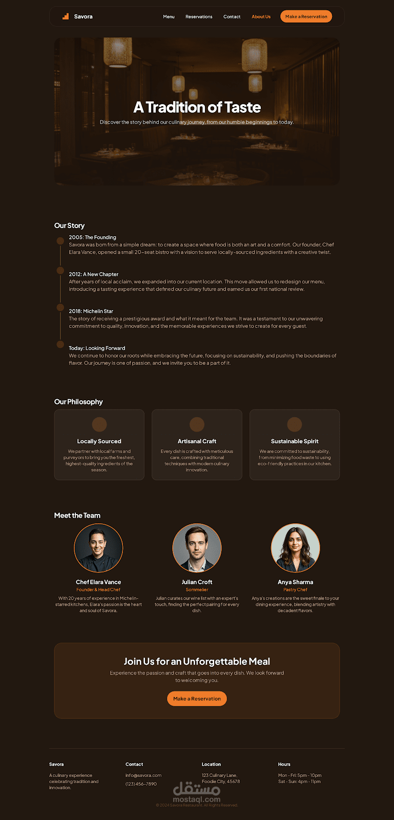 الموقع مصمم بأسلوب بسيط وجذاب يبرز هوية المطعم وقائمة الطعام بشكل واضح وشهي.
